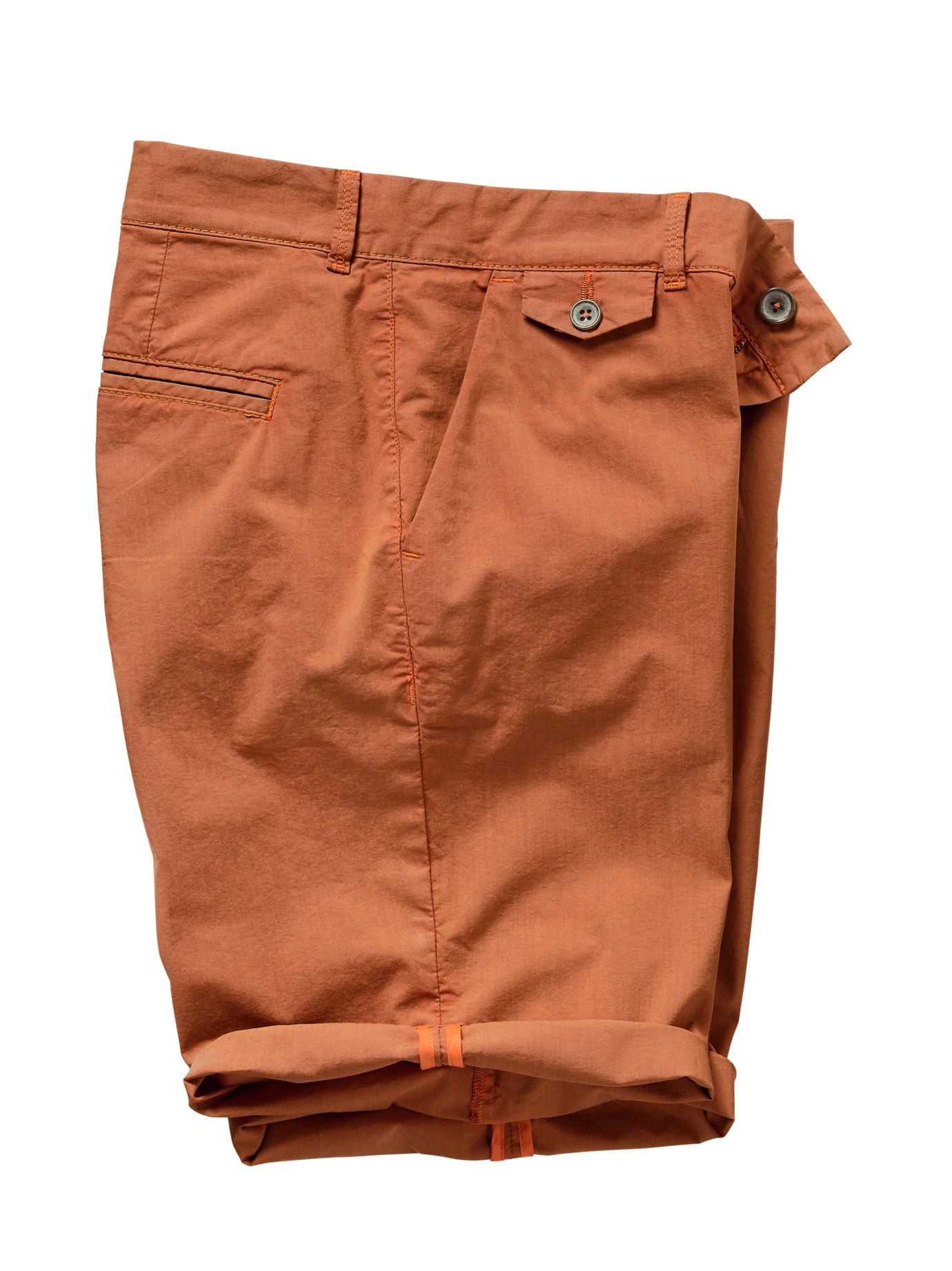 Leicht wie Papier. Diese Shorts ist mit 230 Gramm 45 % leichter als eine aus Jeans. Vom italienischen Traditionsweber Pordenone stammt der papierne Stoff (glatt, matt, raschelnd). In Wahrheit ist es eine Mischung aus Baumwolle und einer Mikrofaser, die ums Dreifache feiner ist als Seide. Ordentlich bequem macht sie Elasthan. Endet knapp oberhalb der Knie, wer mehr will, krempelt und lässt das Einfassband hervorblitzen.