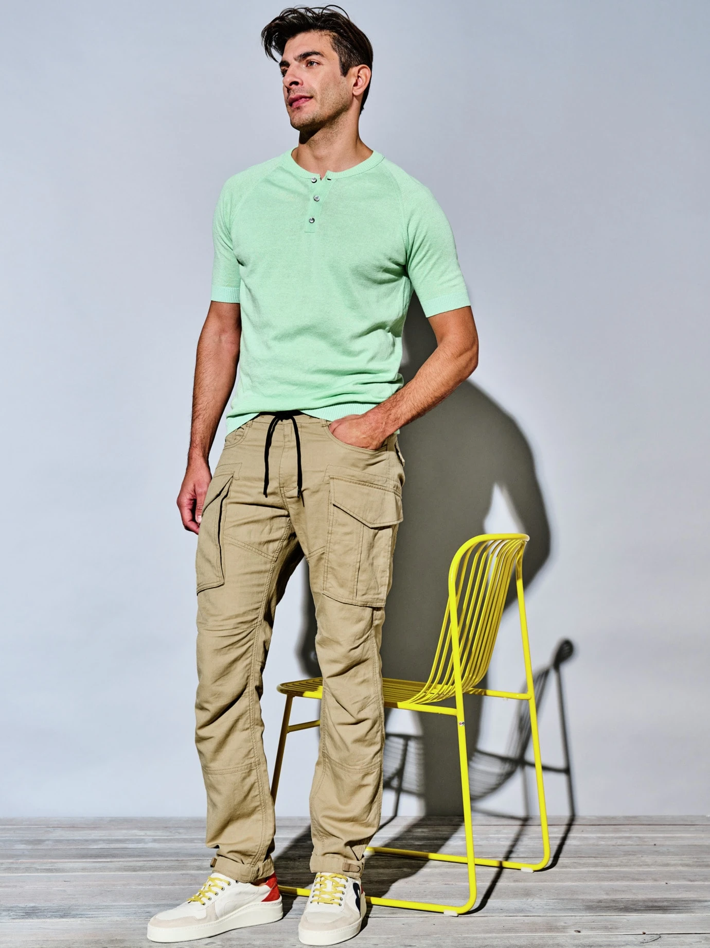 Verarbeitung: Five-Pocket plus zwei Cargotaschen. Gummibund, Tunnelzug, Gürtelschlaufen. Cutlines an Oberschenkeln und Abnäher an Knien für noch mehr Bewegungspielraum. Regular Fit.