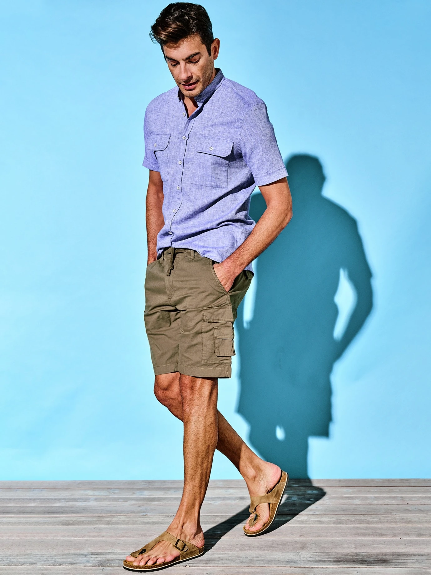 Das Bauhaus würde den Kopf schütteln und doch verkörpert diese Shorts das Prinzip form follows function. Denn sie ist mit ihren Zusatztaschen durchdacht, sitzt perfekt dank Gummizug und Schnitt (lässt das richtige Maß für Bewegung). Genau passend, wenn Sie unterwegs sind, bequem ist sie dann eh. Mit Leinenhemd und Loafer oder sportlicher mit T-Shirt und Turnschuh.