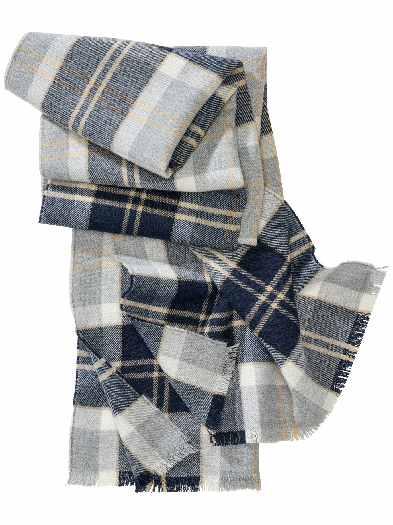Die Helden der Highlands würden ihn noch heute tragen: den Schal des schottischen Woll- und Webspezialisten Johnstons of Elgin1797. Seine feine Merinowolle – die Fasern sind mit 16,5 bis zu 24 Mikrometern nur halb so dick wie normale Wollfasern – ist besonders weich am Hals. Präzise gewebt als Silver Bannockbane, einem der modernsten Tartans. Passt farblich fast immer.