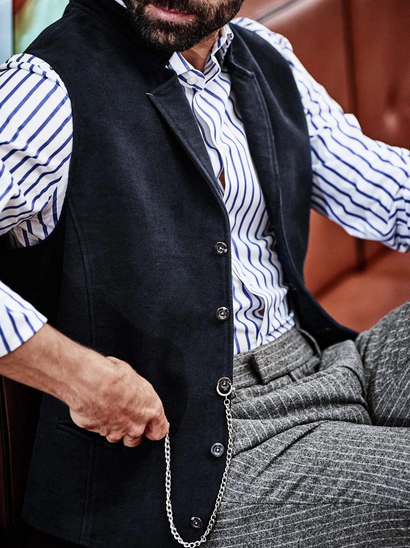 Mehr Aufmerksamkeit fürs Streifenhemd. Ein Streifen ist stets geradlinig und korrekt und überträgt diese Eigenschaften gern auf seinen Träger. Dass dieses Hemd dabei so herrlich unspießig wirkt, liegt an dem großzügigen Abstand der blauen Streifen. Perfekt fürs moderne Business.
