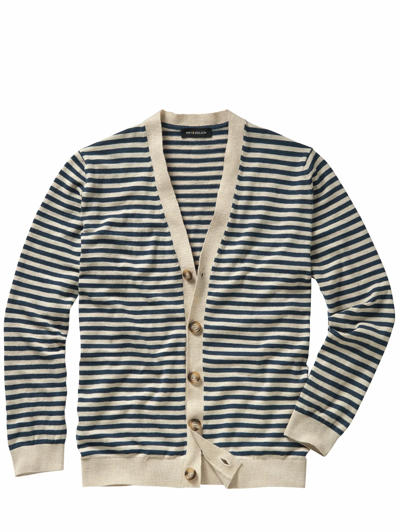 Alleine hat er Trennungsschmerz, arrangiert sich aber dann nach kurzer Zeit auch solo. Designt ist er gemeinsam mit dem gleichnamigen Strickshirt (Nr. 23-4852), mit leicht unterschiedlichem Streifen, damit das Set in Summe männlich wirkt. In feinen Maschen gestrickt, aus einer Mischung, die selbst im Sommer noch Sinn ergibt: viel Baumwolle trifft auf hitzeliebendes Leinen. Dank der Knöpfe in Holzoptik nimmt der Cardigan es auch mit Hemdkombinationen auf. Fällt schön und wird (unbedingt) offen getragen.