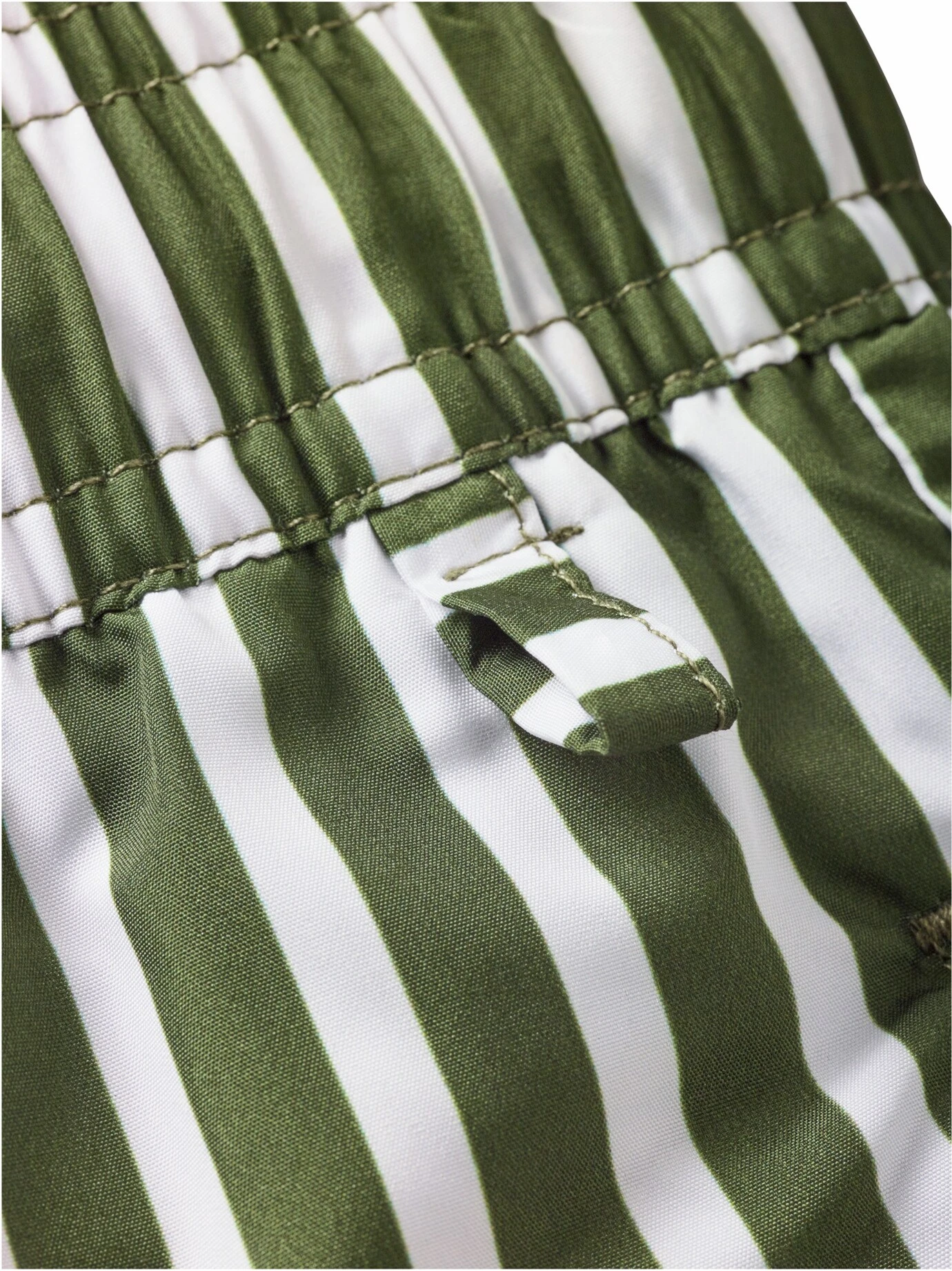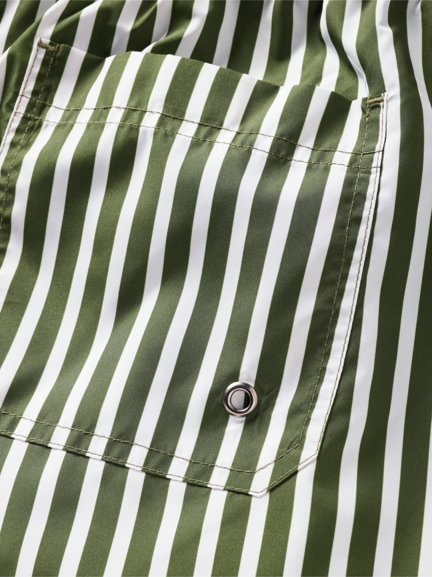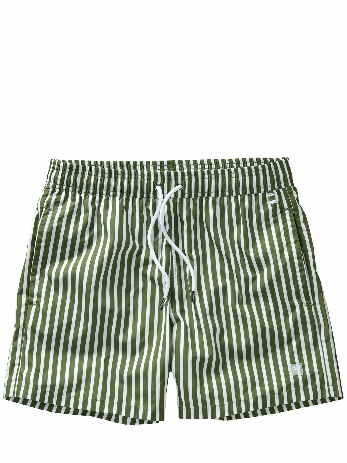 Single-Performer. Sie mit nur einem Kleidungsstück gut aussehen zu lassen, ist eine Stärke der Marke Mey aus Albstadt. Bei dieser Swimshorts sind Längsstreifen das Mittel der Wahl, weil sie heritage sind und eine gute Figur machen (das Auge überschätzt die Länge vertikaler Linien, wodurch der Träger schlanker wirkt). Wechseln nach dem Schwimmen entfällt, weil schnelltrocknend.