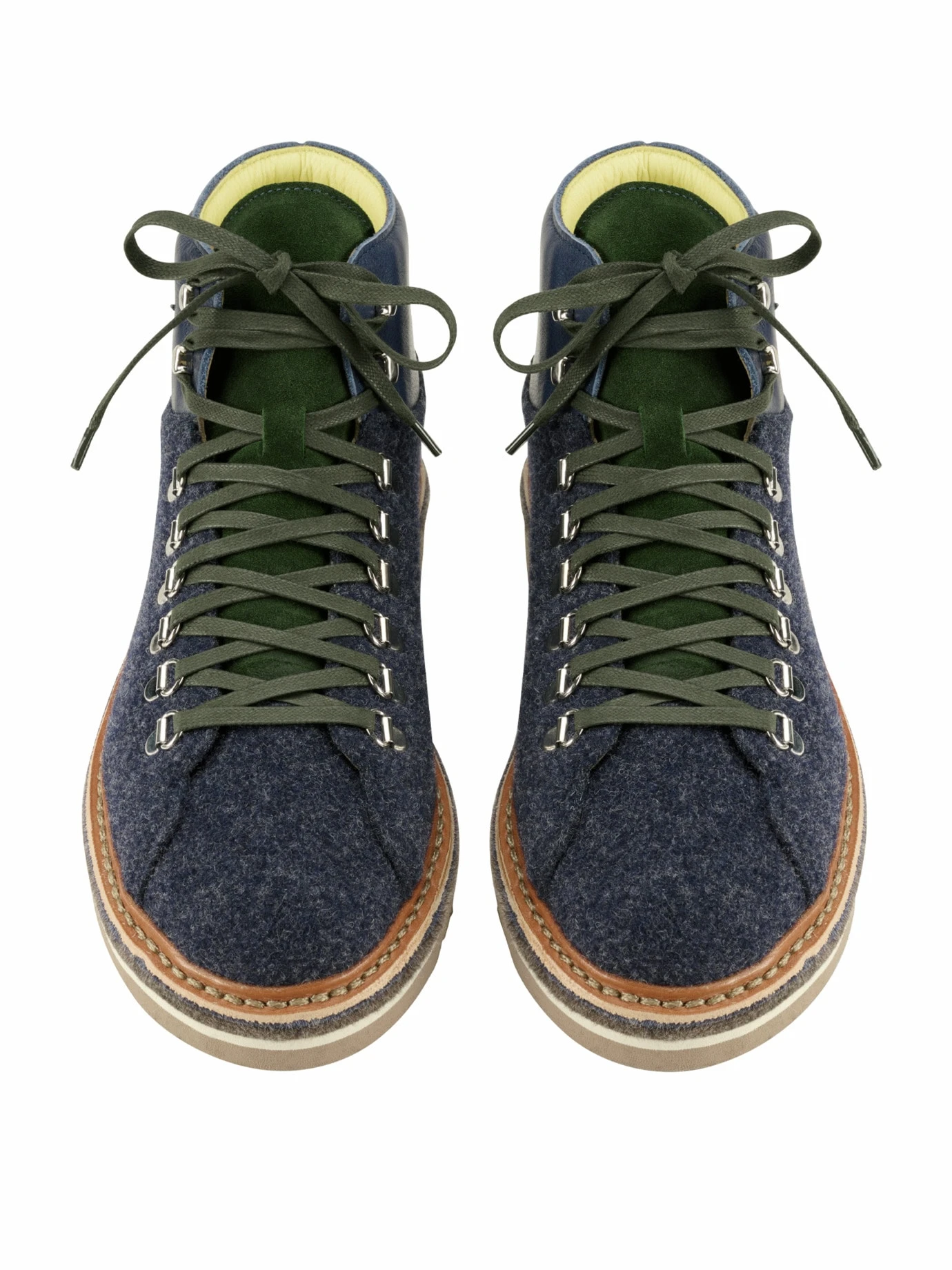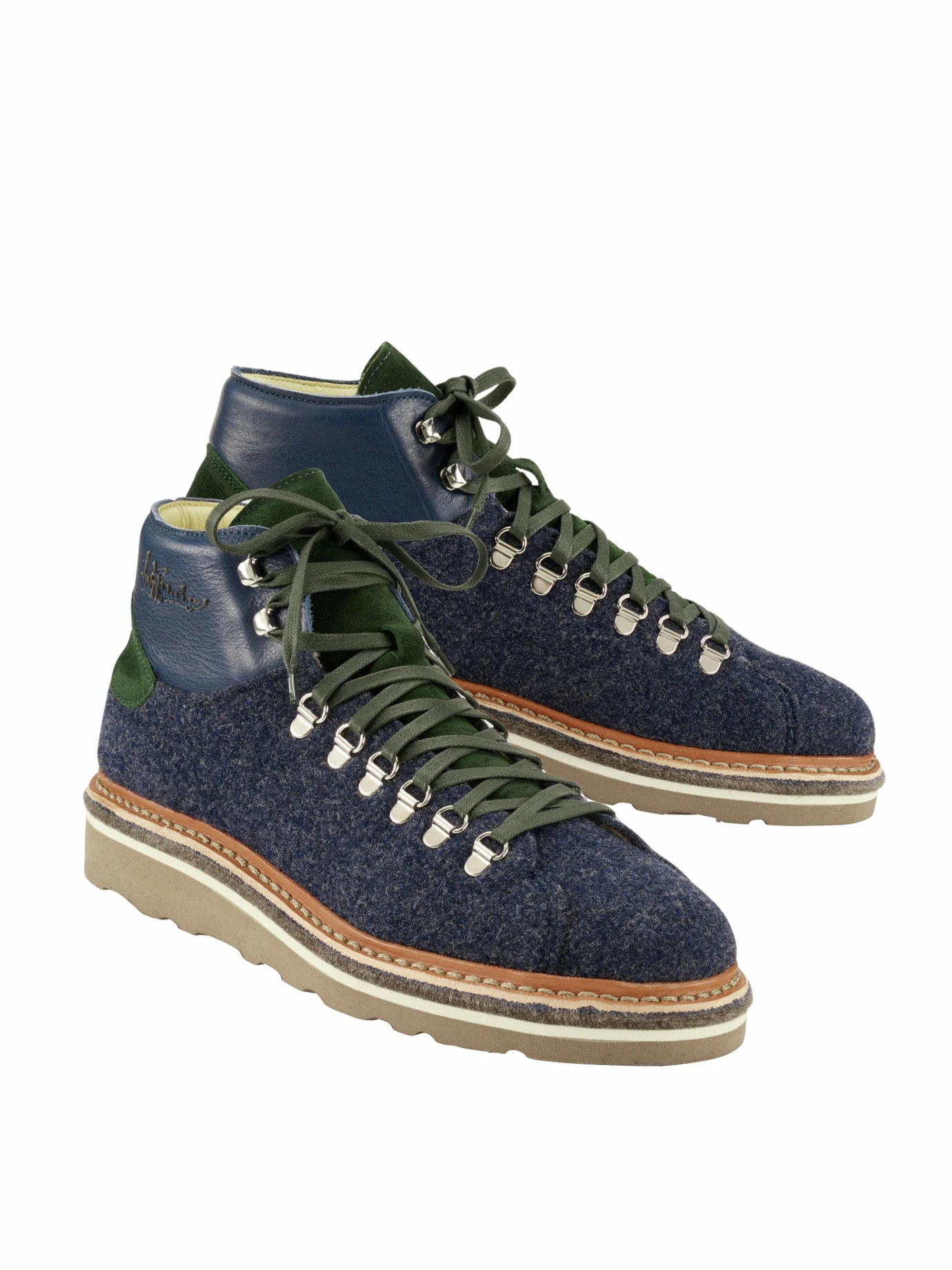 Auf heißen Sohlen war gestern. Der Boot von Luis Trenker im Bergsteiger-Stil mit authentischer Metallösen-Schnürung ist aus klimatisierendem Wollfilz gefertigt, gespickt mit Rauleder an Ferse und Zunge. Bedeutet, er bietet, inklusive der Decksohle, optimale Wärmeisolation bei gleichzeitiger Regulierung von Feuchtigkeit. Der Fuß wird also perfekt belüftet, zudem passt sich das Material hervorragend und ergonomisch den Proportionen an. Hochwertig und haltbar ist die rahmengenähte Profilsohle, handgefertigt in Italien. Andiamo!