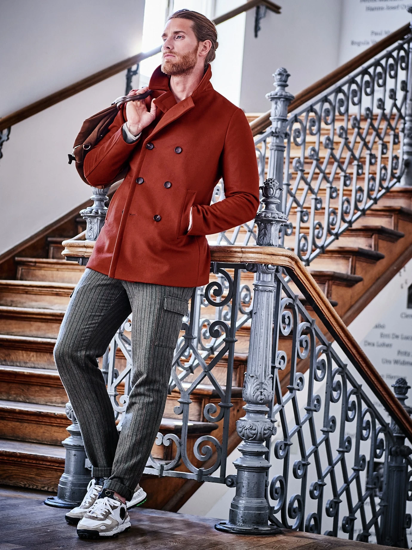 Das Update für den Marineflair. Ursprünglich schützte der Caban auf hoher See, je nach Land hieß er später Reefer, Colani, Pea Coat oder eben Caban. Den seewasserfesten Stoff von einst hat CINQUE eingetauscht. Seine erhabene Mischung stammt vom italienischen Weber, die Wolle schützt nach wie vor vor Kälteeinflüssen, Kaschmir verleiht edle Präsenz. Neu ist auch die Farbe, die bei Jacken eher selten zu finden ist, Licht hervorhebt und im Outfit anregend wirkt. Zusätzlich gefüttert, dazu passen je nach Jahreszeit ein Pullover oder Hemd samt Schal. Nach wie vor beliebt zu Cargohosen.