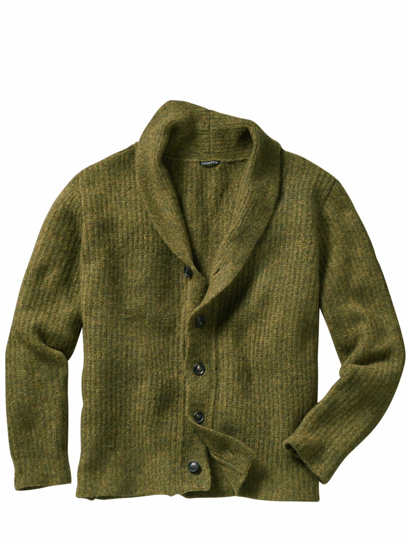 Opas Cardigan trifft neue Woll-Generation. Der Schalkragen, die fetten 3-Gauge-Maschen und der echte Hornknopf sind vom Klassiker inspiriert. Beim Material setzt HANSEN Garments aus Dänemark auf italienisches Kammgarn. Es ist fein, weich und superleicht. Die flauschig gebürsteten Fasern speichern die Körperwärme, wenn der Kamin schon lange aus ist und Ihre Freunde auf dem Sofa die Weißt-du-noch-Anekdoten rauskramen. Der Anteil Hightech verhindert, dass der Cardigan ausleiert, Elasthan macht ihn beweglich genug fürs urbane Leben. Der satte Grünton überdauert jeden Trend.
