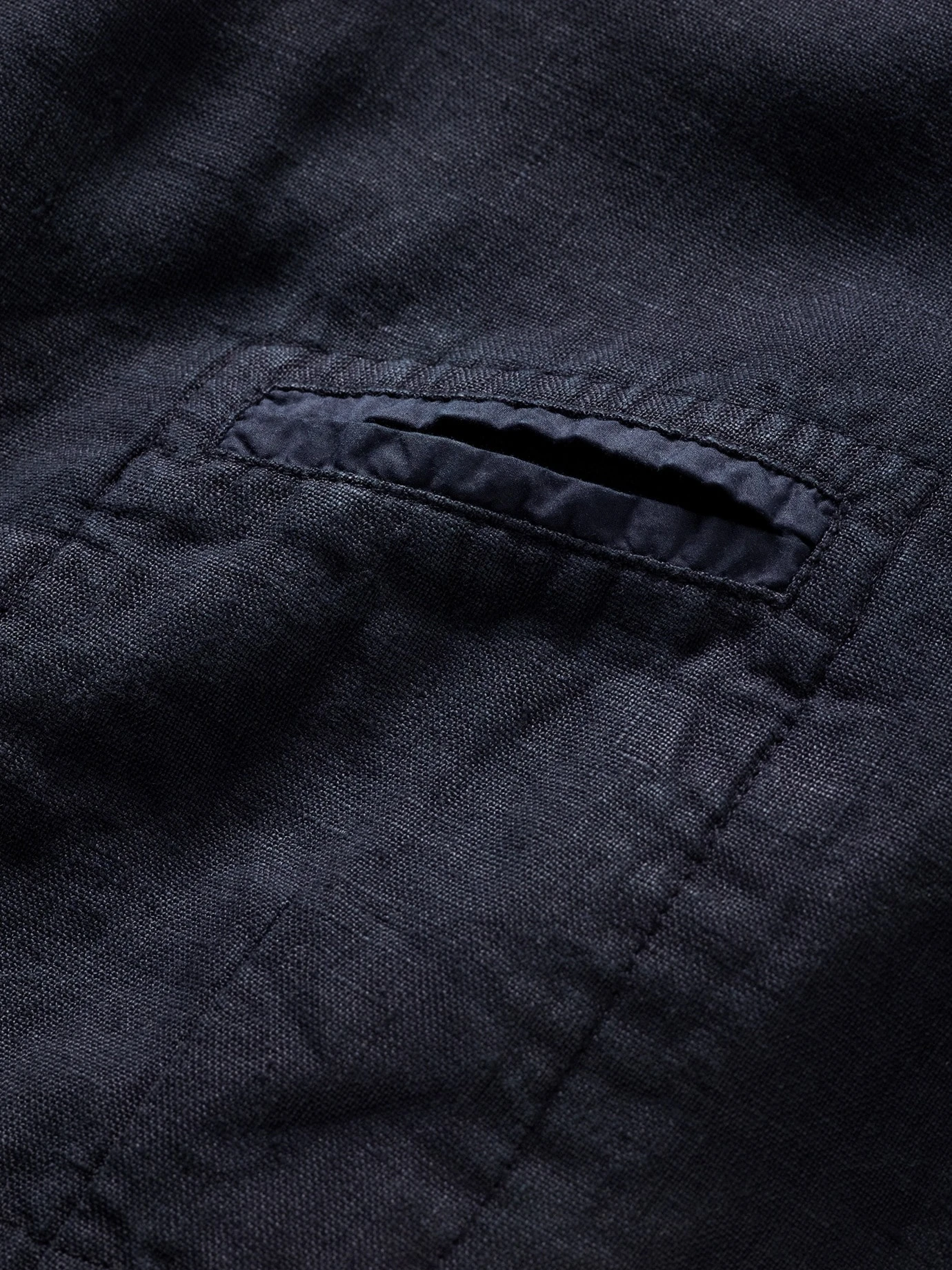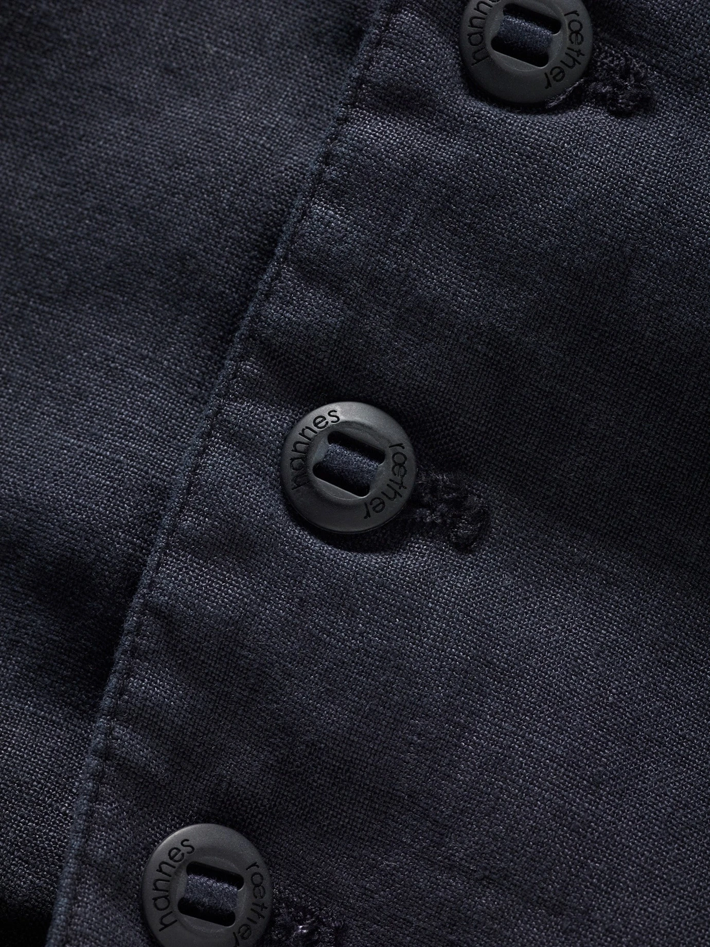 Form follows function. Und die Form dieser Weste der Leinenfaser. Das Leinen stammt aus Flandern, Belgien, einer Region für weltweit beste Leinen-Qualitäten, wie sie selten noch zu finden sind. Die Fasern werden nicht hart, sondern sanft gespannt, wodurch sie sich ihre leicht kräuselnde Form bewahren und den Charakter dieser Weste prägen. Ansonsten ist die Verarbeitung so schlicht und hochwertig, wie Sie es von hannes roether kennen, mit den kleinen Details, die es für sein unverwechselbares Design braucht: acht Knöpfe, eine niedrig sitzende Brusttasche und ein minimal kontrastierender Rücken aus reiner Baumwolle. Dazu zwei Paspeltaschen.
