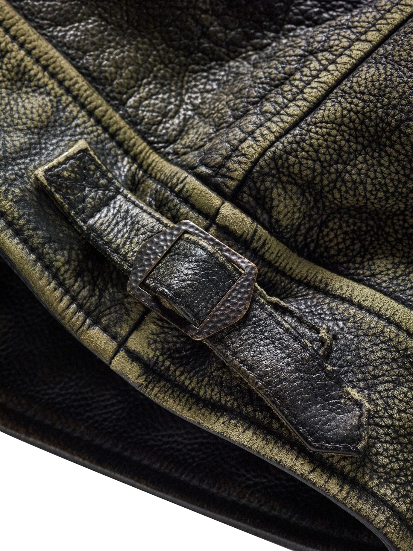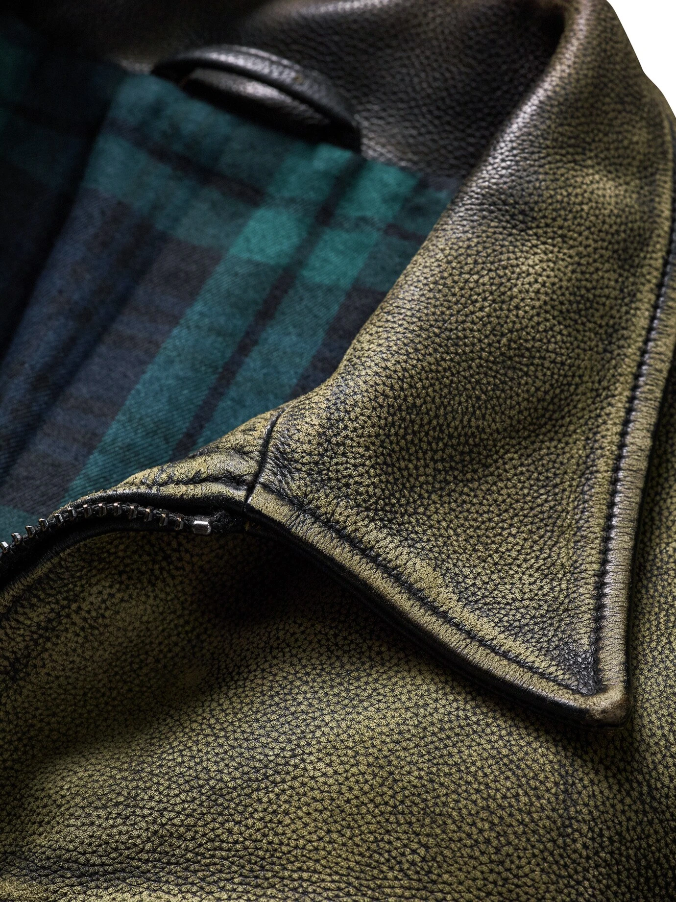 Geschichtsbuch zum Anziehen. Man sieht ihr an, was sie durchgemacht haben muss. Abseits eingefahrener Wege. Wiederbelebt wurde sie mit der Wurzelbürste, die ihre Spuren in dem dicken, gewaschenen Rindleder hinterlassen hat. Das selten schöne Oliv-Spektrum reicht von den Wrinkels in den dunklen Ellbogen bis zu den hellgeschrubbten Schultern. Das Beste hat dieses 1,85-Kilogramm-Exemplar von Rindlederjacke noch vor sich. Möglicherweise mit Ihnen. Das könnte der Anfang einer Freundschaft auf Lebenszeit sein, in der Ihre Geschichte sichtbar fortgeschrieben wird.