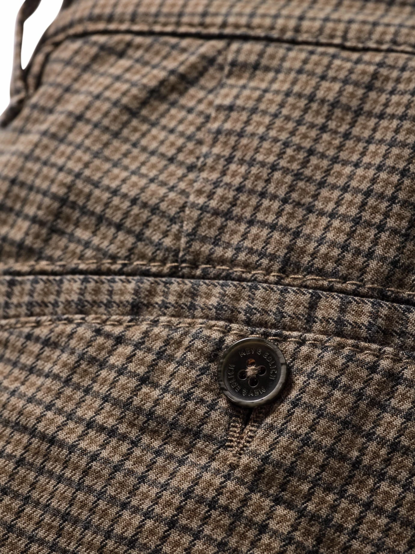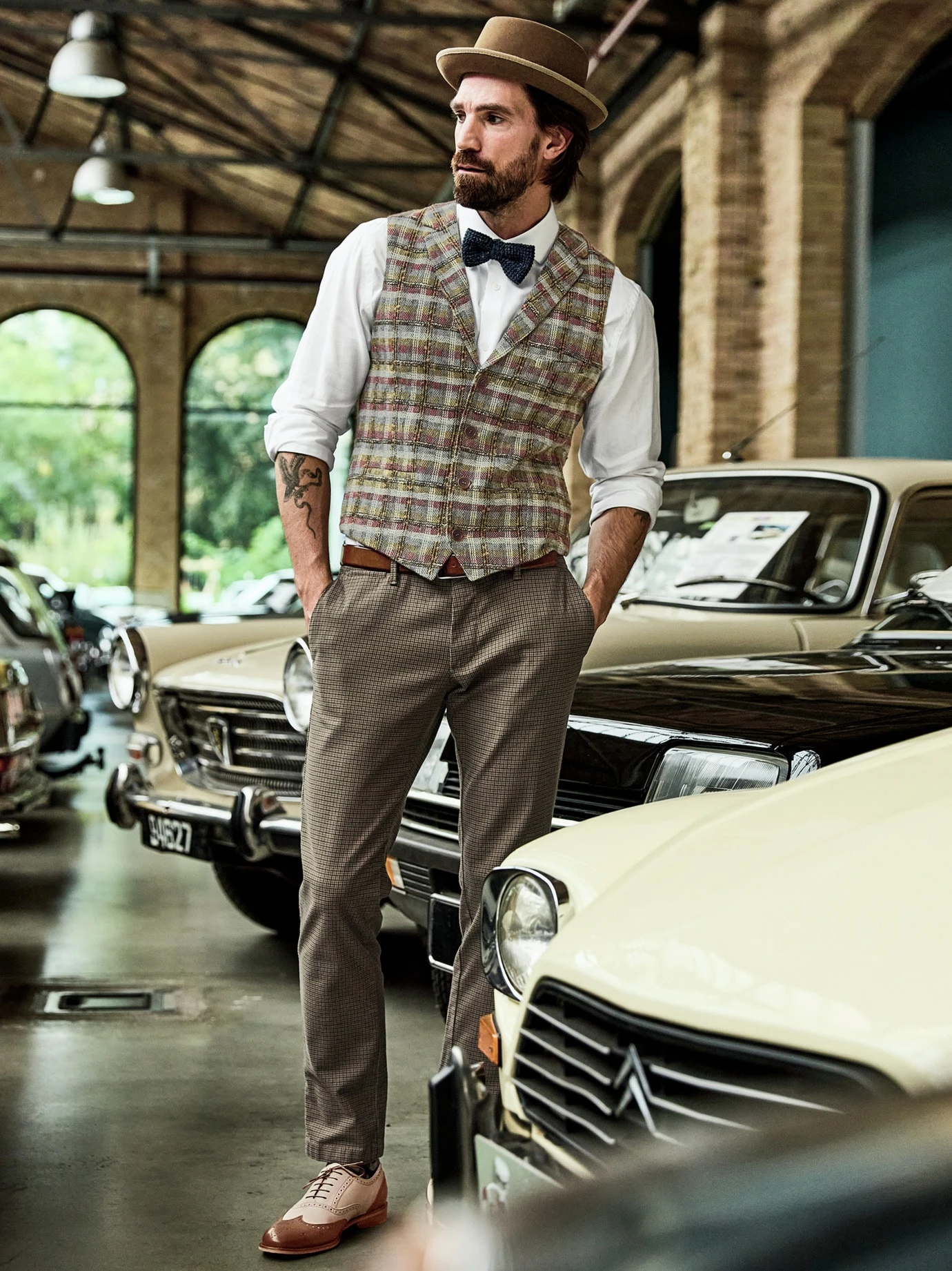 Mit ungewohnter Kombinationsstärke. Während die meisten gemusterten Hosen sich in den Vordergrund des Outfits drängen, stielt diese Hose mit ihrem feinen Hahnentritt die gesamte Farbpalette ein, Mutige wählen sogar ein gestreiftes Shirt dazu. Ihre Form ist schmal, nicht hauteng, umspielt lässig das Bein und bleibt an langen Tagen bequem. Die fest gewebte, weiche Bio-Baumwolle ist auch nach langem Sitzen nicht lappig, durchs Polyacryl leiert sie nicht aus und trägt sich leicht.