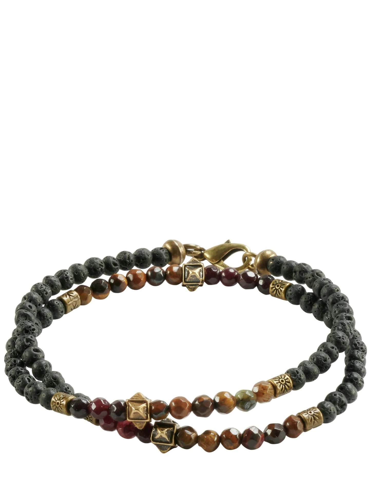 Abenteuerlust fürs Handgelenk. Lavasteinen und dem Edelstein Tigerauge sagt man eine gewisse energiebringende Wirkung nach. Ob was dran ist, darüber wagen wir nicht zu diskutieren. Sicher aber ist, die Steine machen als Männerschmuck richtig was her. Aufgefädelt auf soliden Angeldraht, zweimal ums Handgelenk gewickelt, solo oder neben der Armbanduhr. Zu Badeshorts, Jeans und T-Shirt oder zum Anzug.