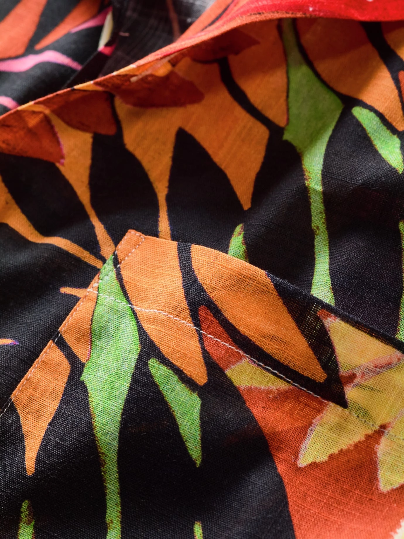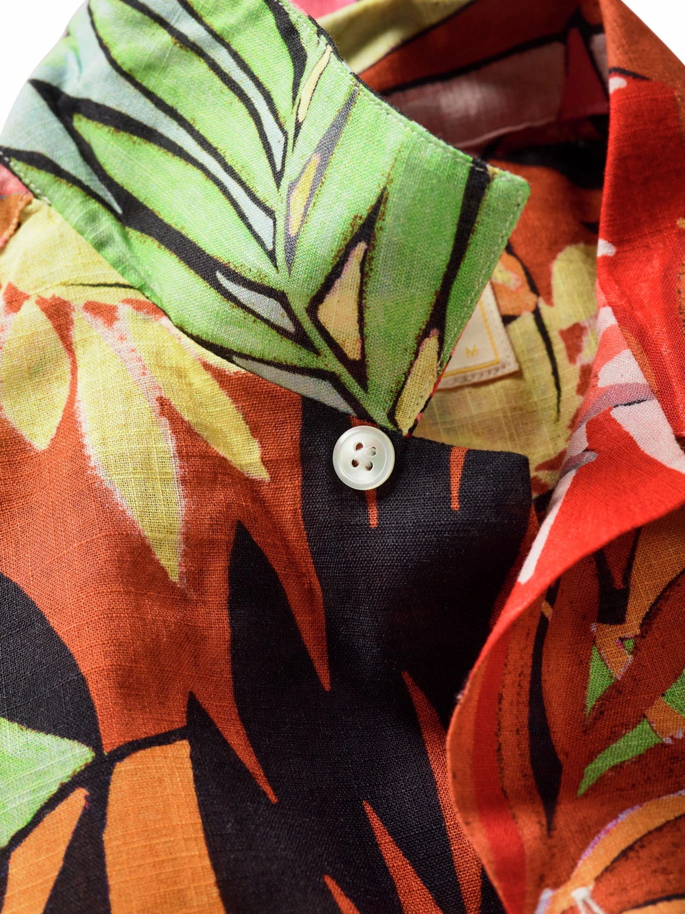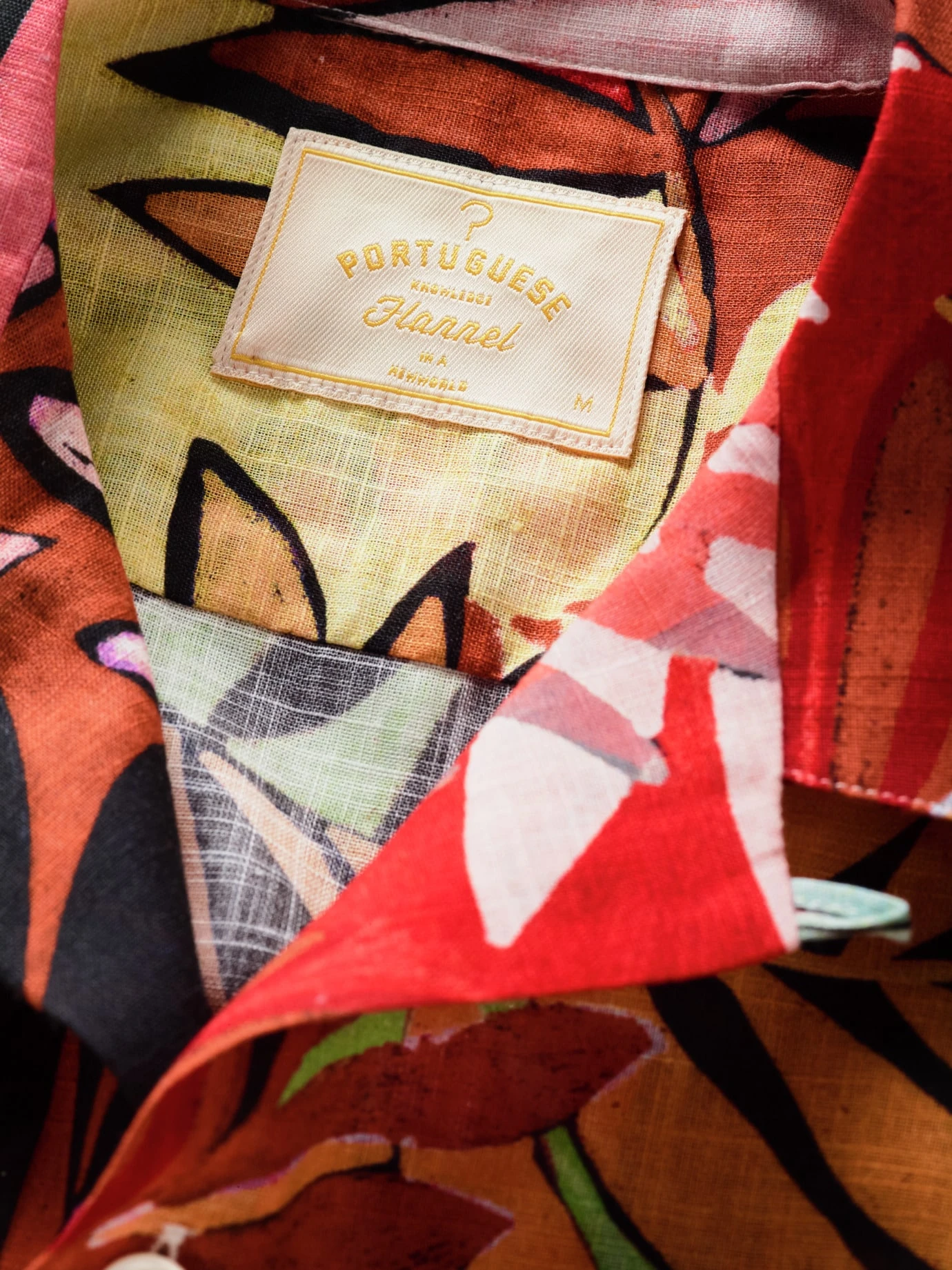 Geprägt vom „Zugang zu einer Reihe von Stoffen, die unbeschreiblich sind“, so António Magalhães, der gemeinsam mit seinem Bruder Portuguese Flannel führt. Die Farben der stilisierten Blätter sind energiegeladen. Den Grund liefert die Basis: In Portugal wird ausschließlich langstapelige Baumwolle vernäht. Nur knapp 7 % entsprechen weltweit dieser Qualitätsstufe, sie ist deutlich feiner – Sie erkennen es daran, dass Ihre Haut leicht durchschimmert – und absolut widerstandsfähig. Das Hemd übersteht damit zig Sommer und liefert den Look, dazu reicht schon eine Chino oder Shorts in einer der Hemdenfarben.