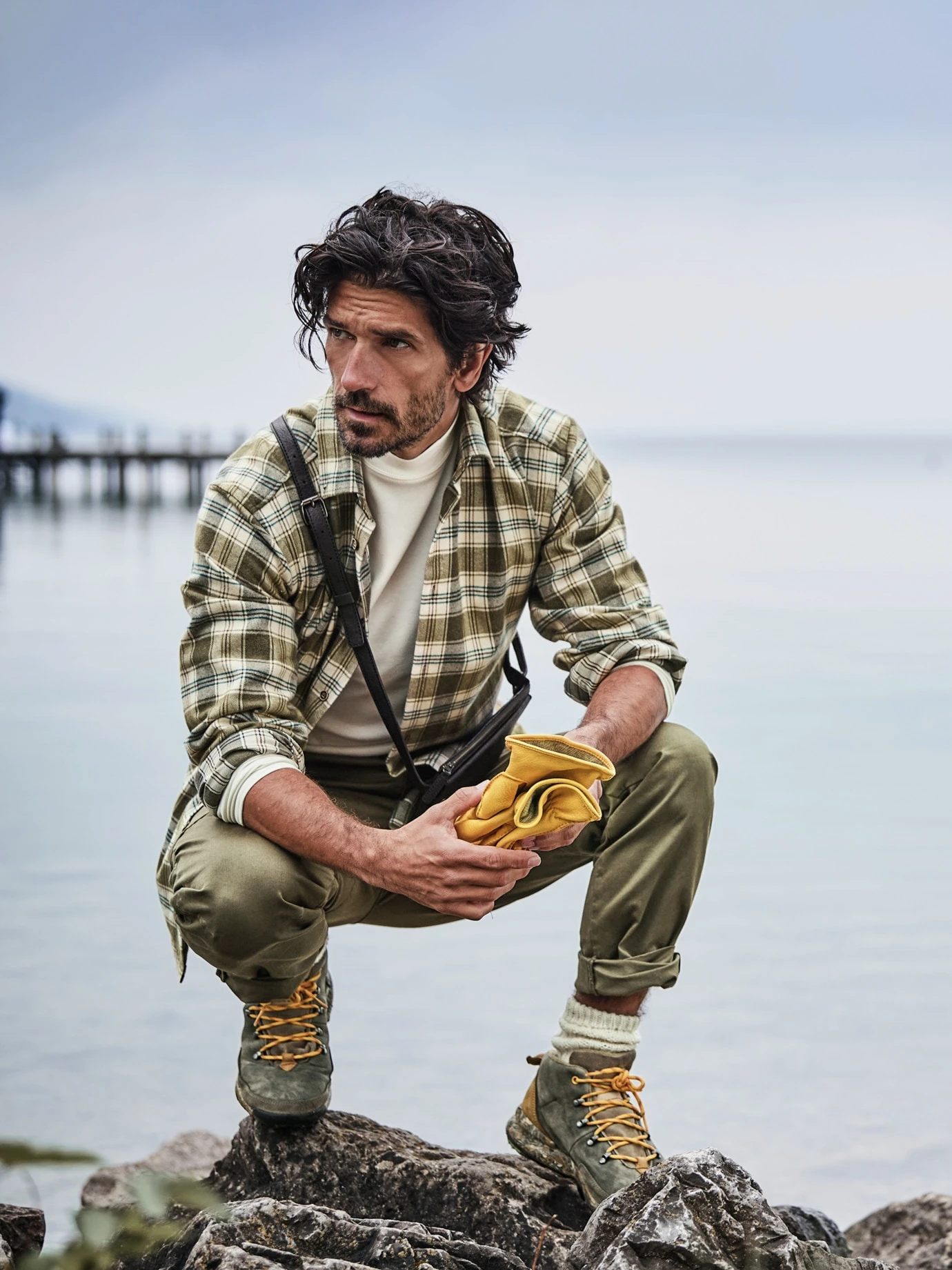 Das Tiefenentspannte. Ein Flanellhemd, als sei es der Bergwelt entsprungen. Botschaft von diesem: ab ins Grüne. Mit seinen moosigen Tönen ist es perfekt für einen Tag auf der Alm, zum Wandern & Wiesnwälzen mit Gänseblümchen zwischen den Zähnen. Tragen Sie es je nach Wind und Wetter im Schichtbetrieb mit T-Shirt drunter oder Weste drüber. Einmal warmgelaufen dürfen Sie es auch streckenweise an den Rucksack hängen. Genauso schön, nur anders: die Flanellhemden Alpenglühen und Wanderlust.