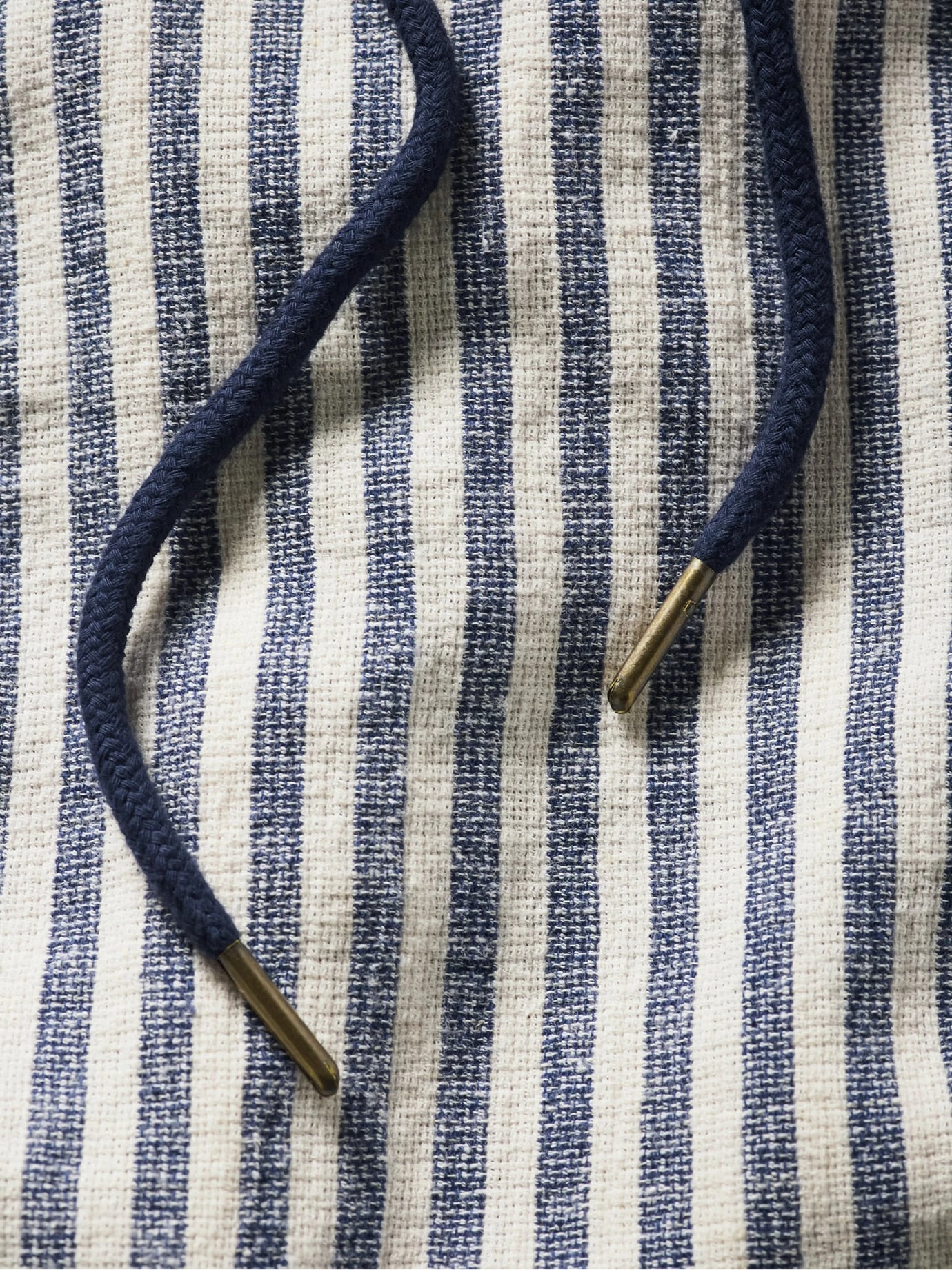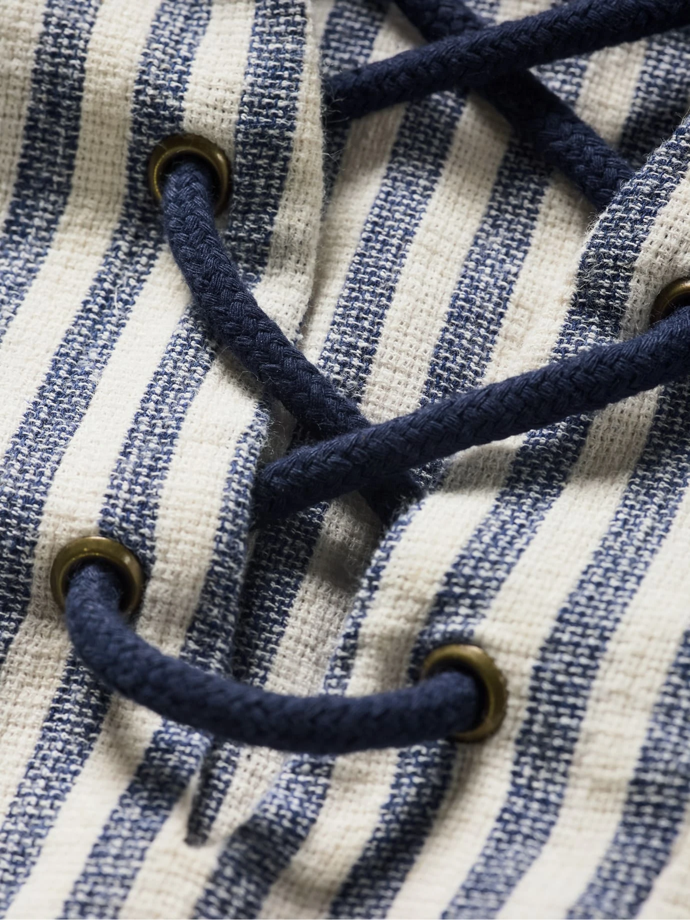 Weil es sich damit besser erobern lässt. Dieses Hemd hat genau den richtigen Schnitt, um Sie bei ausladenden Bewegungen angemessen bedeckt zu halten. Von der Idee her ein Schlupfhemd, mit viel Spielraum dank Seitenschlitzen und einer Kapuze, die bei Windstärke 2 gut am Kopf liegt. Die Knopfleiste weicht einer sogenannten Drawstring-Schnürung, die den richtigen Platz am Hals lässt. Weil auf hoher See die Sonne stärker knallt, gefertigt aus griffigem Baumwoll-Leinen-Stoff. An Bord zur Badebuxe, an Land zu Shorts.