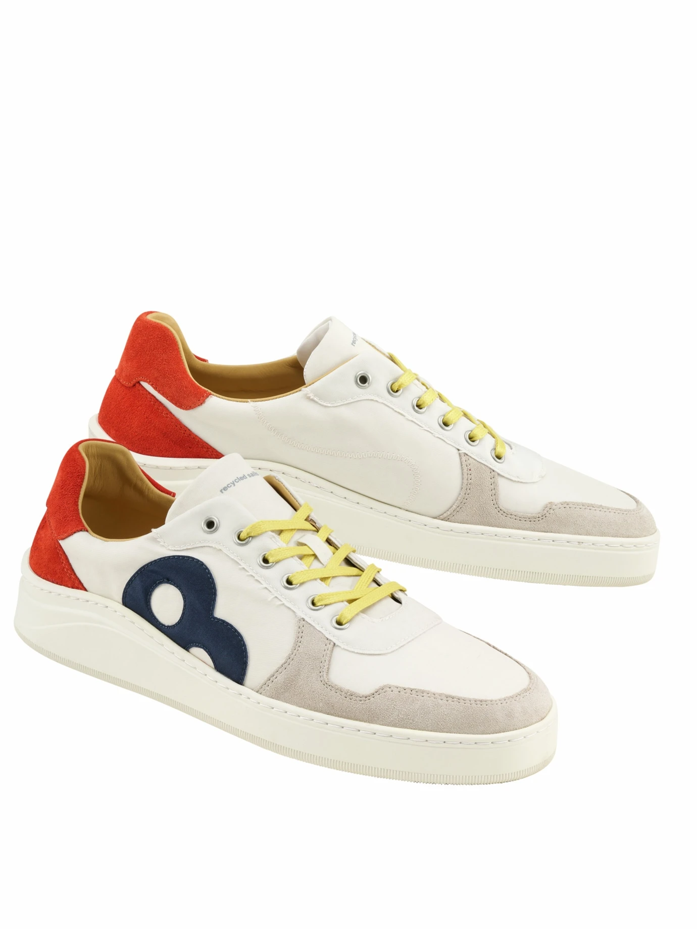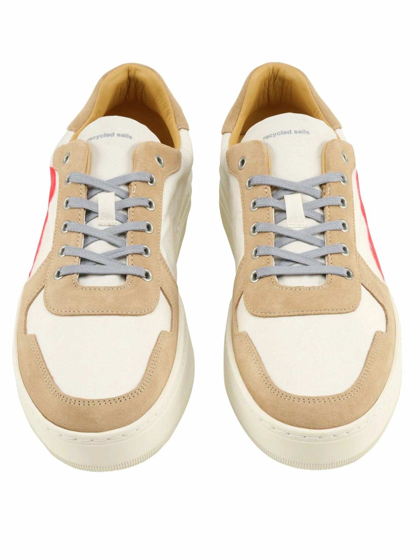 Pure Windstärke. Ein großer Teil dieser Sneakers war bis vor kurzem noch auf Plattbodenschiffen und Holzbooten im Einsatz. Als Segel trotzte das Material in den Wattenmeeren der Nordsee und im Ärmelkanal dem Wind, der Gischt und der salzigen Meeresluft. Der Rest stammt aus geretteten Rettungswesten (8), frischem Naturkautschuk (Laufsohle) und pflanzlich gegerbtem Rindleder (aus Europa). Klare Kante für die Umwelt! Was auch immer Sie im Sturm erobern wollen, das sind die passenden Sneakers dazu.