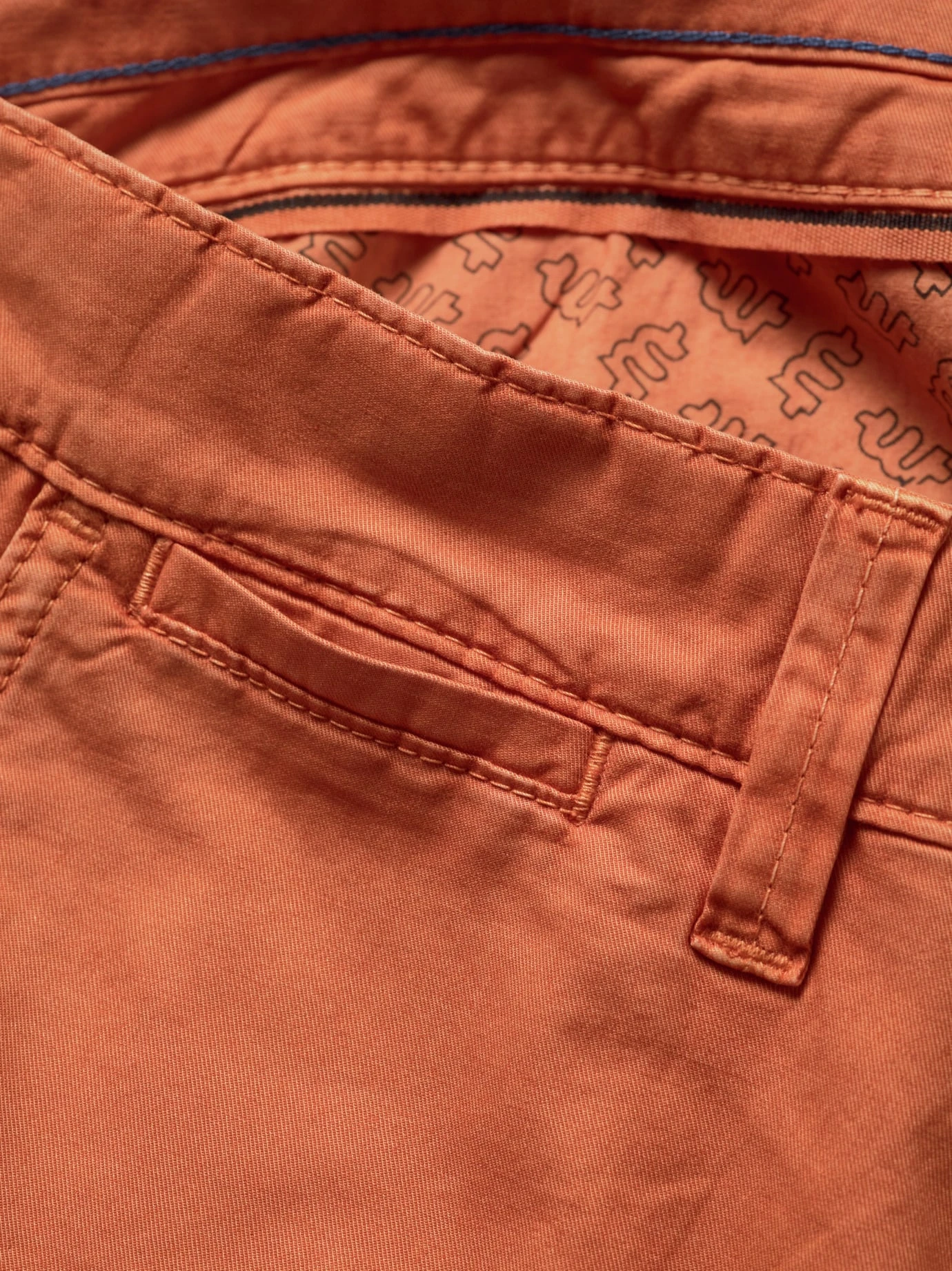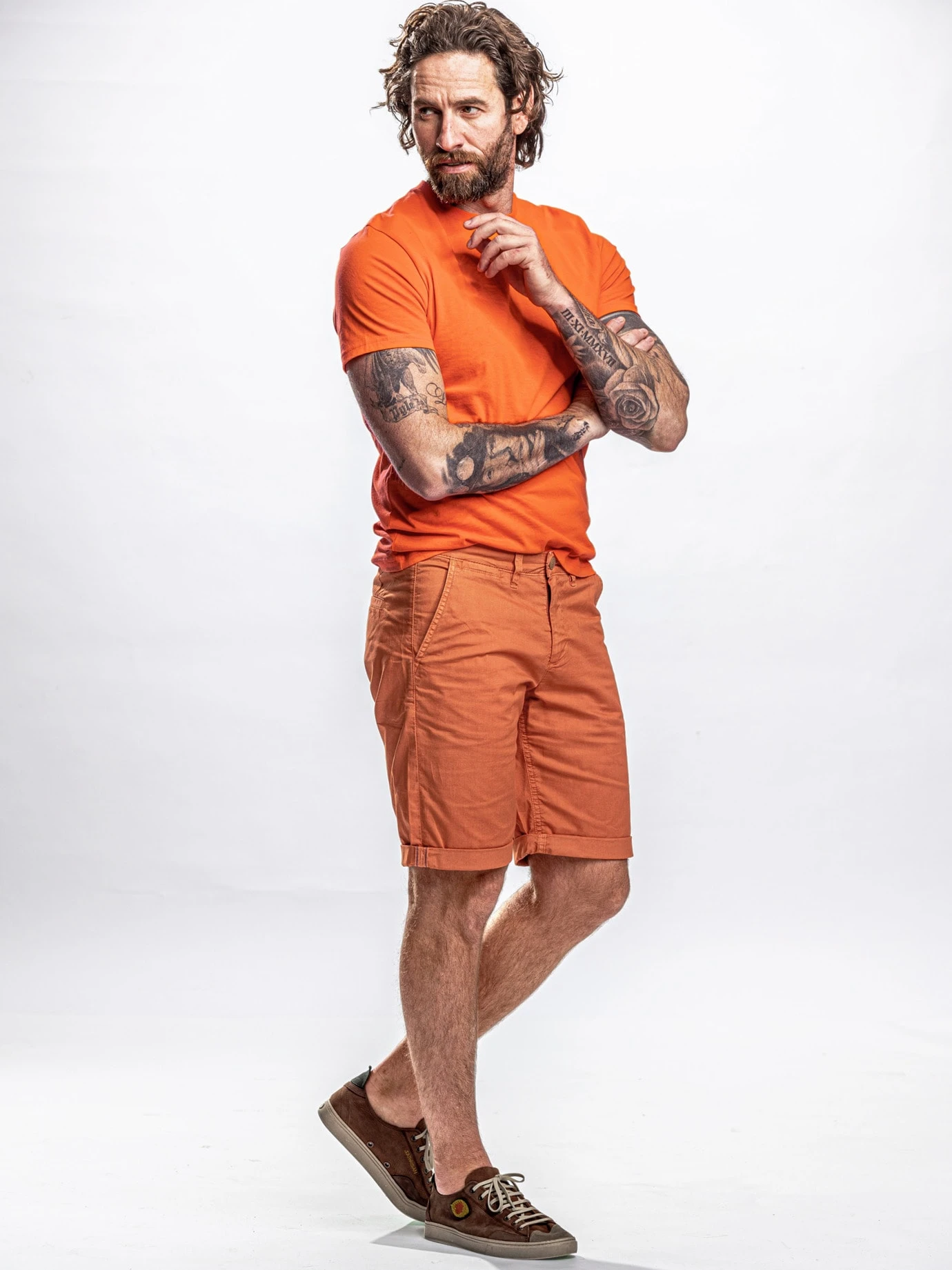 Das Rundum-sorglos-Shorts-Paket. Die weiche Baumwolle fühlt sich gut am Bein und im Gewissen an, der Elasthananteil für die Flexibilität punktet beim Burgenbauen und Muschelsuchen. Die Shorts ist auf die perfekte Länge vorgekrempelt und endet handbreit über dem Knie. Die leiser gedrehten Farben ermöglichen ihr mit Hemd und Ledergürtel den Sprung vom Strand zur Gartenparty.