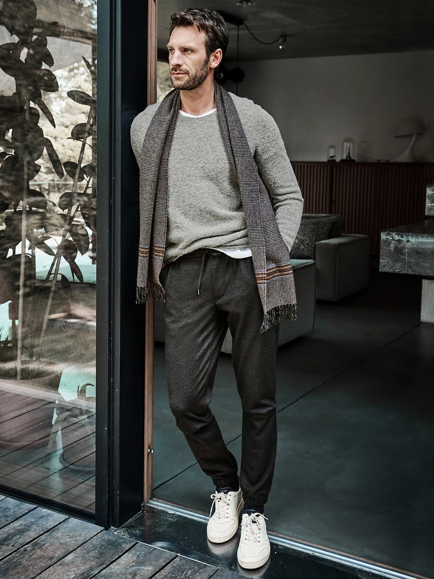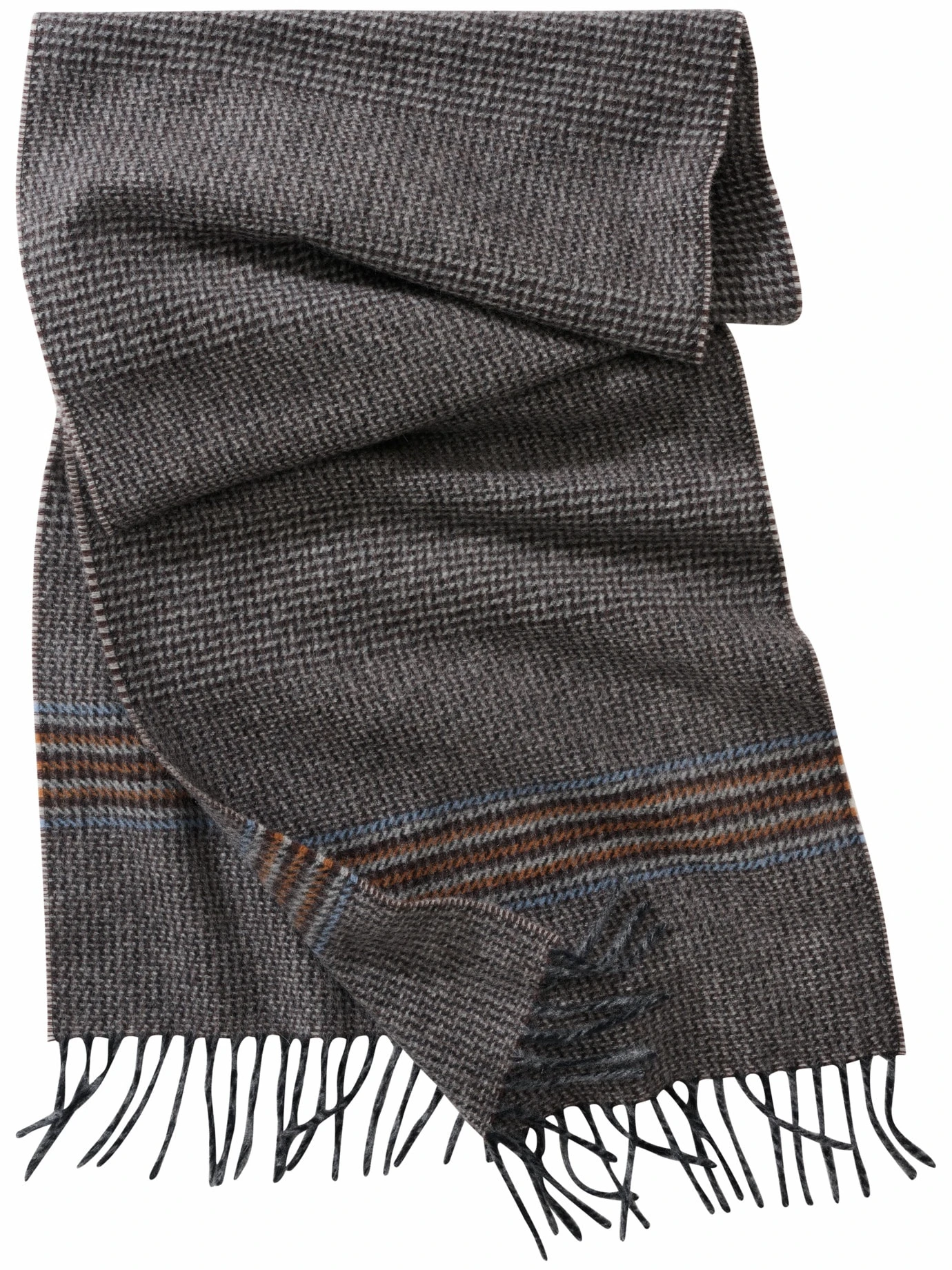 Ein Stück, das man weitergibt. Der fein karierte Schal aus luxuriösem Kaschmir mit gedrehten Fransen ist (fast) ein klassisches Kleinod und hängt vermutlich nie lang am Garderobenhaken, da er Suchtgefahr am Hals auslöst. Die farbigen Akzentstreifen an den Enden enttarnen ihn als Neuigkeit. Und machen ihn wunderbar kompatibel – sogar zur Jeansjacke, zum Wollmantel sowieso.