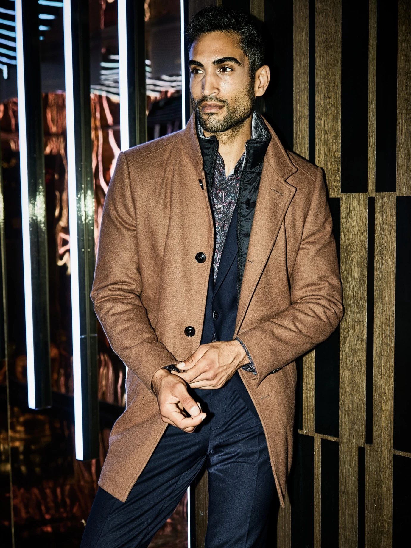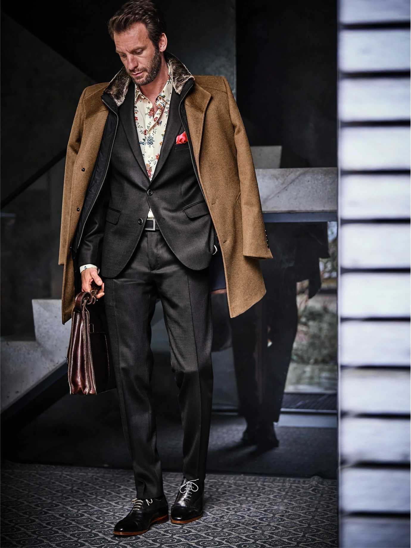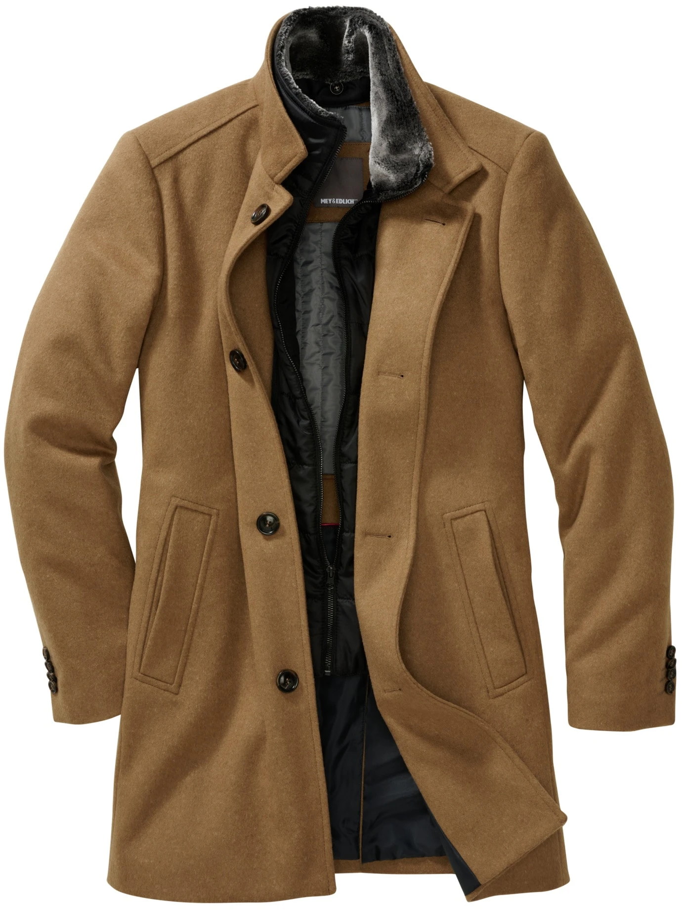 Wenn Luxus eine Farbe trägt. Er basiert auf dem kamelfarbenen Mantel, wie ihn in den 1980ern die Mode forciert. Seine Länge, die knapp übers Knie reicht (Rückenlänge: 89 cm), der große Kragen und die breite Schulterpartie sind geblieben. Dieser Mantel ist heute besser. Er ist gearbeitet aus italienischem Wollstoff, mit einem Anteil technischer Fasern, die Pilling vorbeugen. Dadurch sieht er selbst nach Jahren gut aus, bleibt fest und isolierend. Darüber hinaus trägt er einen herausnehmbaren Westeneinsatz (als Schalersatz), sein (Kunst-)Fell wärmt den Hals. Noch immer zum Anzug, ansonsten schön zur Chino oder Jeans.