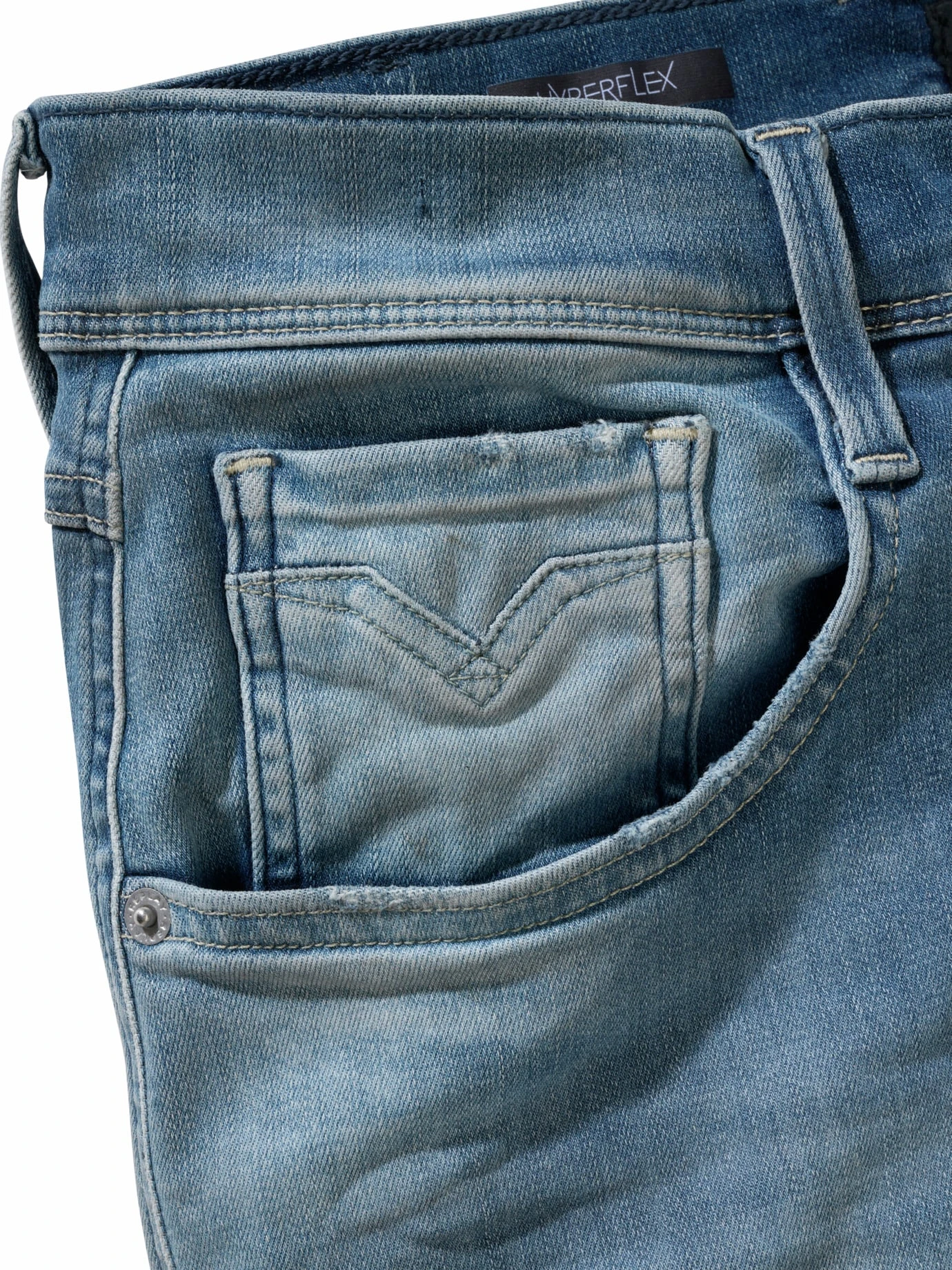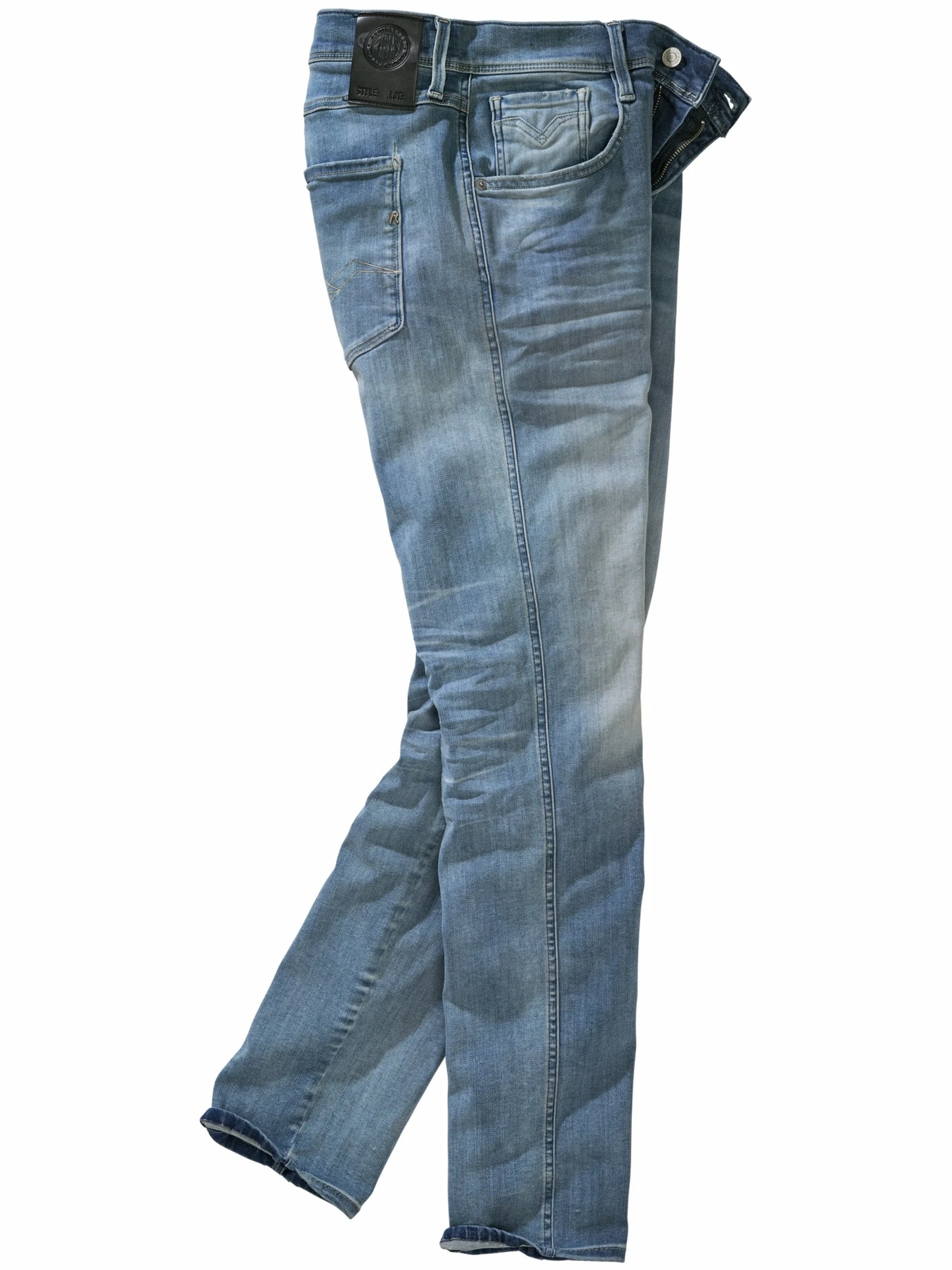 Sorgfältig durchdacht bis in die letzte Faser. Die Denim-Spezialisten von Replay haben den leichten 10-oz-Denim genau so viel vorgewaschen, dass er eingelebt, aber nicht abgeranzt aussieht. Der Polyesteranteil und der Schuss Elasthan sind exakt berechnet, um der Jeans die nötige Stretchpower für Fahrrad-Sprints und Tretboot-Touren mitzugeben. Die Jeans wird zum Bein hin schmaler, sie sitzt knackig ohne einzuengen.