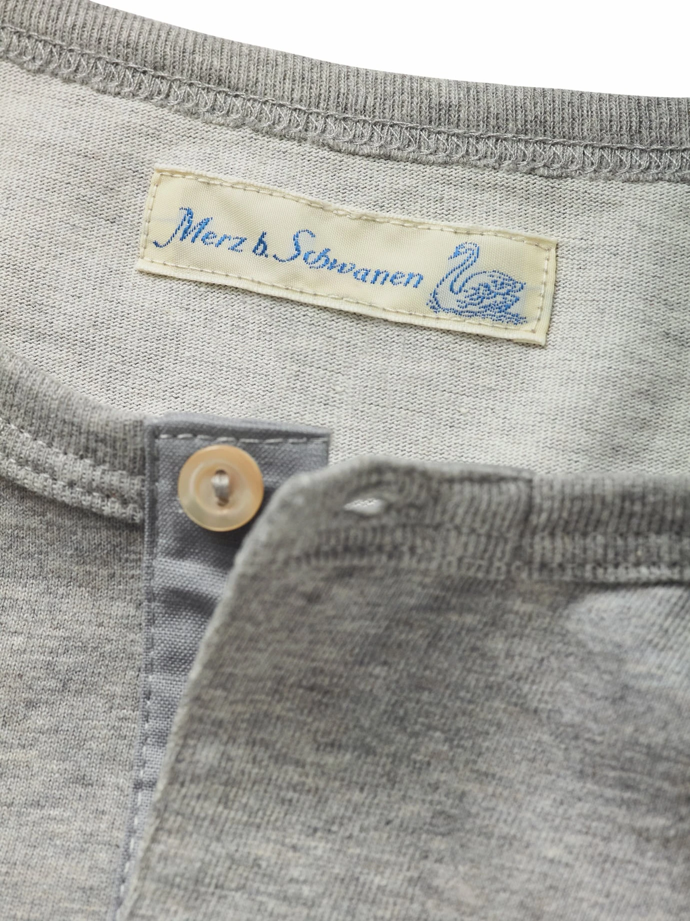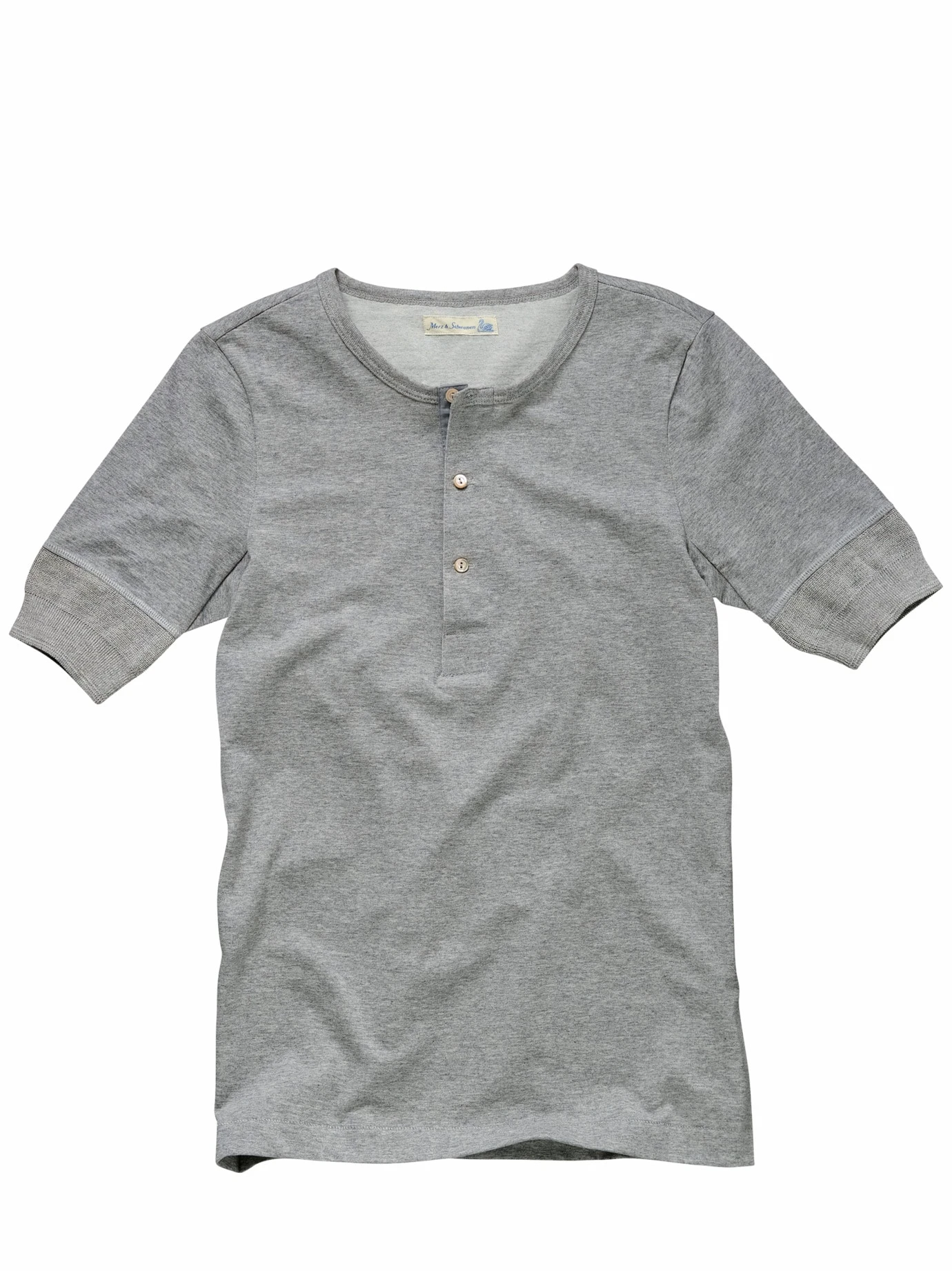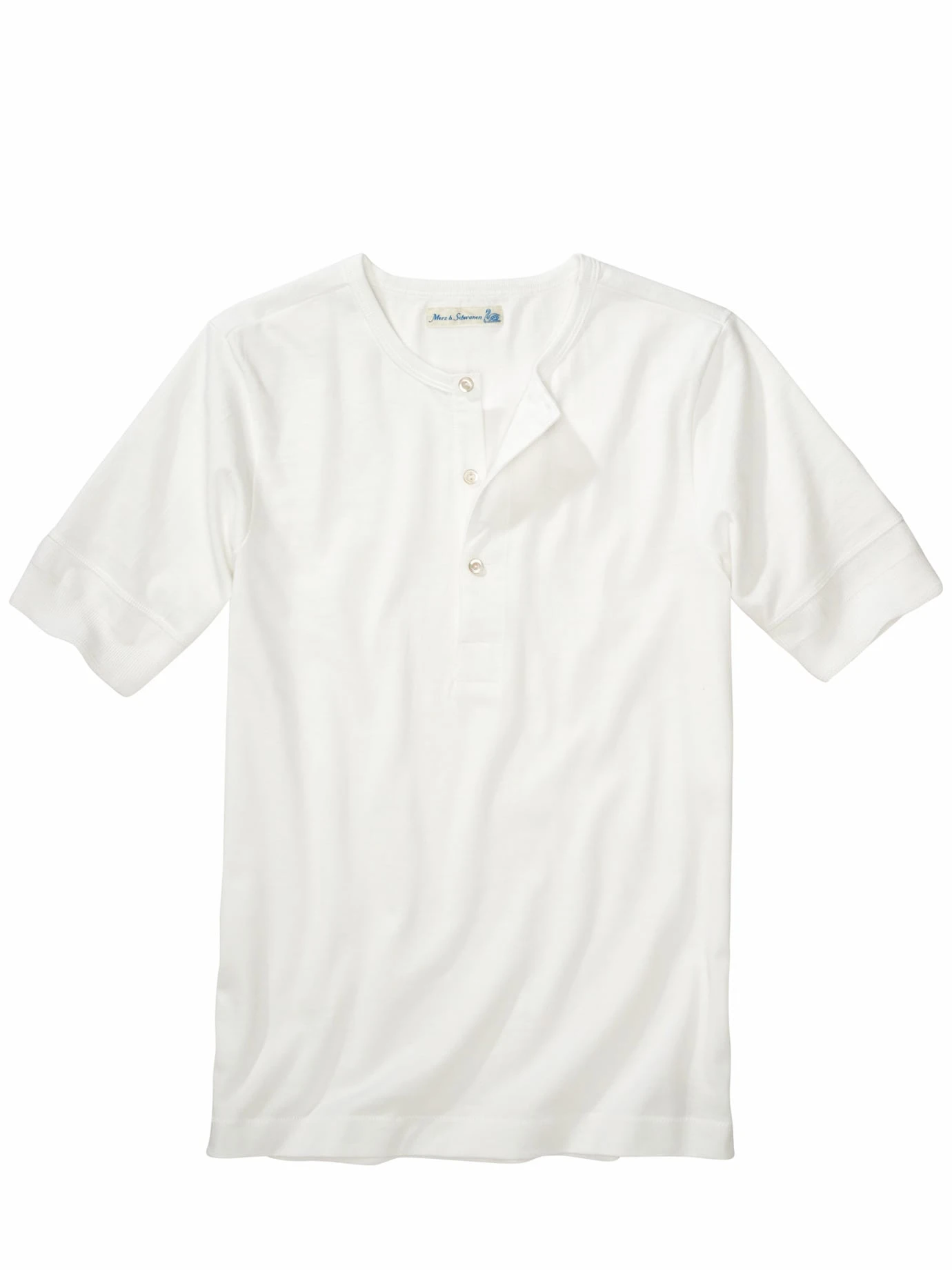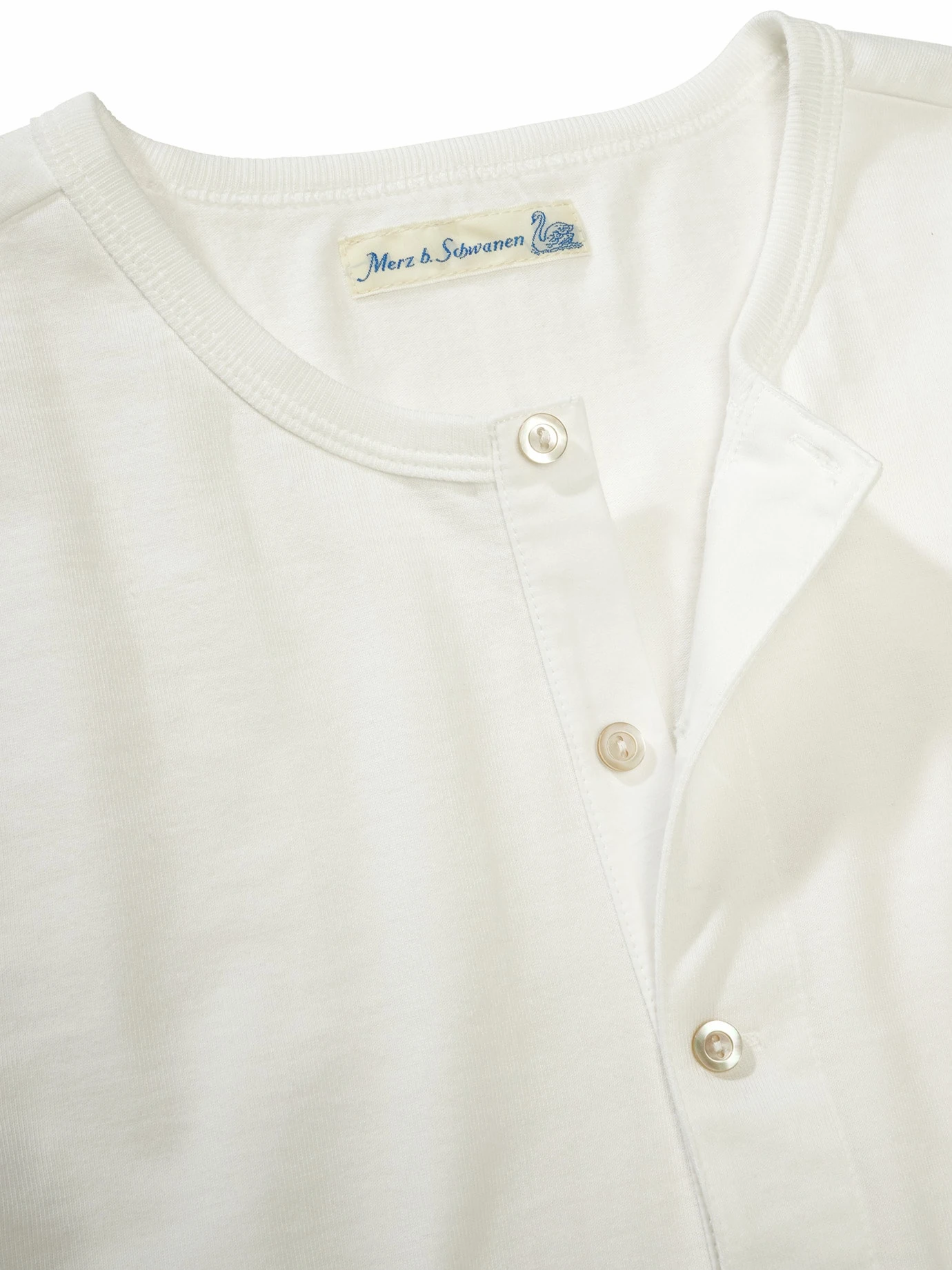 Entwickelt auf Basis des Flohmarktfundes von 1911. Die Vorlage für dieses „Arbeiter-Knopfleistenhemd“ fanden die beiden Köpfe hinter Merz b. Schwanen auf einem Berliner Flohmarkt. Das Besondere ist die authentische Verarbeitung am Halsausschnitt: der Kragen wird von Hand zweifach umschlagen, eben genauso, wie früher vernäht wurde, als es noch keine modernen Einfassmaschinen gab. Schönes Detail: die originalen Wäscheknöpfe aus Perlmutt. Nur echt mit dem aufgesetzten Nackenspiegel für hart schuftende Männer.