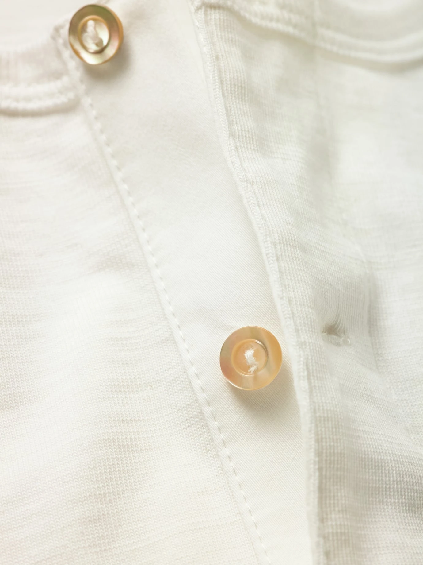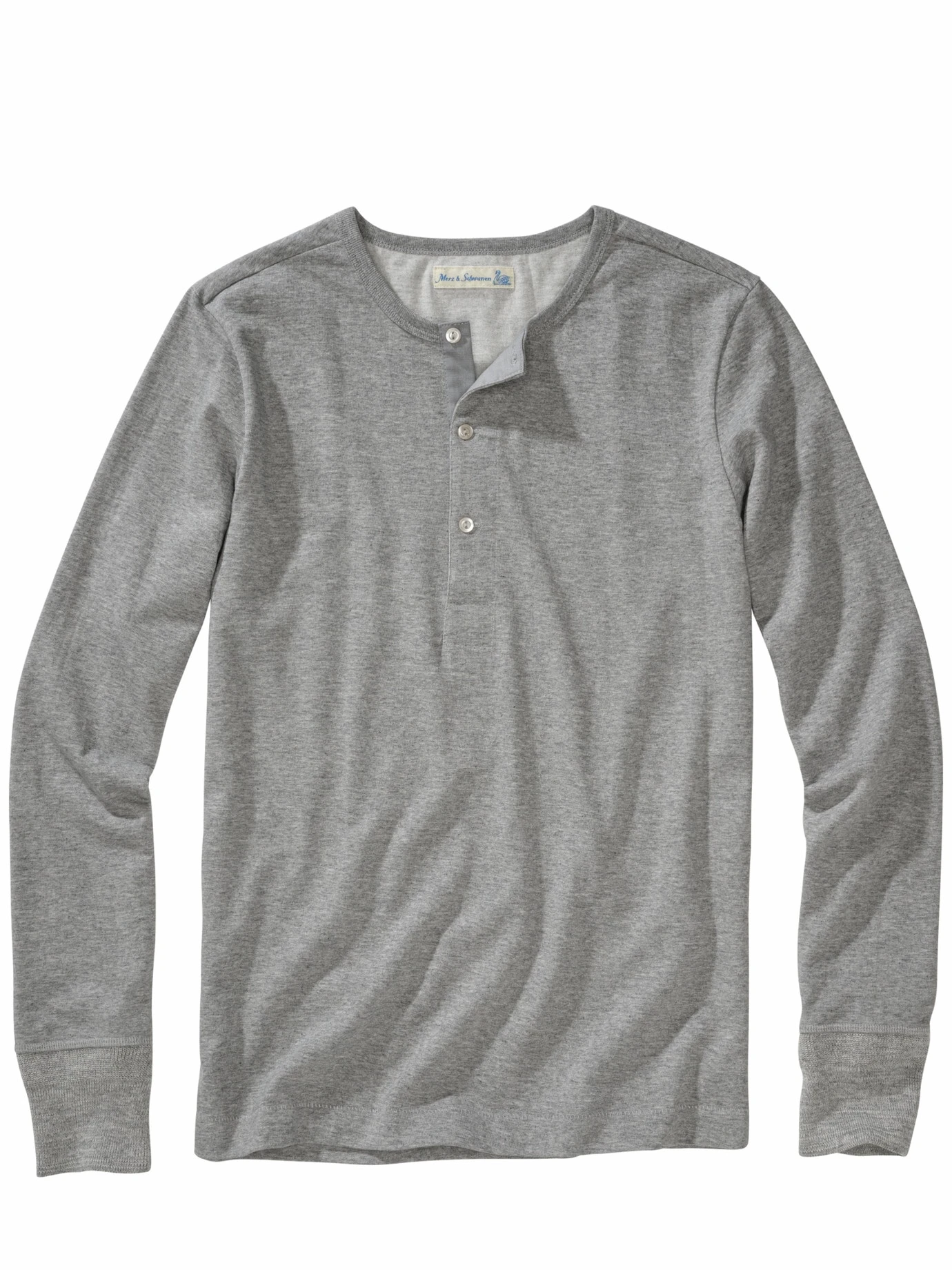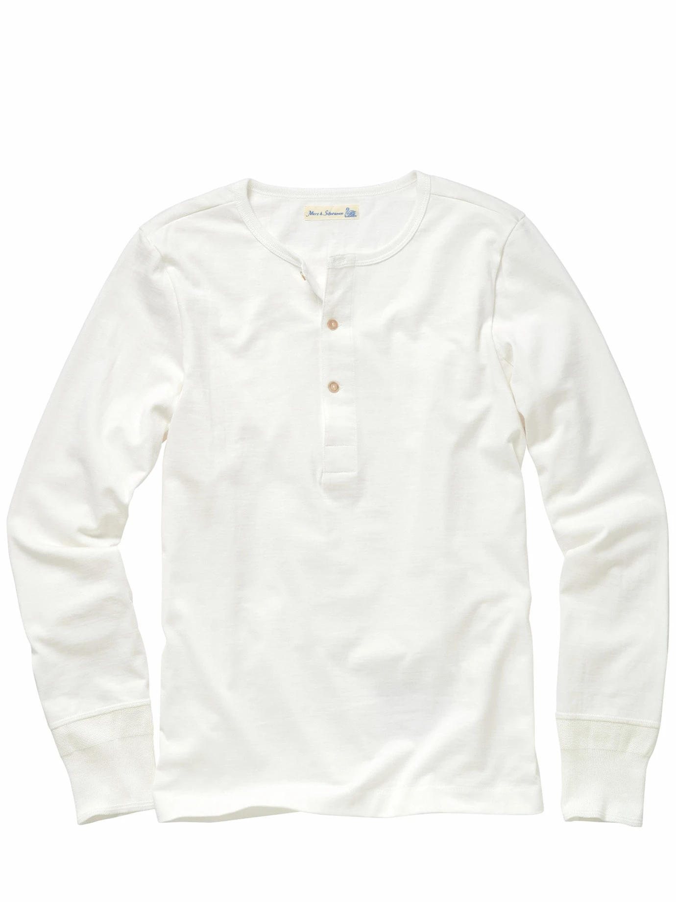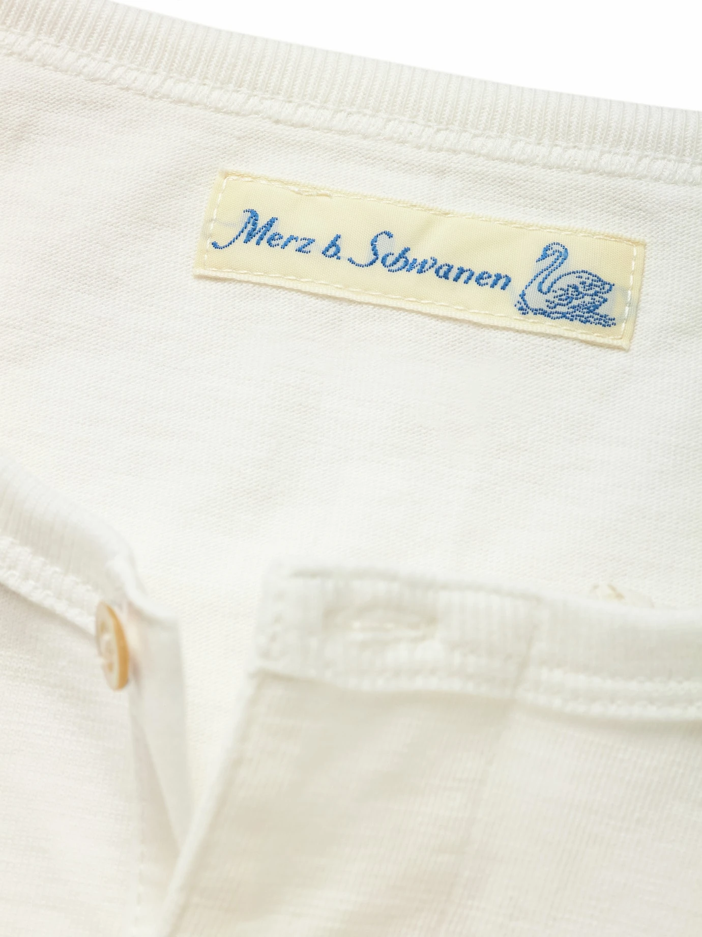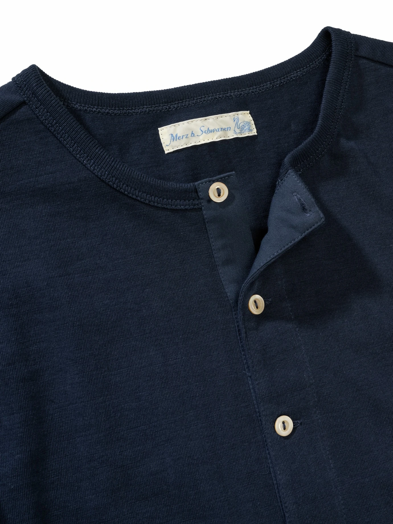 Aus einer Zeit, als ägyptische Baumwolle noch unerschwinglich war. 1911 war in Deutschland Maco-Imit das Nonplusultra im Baumwollsegment. Die Kennzeichen: sehr weich, angenehm zu tragen und dabei leicht. Merz b. Schwanen setzt bei diesem Henley weiterhin auf diese Qualität. Ansonsten mit der aufgesetzten Stoffknopfleiste, Wäscheknöpfen aus Perlmutt und den charakteristischen Flachstrickbündchen am Ärmelsaum. Nur echt mit dem Dreieckseinsatz unterm Arm.