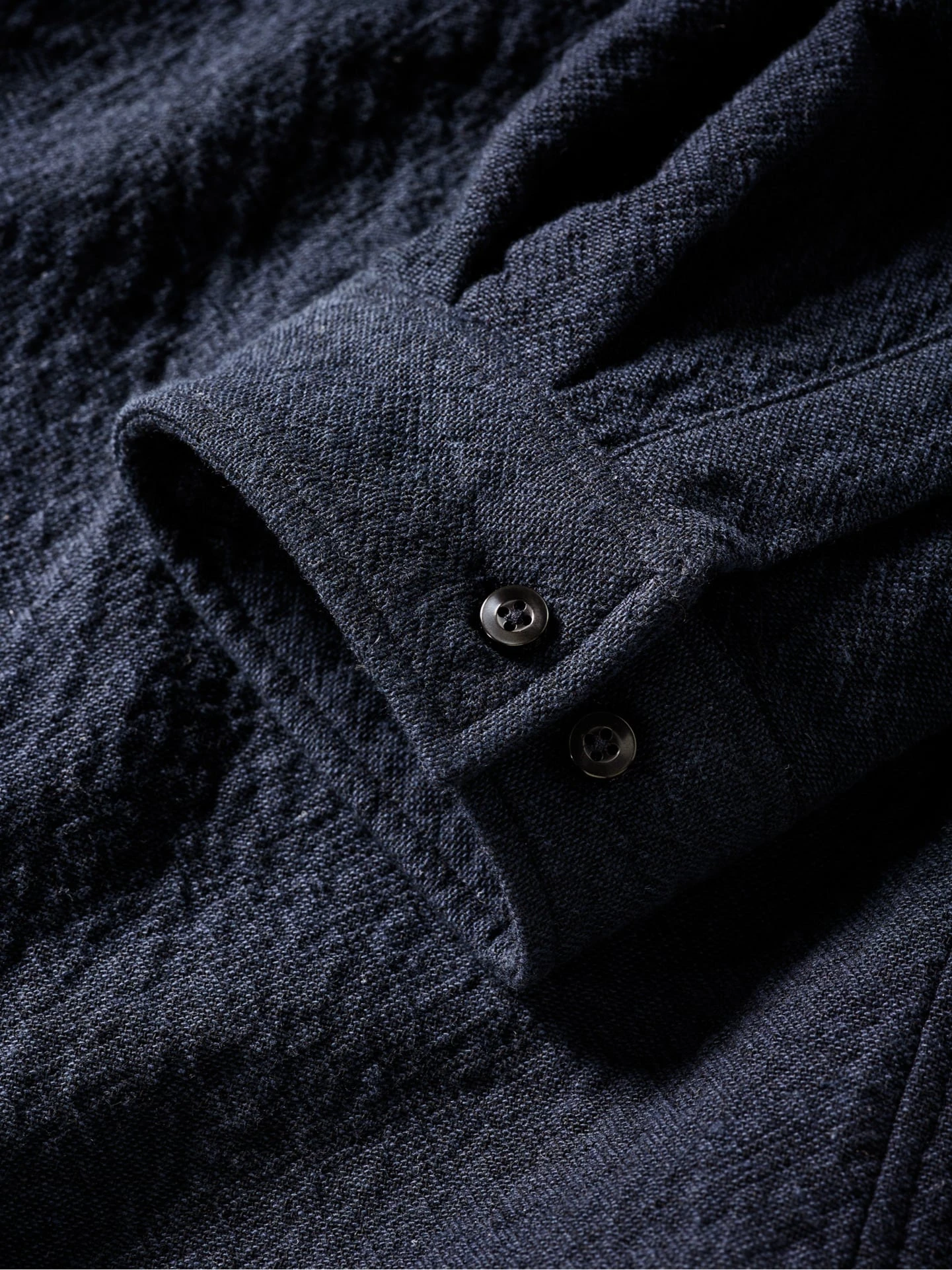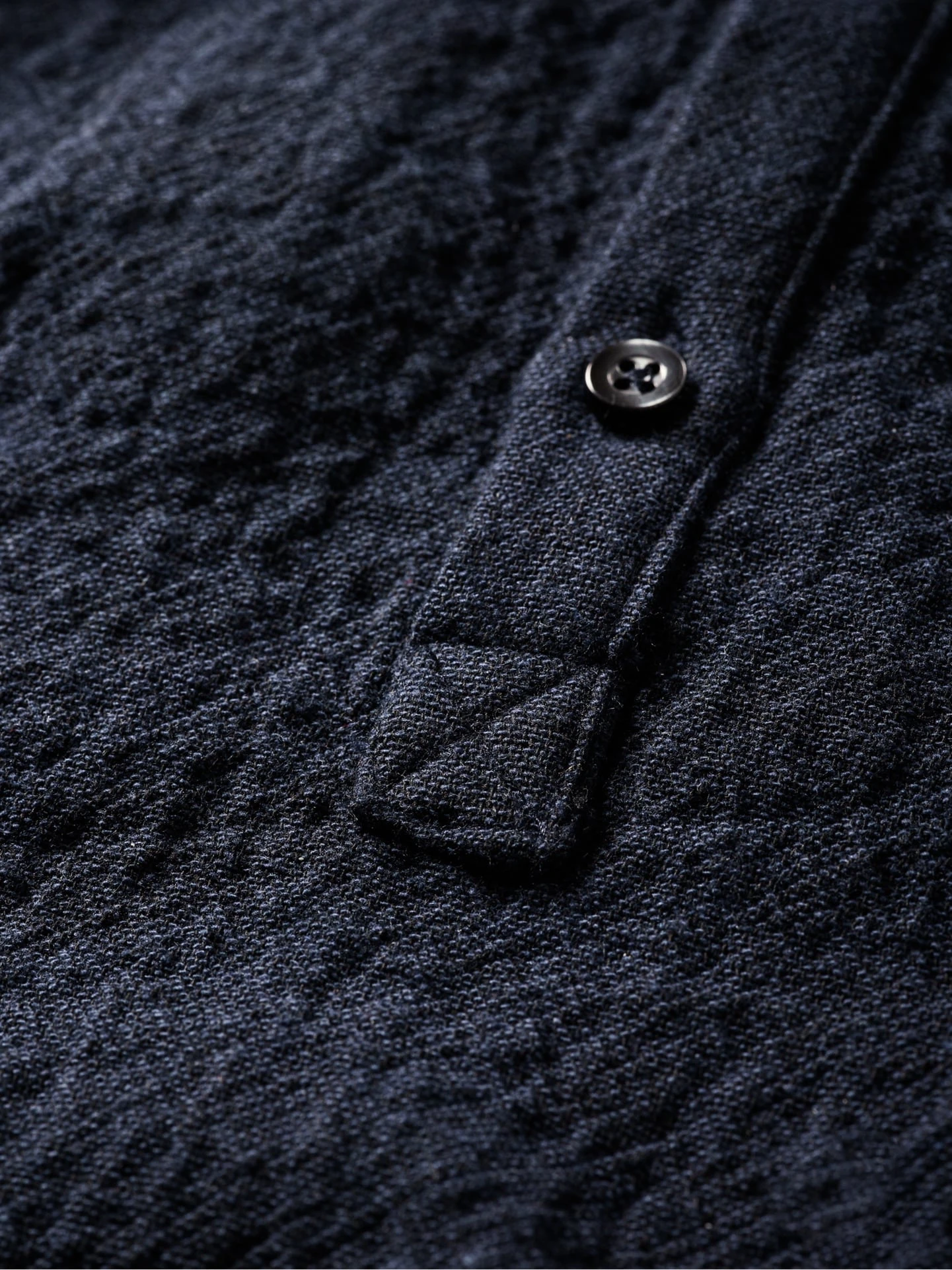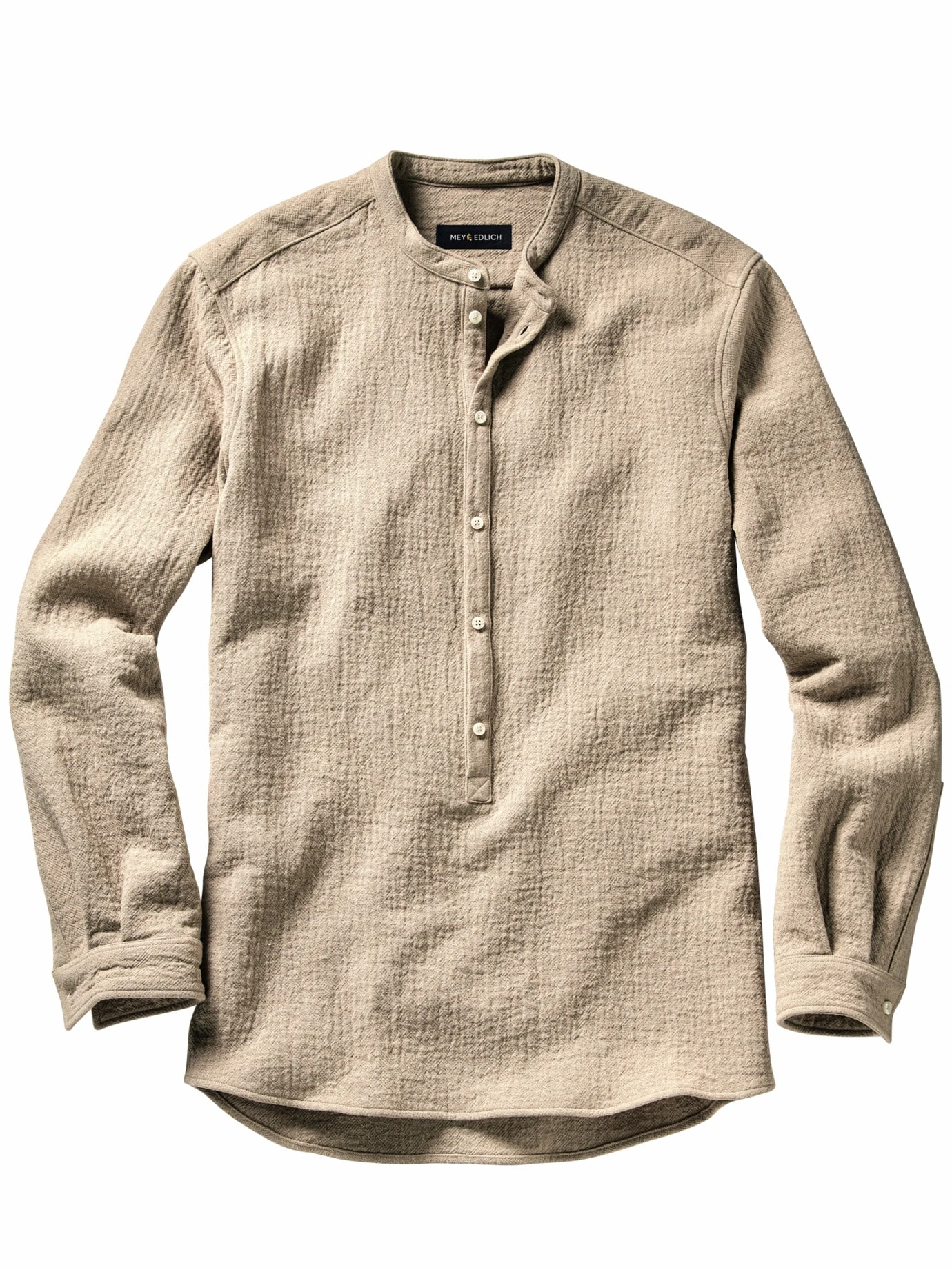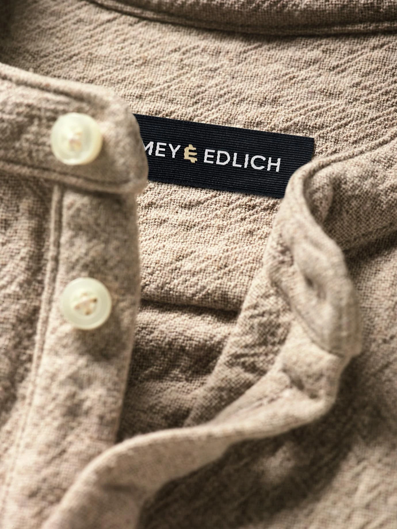 Ein echtes Brett im Hemdenregal. Beim ersten Tragen fühlt es sich noch steif an wie eine Jacke, wird dann aber immer nachgiebiger und bequemer und hat bei Mey & Edlich intern bereits eine große Fangemeinde. Der Stoff, ein robuster Doppel-Jacquard, wird in Litauen gewebt und anschließend per Hammerschlag „gekrinkelt“. Dabei entsteht die grobe, fühlbare Struktur, die sich sehr angenehm trägt, weil der Stoff nicht an der Haut kleben bleibt und Luft Platz zum Zirkulieren bekommt.
