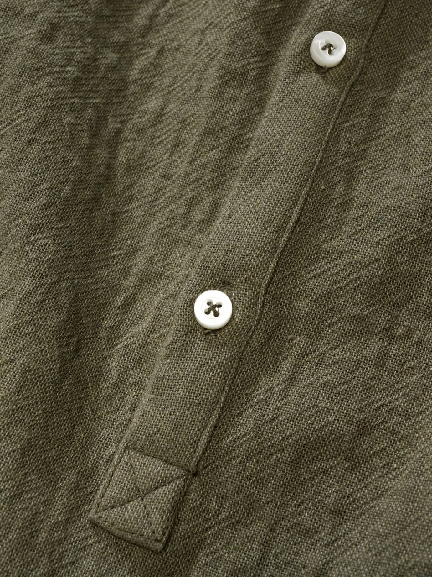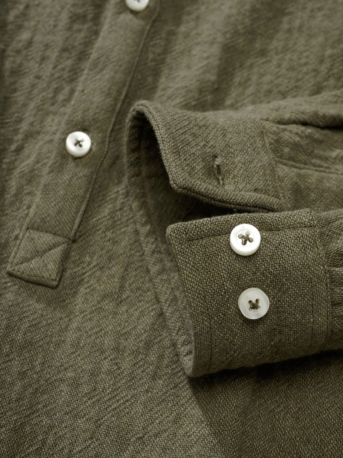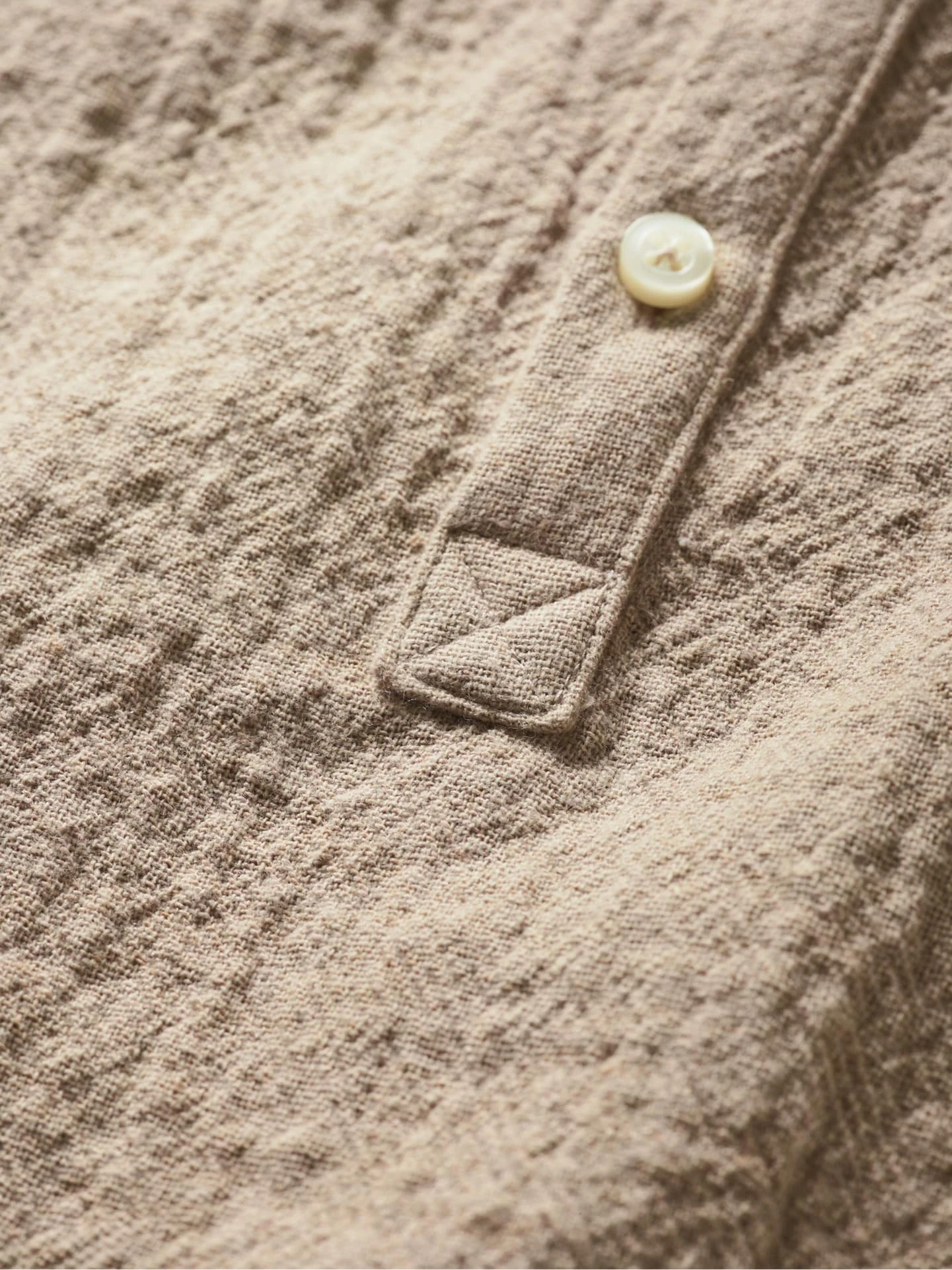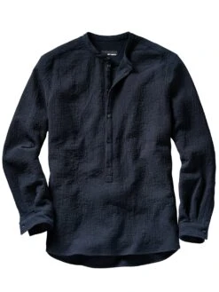 Ein echtes Brett im Hemdenregal. Beim ersten Tragen fühlt es sich noch steif an wie eine Jacke, wird dann aber immer nachgiebiger und bequemer und hat bei Mey & Edlich intern bereits eine große Fangemeinde. Der Stoff, ein robuster Doppel-Jacquard, wird in Litauen gewebt und anschließend per Hammerschlag „gekrinkelt“. Dabei entsteht die grobe, fühlbare Struktur, die sich sehr angenehm trägt, weil der Stoff nicht an der Haut kleben bleibt und Luft Platz zum Zirkulieren bekommt.