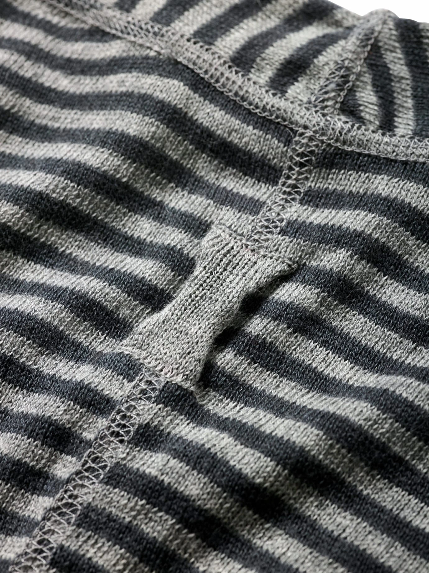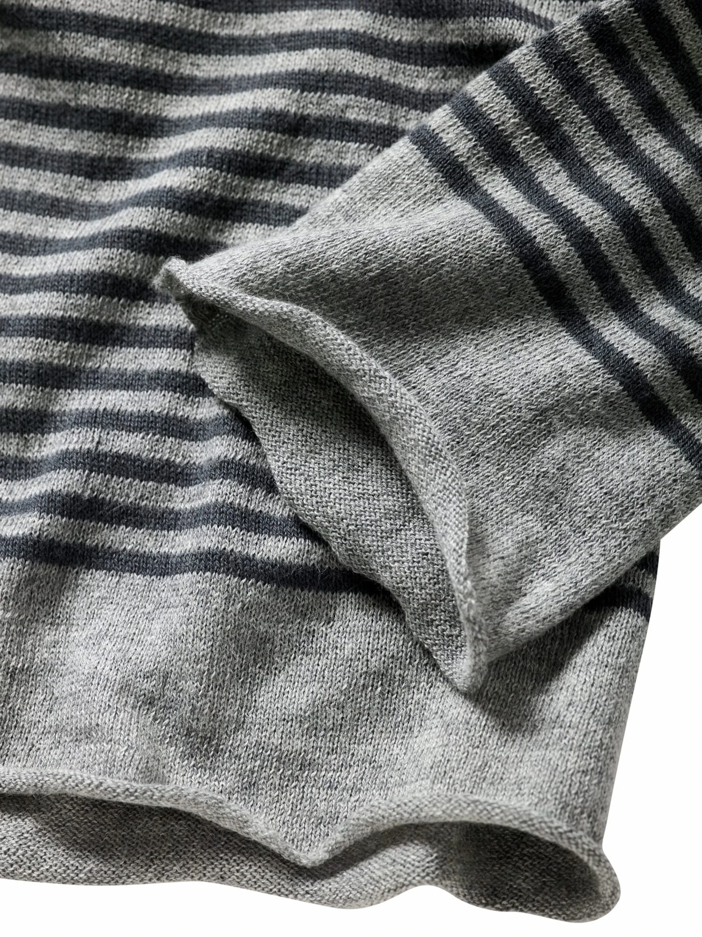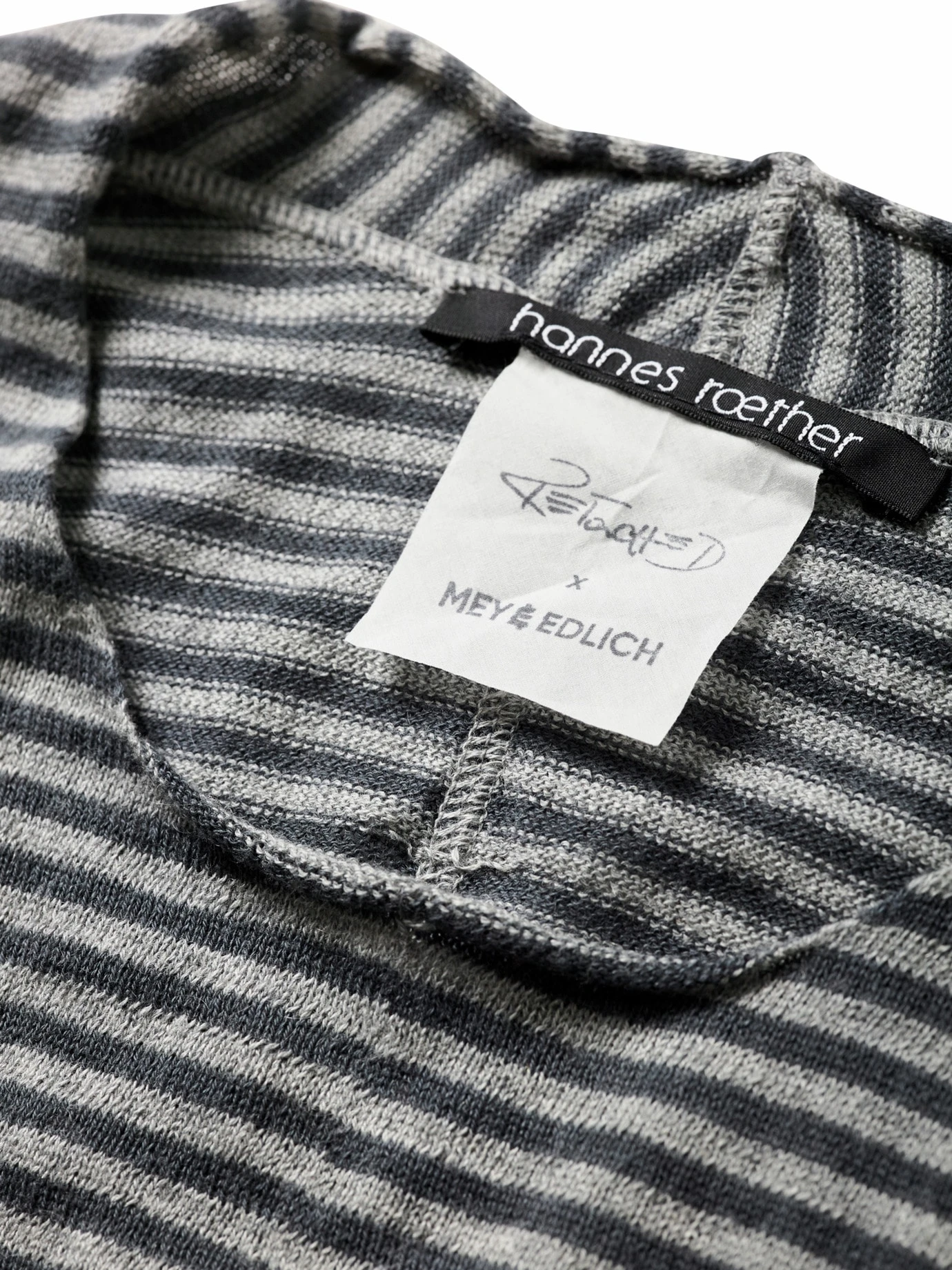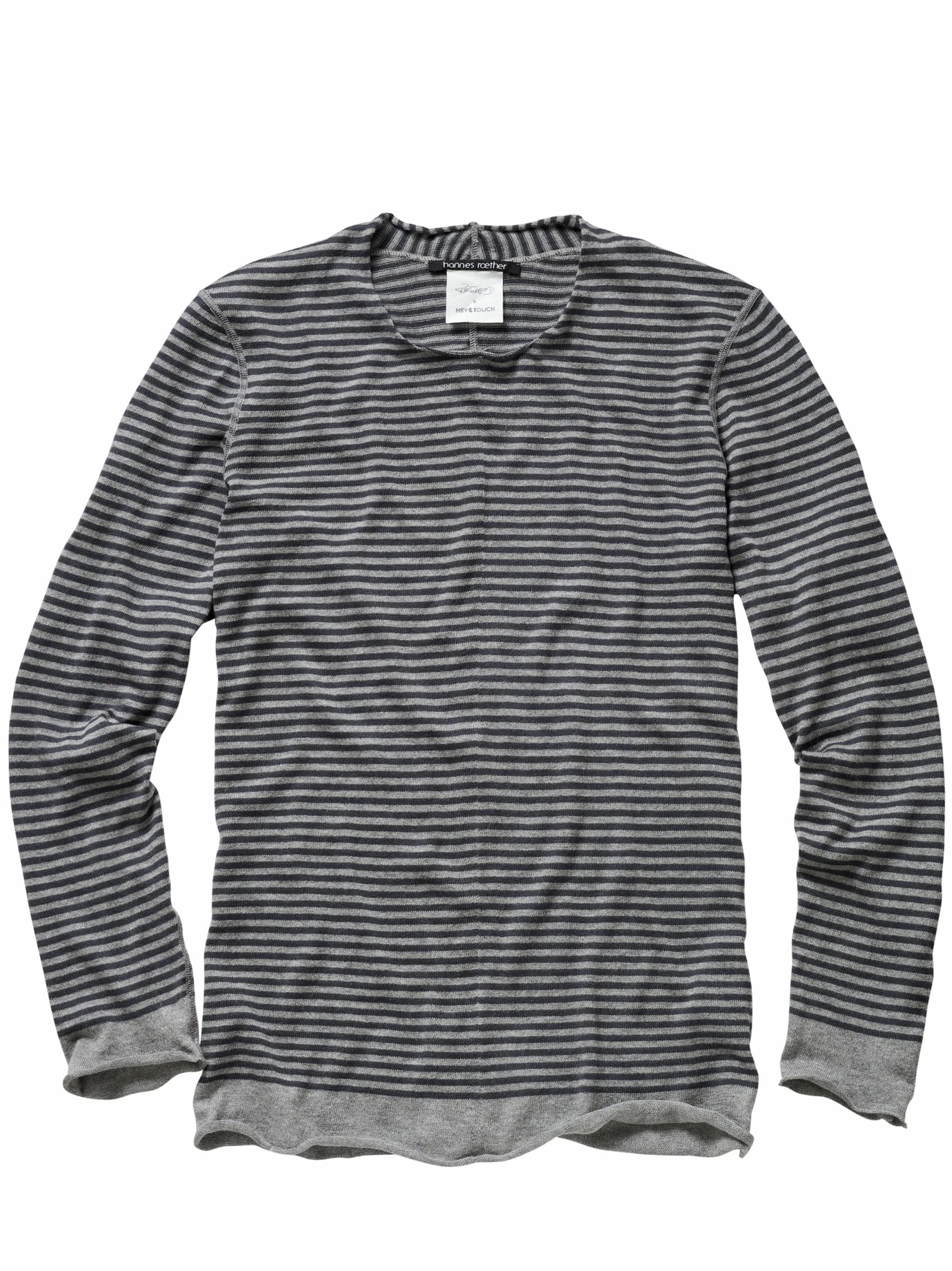 Geringelt aus Überzeugung. Das weiche portugiesische Garn hat uns schon in vorigen Kollektionen bei hannes roether begeistert, den Ringel gibt es nun ausschließlich und speziell bei uns. Bei dem 130 g/m² leichten Garn trifft hautfreundliche Baumwolle auf zehn Prozent Kaschmir. Die Luxusfaser macht den Pullover nackte-Haut-tauglich und sorgt für den Temperaturausgleich. Typisch hannes roether: blitzsaubere Nähte, Rollkanten an Saum und Ärmeln. Neu: die Overlock-Naht am Rücken. Der zeitlose Ringelpullover reiht sich bei Jeans und Chinos ein und mischt Anzüge auf.