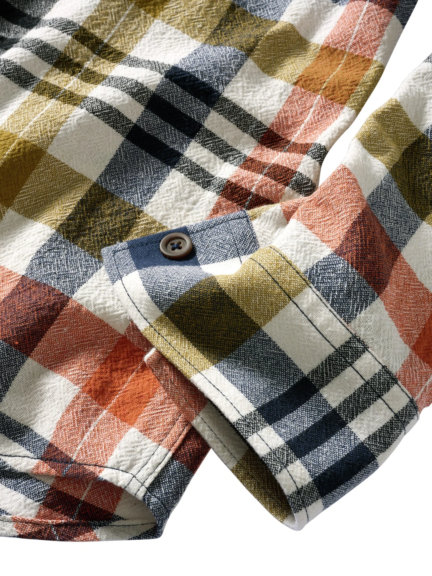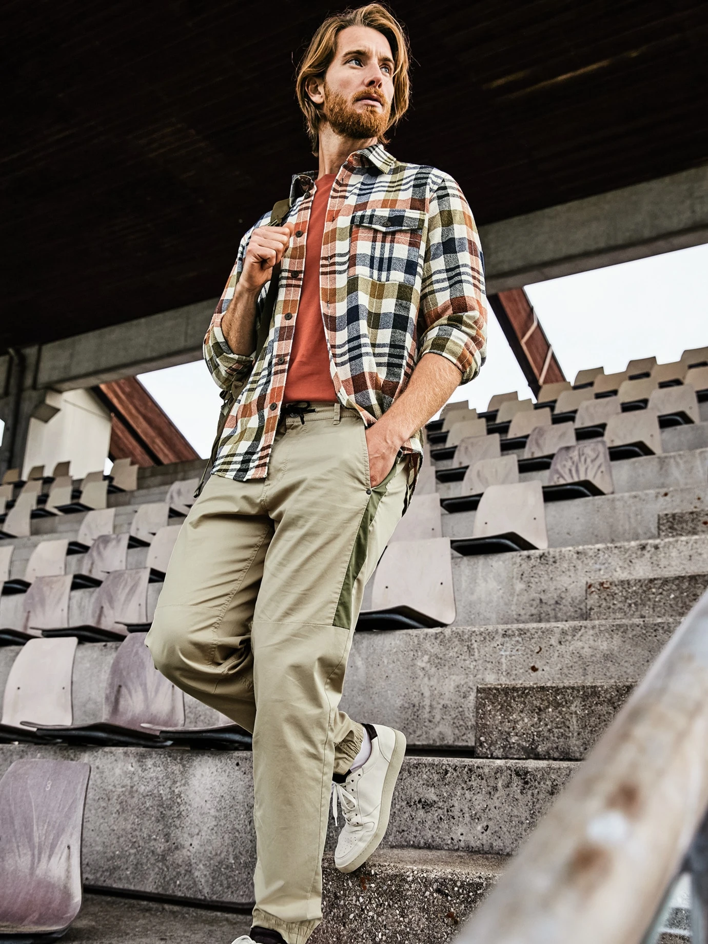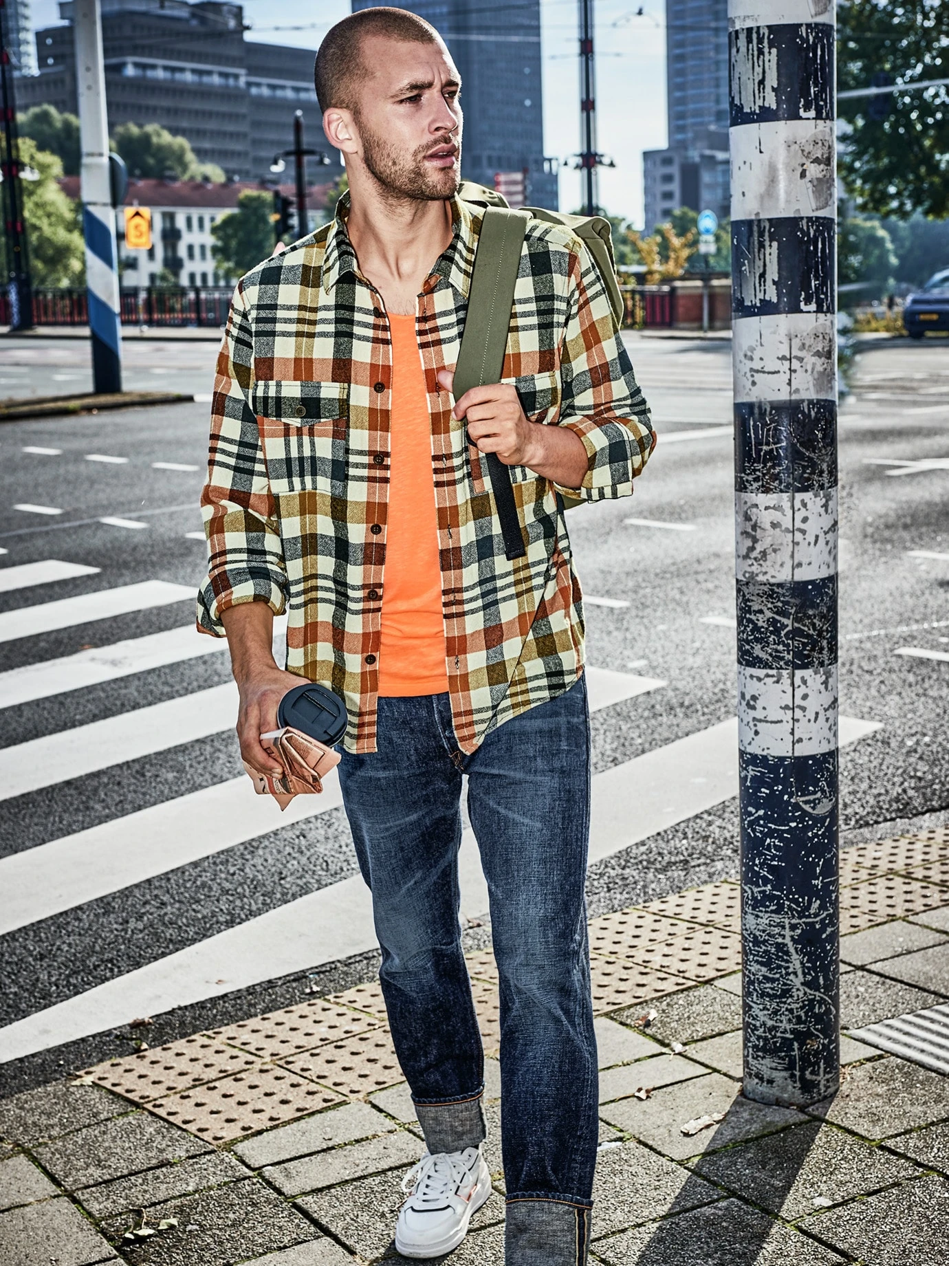 Mehr als Muster. Es erinnert ans Prinzip Flanell, doch statt wie früher, als es bei der Ernte helfen und beim Feiern aushalten musste, ist dieses viel leichter. Sein glattes Gewebe stammt aus Italien, wo man sich traditionell mit feinerem Zwirn beschäftigt. Mit griffiger Struktur und der damit verbundenen Langlebigkeit, unterm Strich schlicht stadtaffiner. Das natürliche Farbspektrum entsteht durchs sanfte Waschen, haut so zu jeder Hosenfarbe hin, ob als Hemd oder Jackenersatz.
