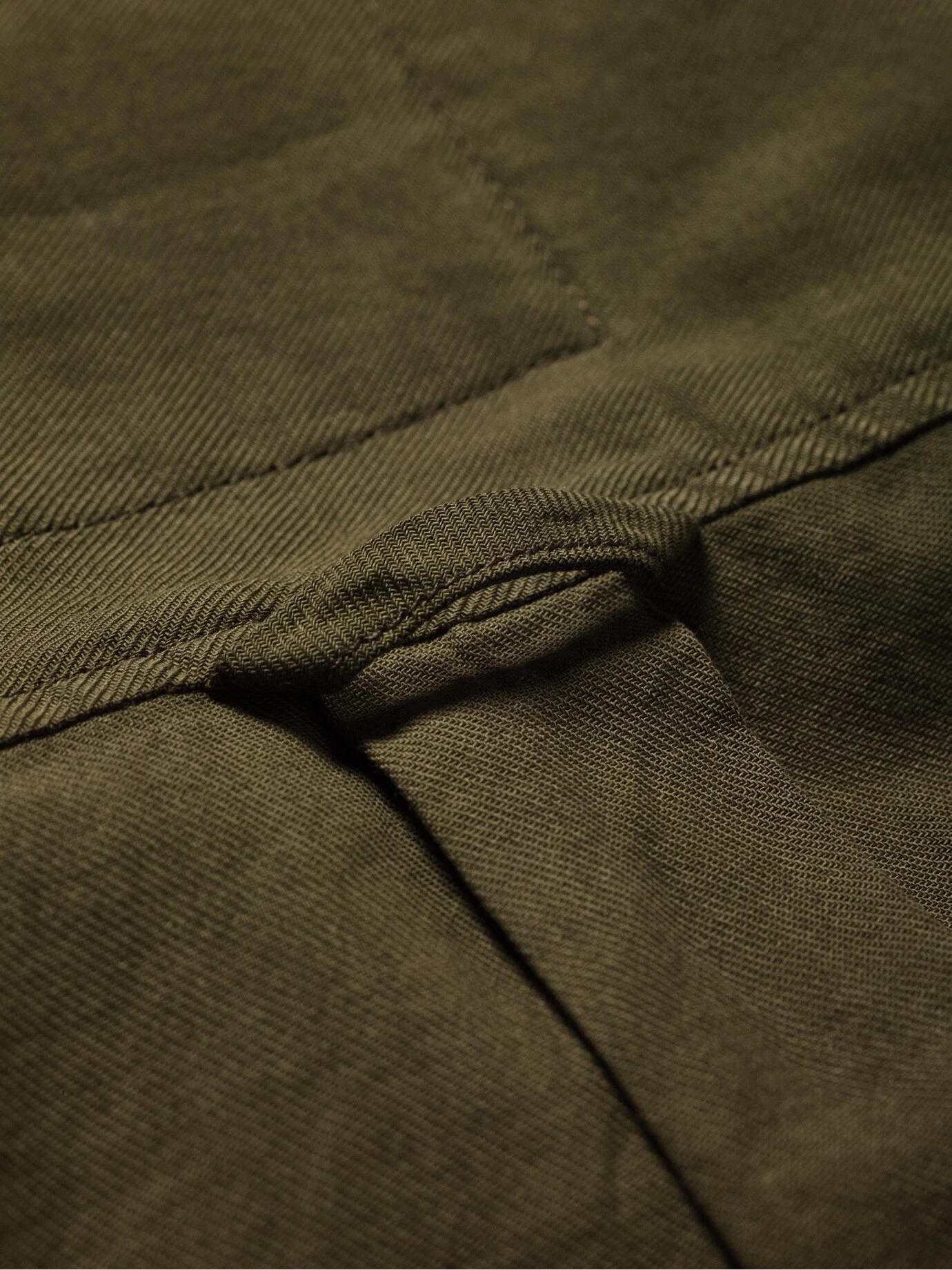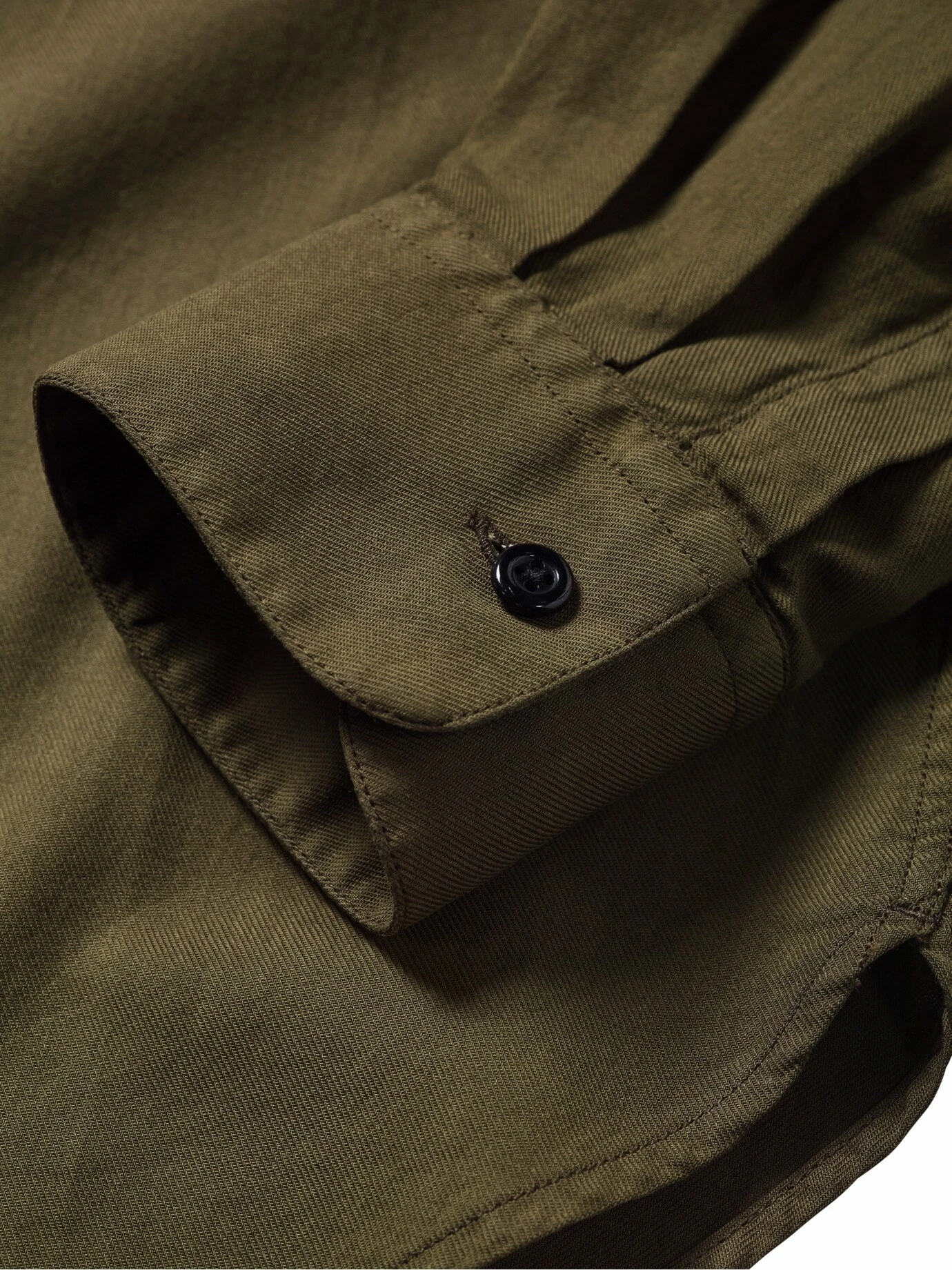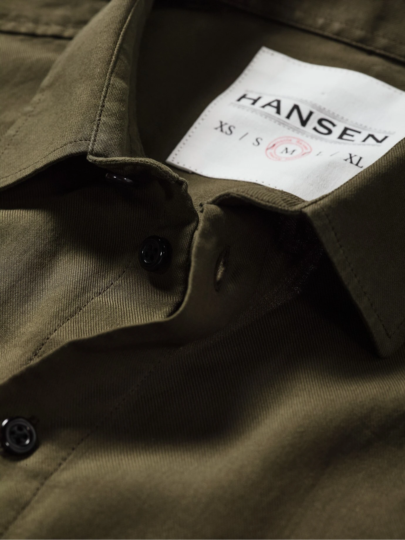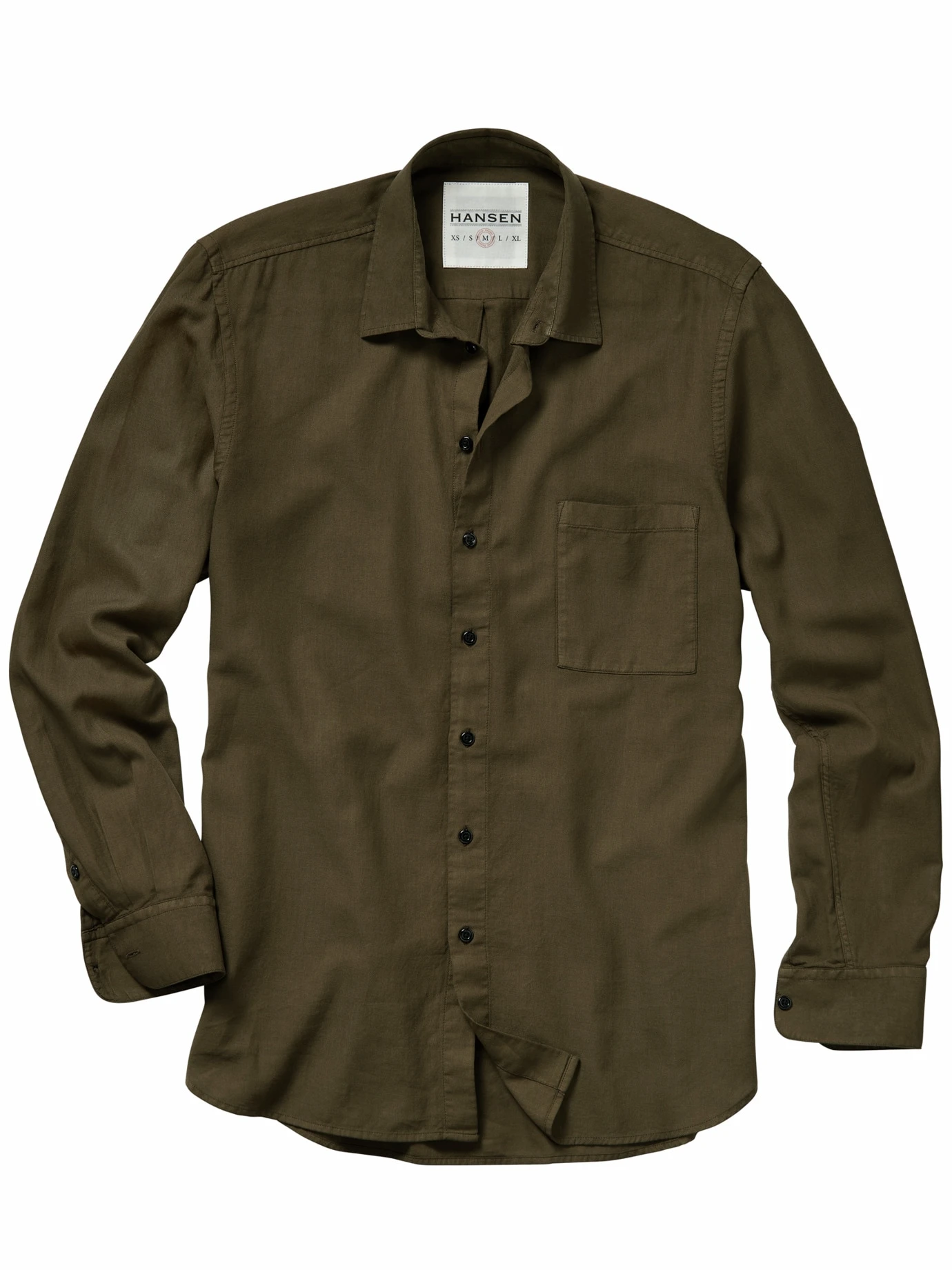 „Wir glauben an kleine Kleiderschränke und große Persönlichkeiten.“ Genau die haben in dem locker geschnittenen Hemd von HANSEN Garments aus Kopenhagen Raum zur Entfaltung. Der sanft vorgewaschene italienische Baumwolltwill (von dem HANSEN sagt, er würde süchtig machen) ist weich und leicht. Die sauber und haltbar verarbeiteten Nähte und die Perlmuttknöpfe verweisen dezent auf die High-End-Hemdenliga. Mit einer Farbe, die überraschend gut zu kombinieren ist. Im Business mit Krawatte, in der Freizeit lässig über der Hose tragen.
