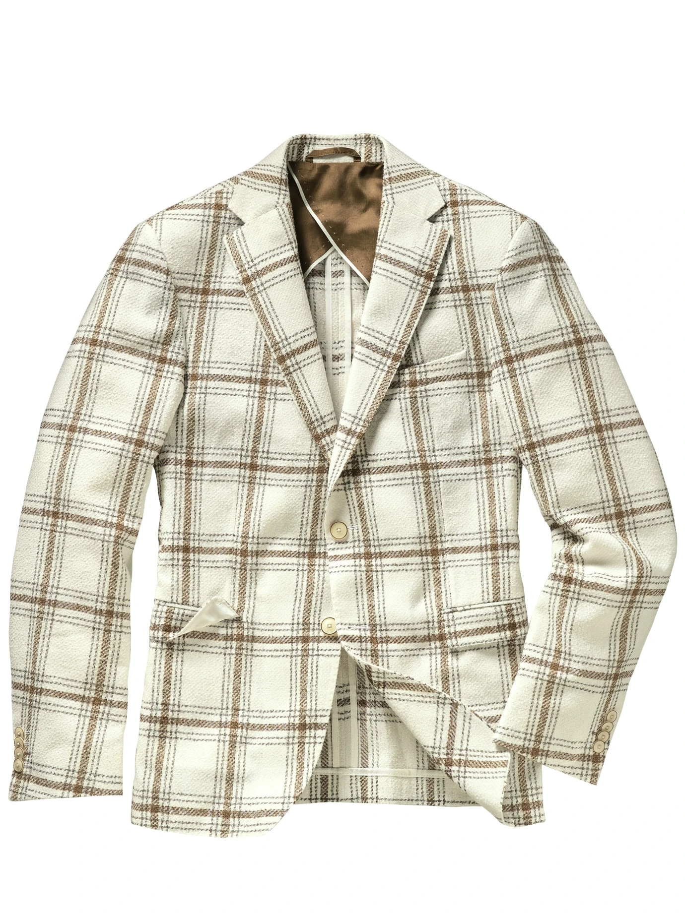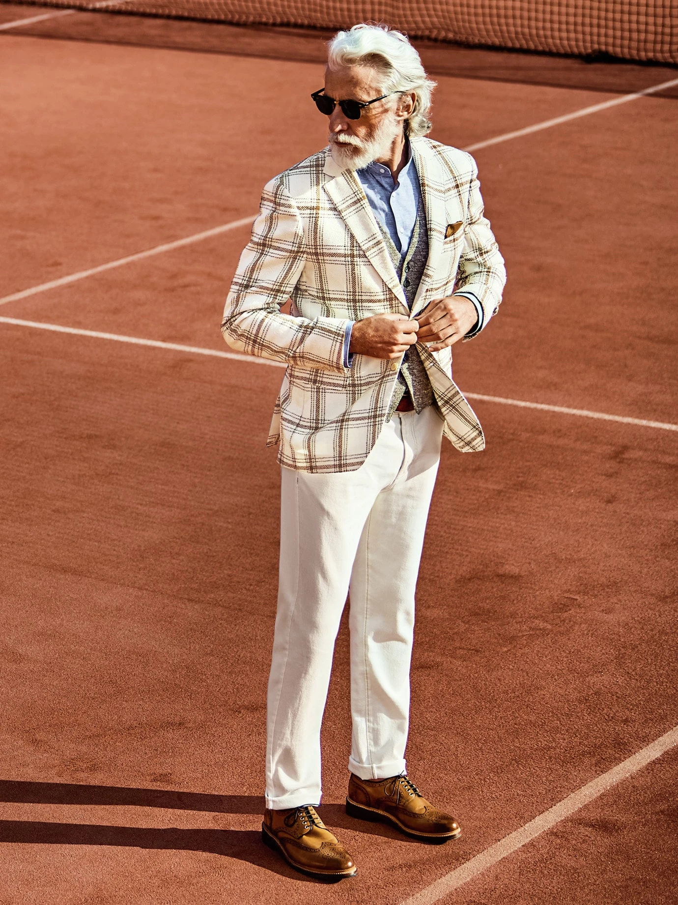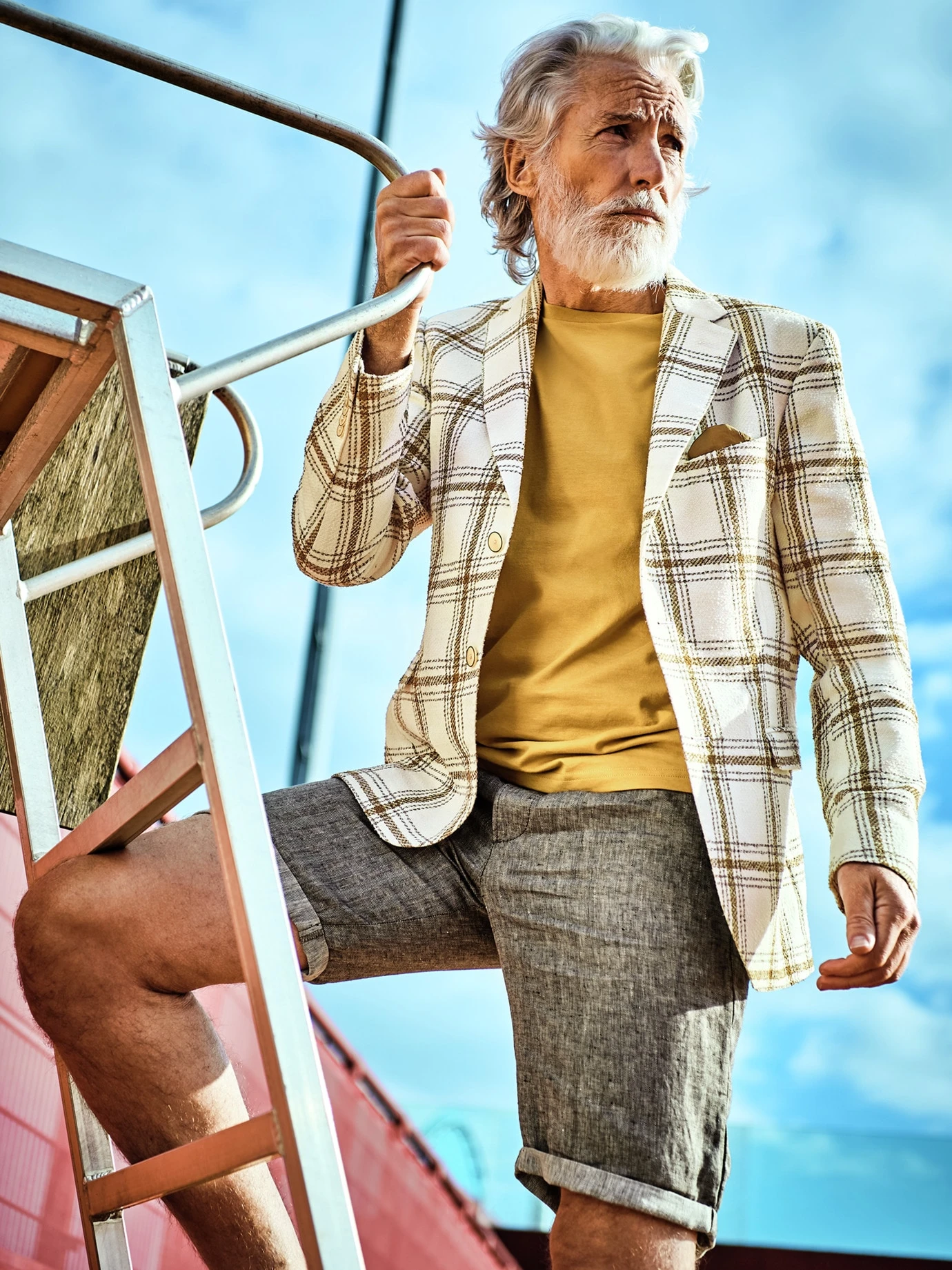 Schafft Präsenz. Es strahlt Frische aus und suggeriert, in diesem Sakko steckt ein aufgeschlossener Träger. Allein, weil es in der Masse dunkler Sakkos heraussticht, ohne Aufsehen zu erregen. Den Weitblick liefert das imposante Fensterkaro samt Überkaro – einen solchen Stoff meistert nur ein Traditionsweber. Marzotto verwendet hierfür solide Schurwolle und paart sie mit angenehmer Baumwolle, der Rest Polyamid dient der Haltbarkeit. Sie werden es vermutlich nicht jeden Tag tragen, aber dann, wenn Sie gesehen werden wollen. Gefordert souverän zur hellen Jeans mit Shirt und Sneaker.