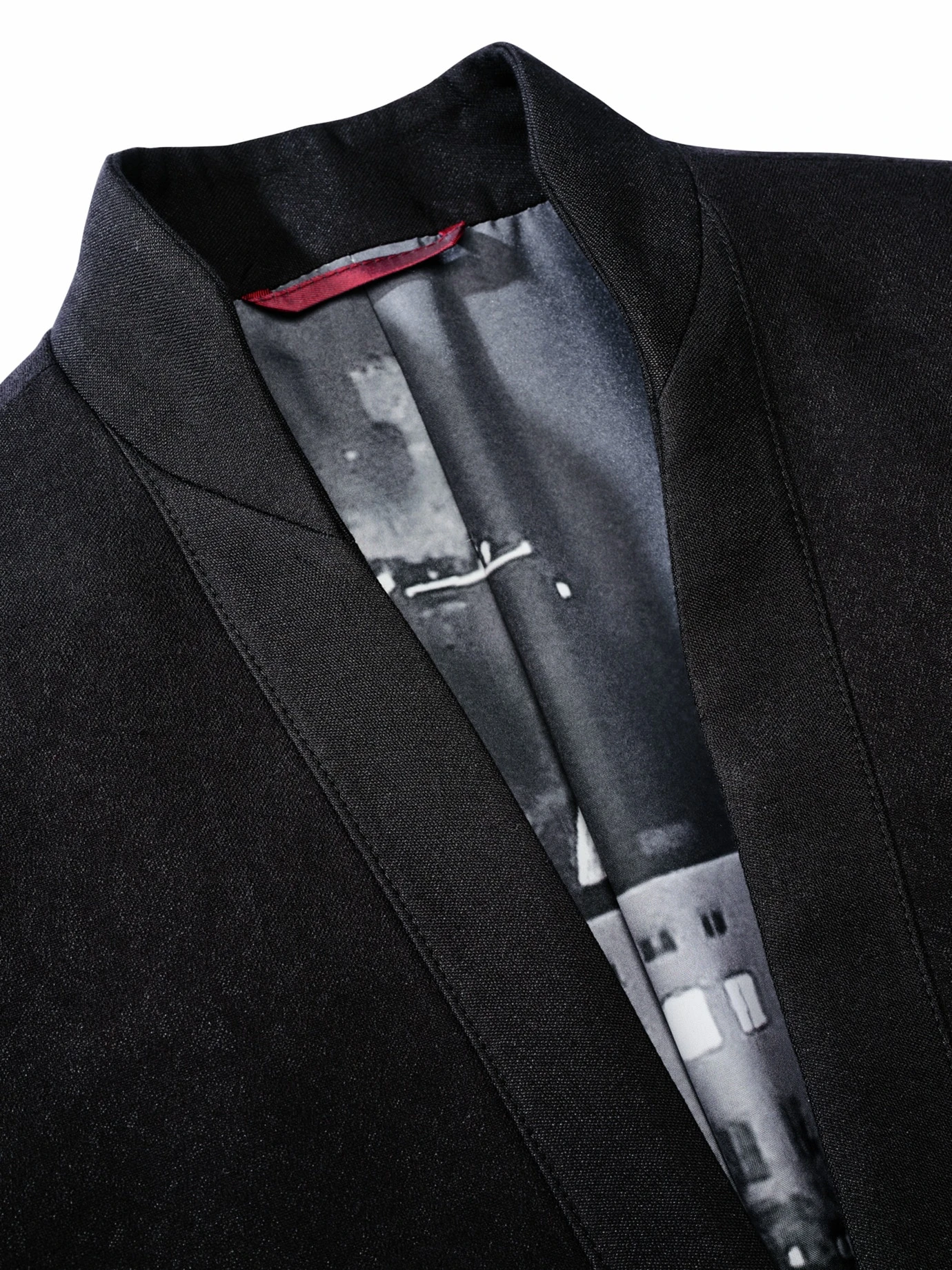 Extravagant im Auftritt. STILKRAFT interpretiert das Smokingsakko neu. Das exklusive Jacquardgewebe im verhaltenen Fantasie-Dessin wird Öko-Tex-zertifiziert in Österreich auf Seidenwebmaschinen gefertigt. Dabei erzeugt die feine Baumwolle in Kombination mit Seide einen eleganten Matt-Glanz-Effekt, der besonders wirkt im Scheinwerferlicht. Der Kontrasteinsatz an der vorderen Kante und der Stehkragen aus Uni-Stoff sorgen für eine optische Anlehnung an den bekannten Schalkragen. Ansonsten im zeitlosen STILKRAFT-Look. Das Futter ist zusätzlich bedruckt mit der Salzburger Skyline.