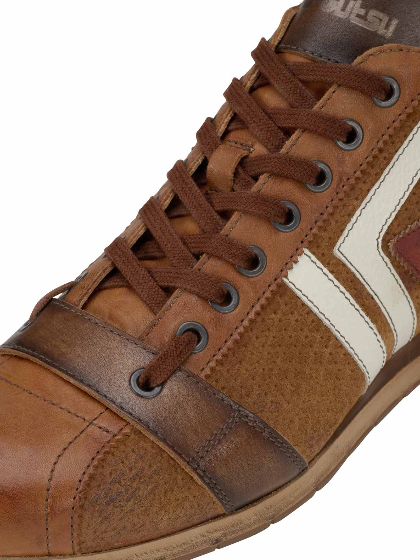 Im Stile würdevoller Fußballzeremonien. Inspiriert vom kemaria, dem japanischen Spiel, bei dem der Ball lange in der Luft gehalten wird, ist dieser Schuh. Vom Grundprinzip erinnert er an die Turnschuhe der 1920er-Jahre, mit erhöhter Schnürung (der quer umlaufende Lederriemen hält sie an Ort und Stelle), schlankem Design und flacher Sohle. Gefertigt in der Region Italiens, die die geheime Schatzkammer für hochwertiges Schuhwerk ist, den italienischen Marken. Das Obermaterial ist weiches Ziegenleder, das Futter aus Kalbleder macht ihn robust.