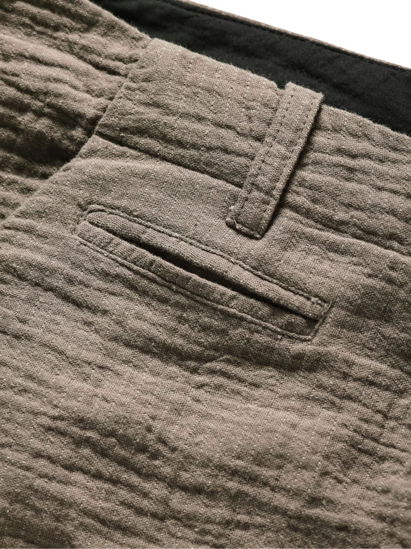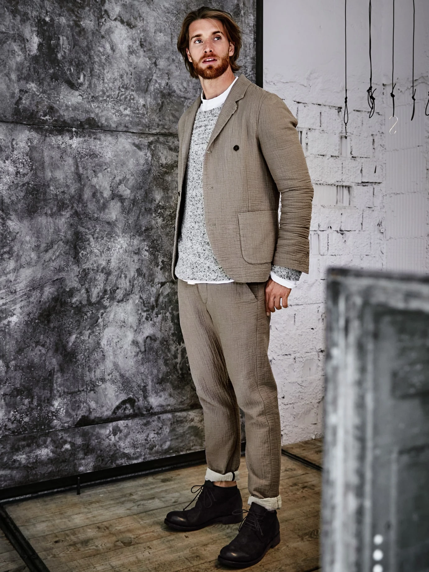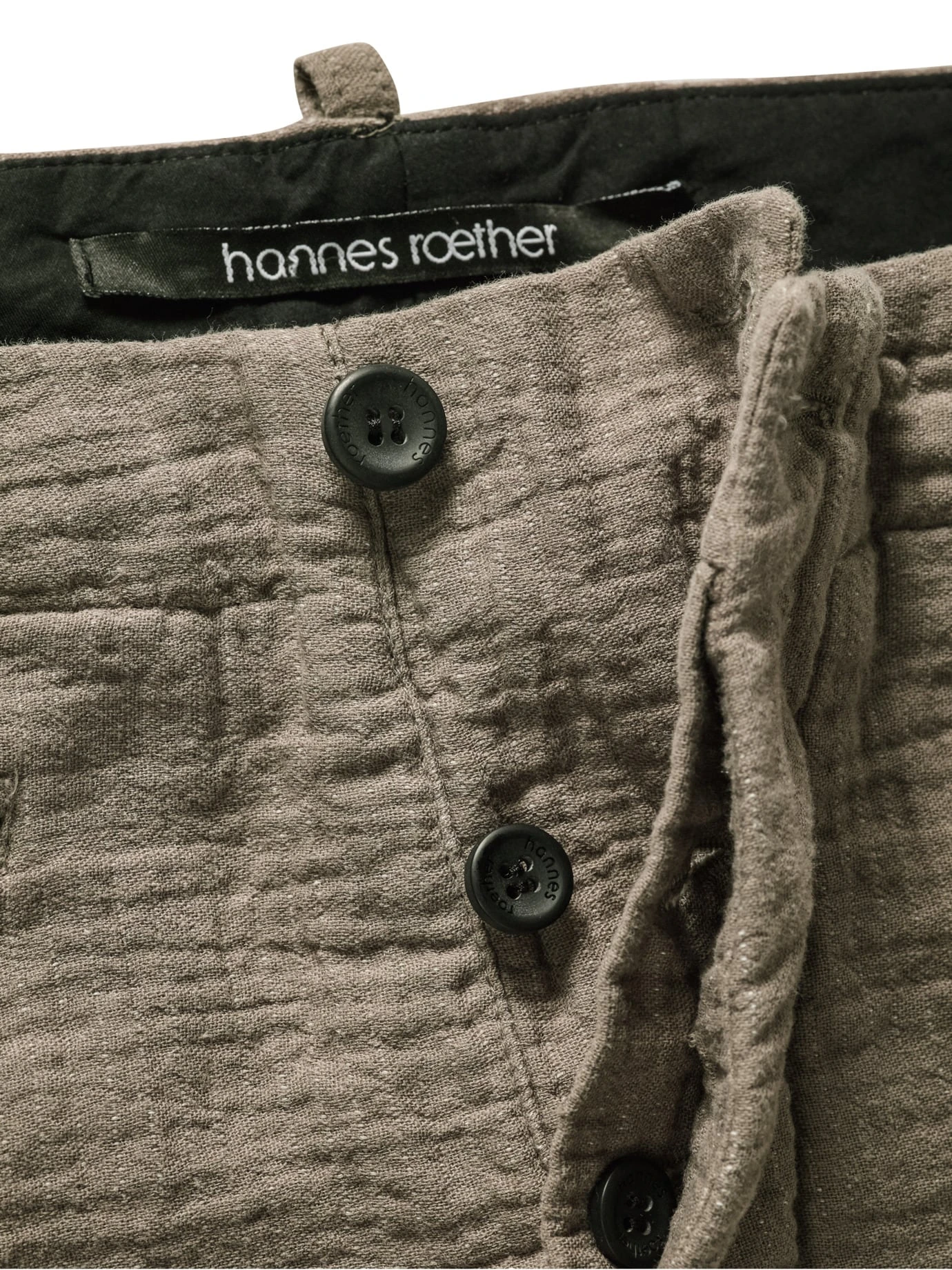 Ihre Knitter trotzen vor Erhabenheit. hannes roether trichtert dieser Hose die Zeichen der Zeit ein. Die Basis: zwei feine Baumwollstoffe, die punktuell miteinander verbunden werden – das kostet zwar Zeit, sieht aber cool aus und fühlt sich sommerlich leicht an. Der Rest ist hannes roethersche Designarbeit versehen mit einem zeitlos klassisch geraden Schnitt. Passt zu dem, was Textur trägt – wie ein Leinenhemd oder rustikaler Strick.