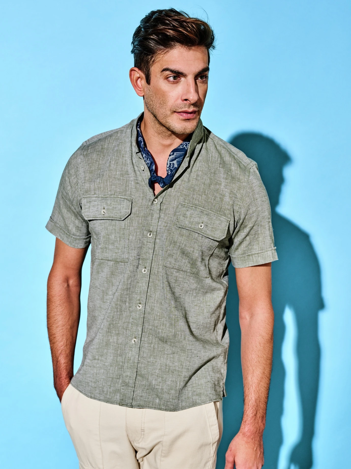 Kunst auf einer Größe von 50 x 50 cm. Jedes dieser Tücher ist von Hand bemalt: Das auffallende Muster wird mit heißem Wachs aufgebracht, das Tuch anschließend in eine Wanne voll Indigo getränkt – bis zu zwanzig Mal. Das passiert alles so individuell, dass am Ende jedes Tuch anders aussieht. Seinen natürlich verblassten Charakter erhält es mit der Zeit, mit etwas Sonne, Salzwasser und jeder Wäsche.