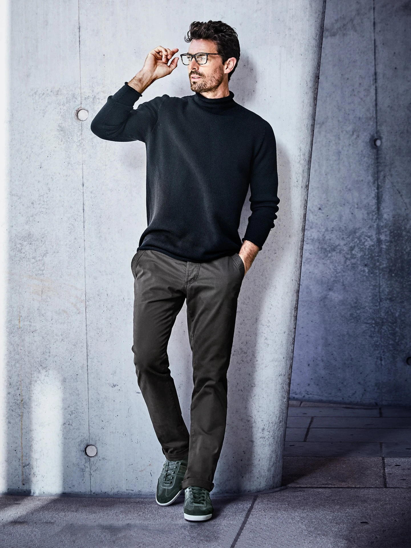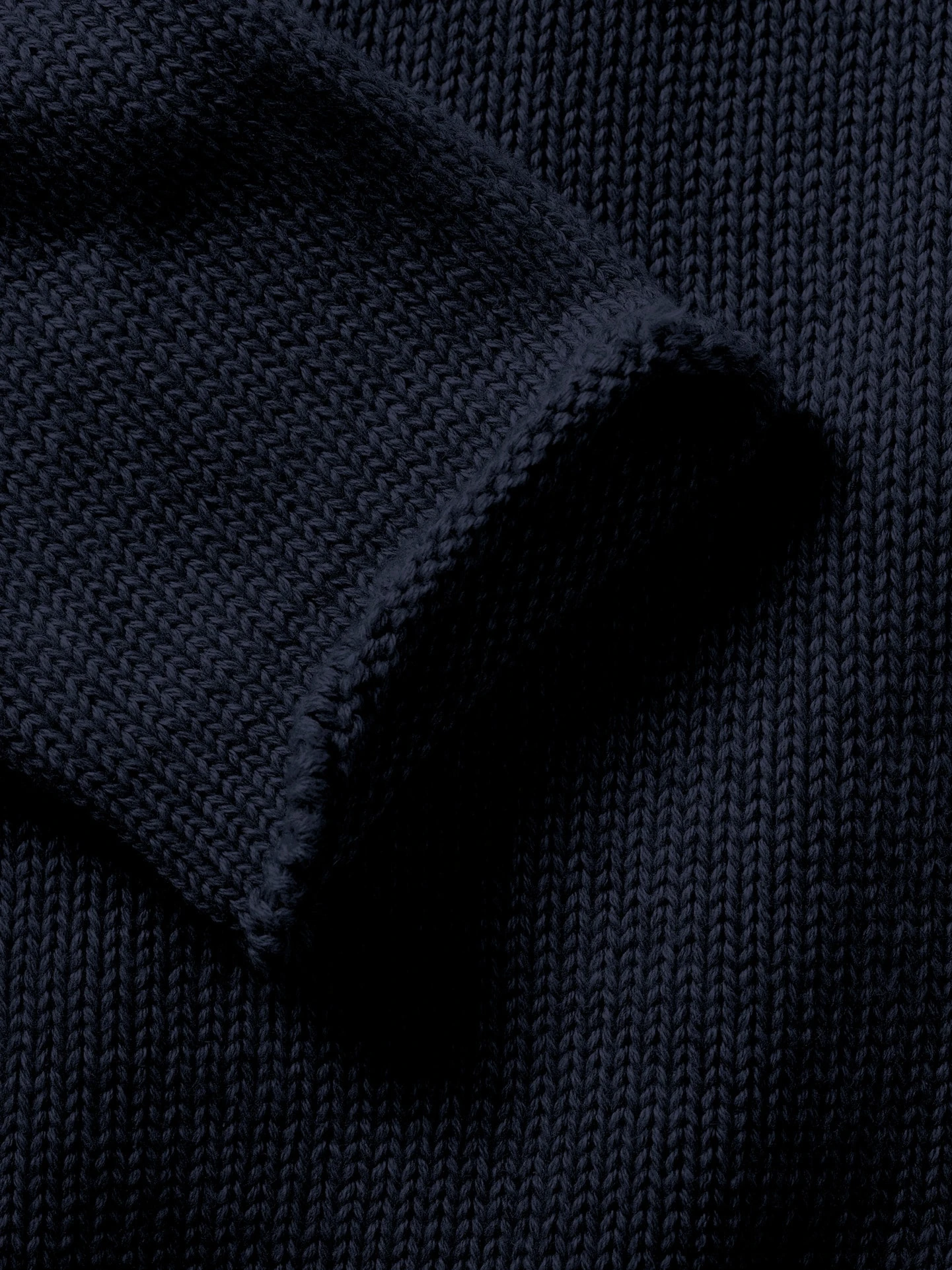In einem Stück gestrickt. Das ist technisch neu, für den Stricker eine echte Herausforderung und für Sie als Träger pure Faszination, weil der Pullover ohne eine einzige Naht auskommt. Dafür besitzt er handwerklich-anmutende Abnahmen an Schultern und Ärmeln. Und einen Kragen, der so natürlich schön fällt wie kaum ein anderer. Er bedeckt den Hals ausreichend, um ihn zu wärmen, engt dabei nicht ein und legt den Fokus auf Ihr Gesicht.