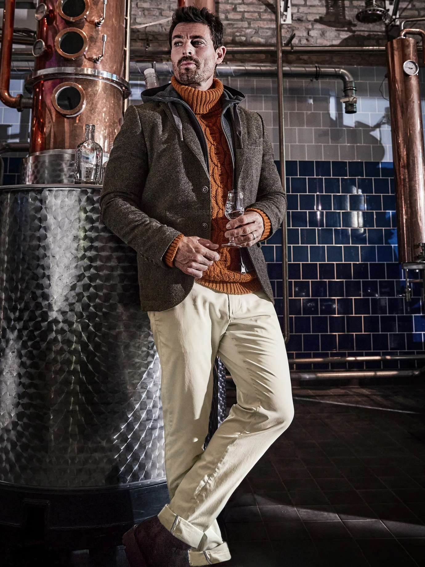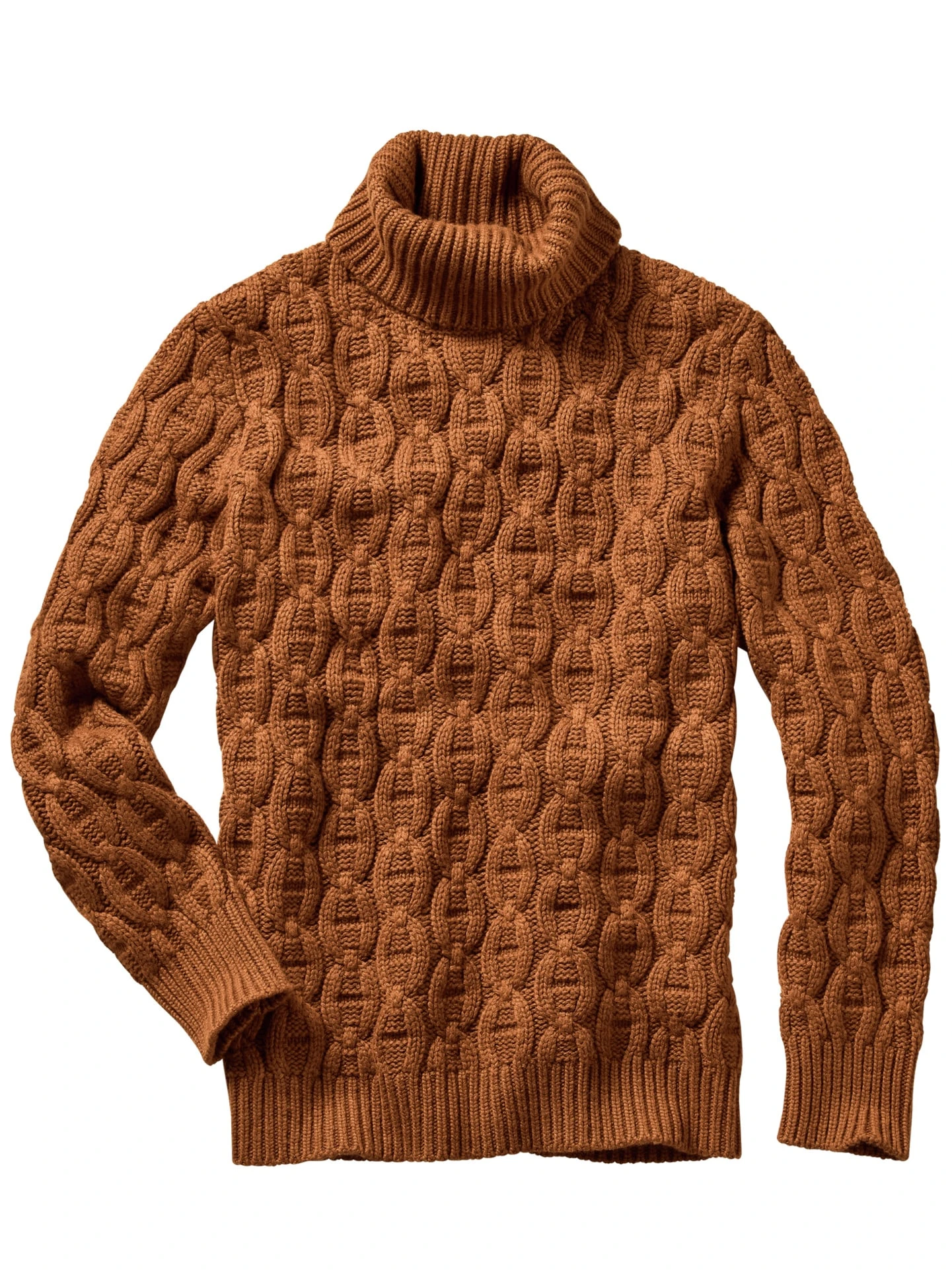 Pullover gewordenes Seemannsgarn. Sein Kettenmuster ist eines der typischen Aran-Muster, das an Seile und Netze erinnert. Von Menschen entwickelt, die vom Meer lebten und vom oftmals gefährlichen Lebensalltag erzählten. Heute wird der kernige Rollkragen noch immer in Irland gestrickt, aus viel Viskose, damit über die Jahre die Ketten in Reih und Glied liegen, wärmender Wolle, luxuriösem Kaschmir und einem ausreichenden Anteil Nylon, der dem Material die nötige Flexibilität gibt. Die Farbe? Glasiertes Ingwer, unkompliziert, angesagt und kompatibel zu Jeans oder Cargopants.