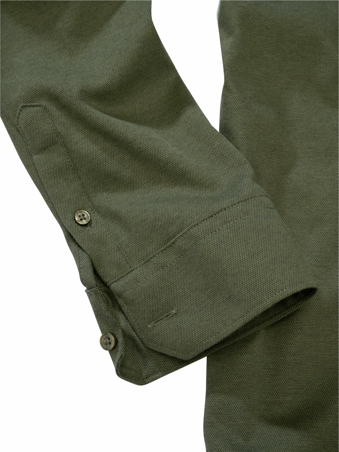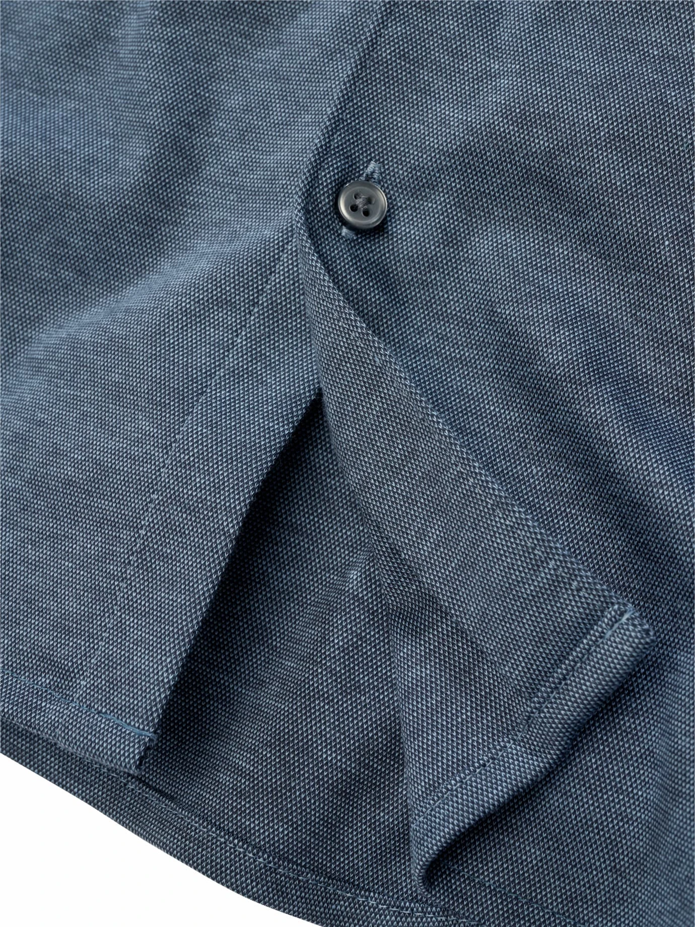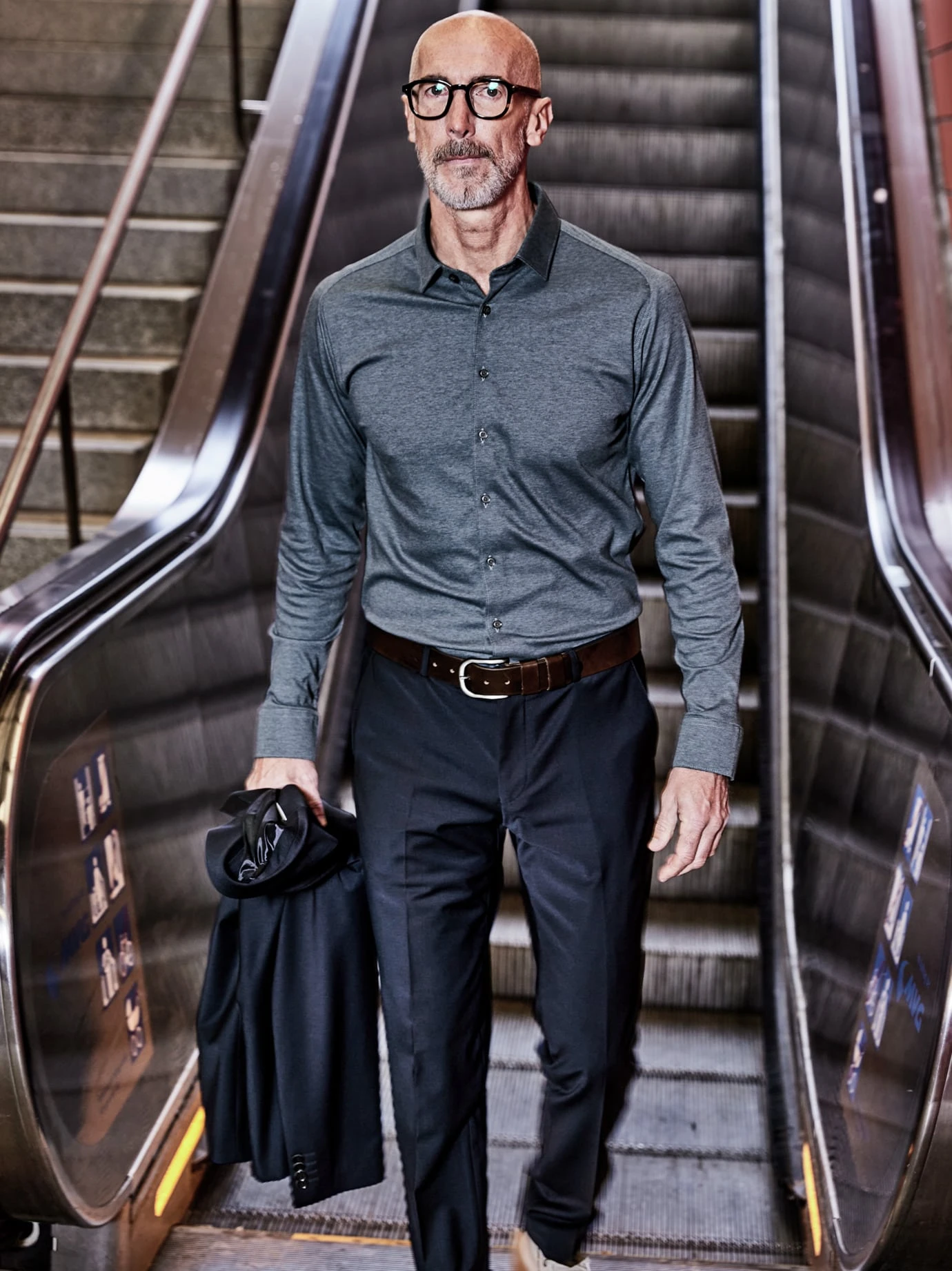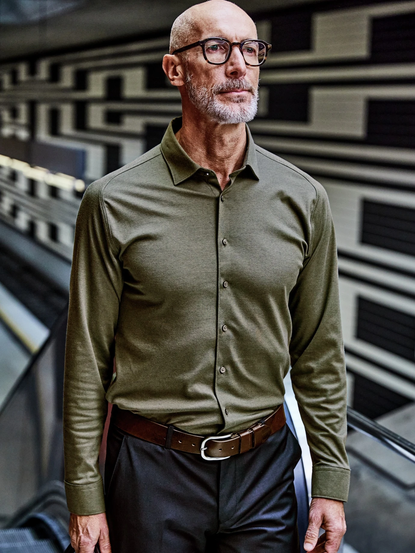 Businesshemd neu gedacht. Die oberfränkische Hemdenmanufaktur Desoto hat ein Hemd entwickelt, das sich trägt wie ein T-Shirt, optisch einem korrekten Businesshemd jedoch in nichts nachsteht. Der Stoff ist ein weicher Jersey aus Öko-Tex-zertifizierter supergekämmter Baumwolle – elastisch, besonders glatt und angenehm auf der Haut. Der Schnitt ist schlank und sieht richtig gut aus – der Raglanärmel sorgt für Bewegungsfreiraum. Für Termine mit dunkler Chino (Hemd in der Hose), ansonsten gern auch über der Hose (Länge und abgerundeter Saum sind für beide Tragevarianten entworfen).