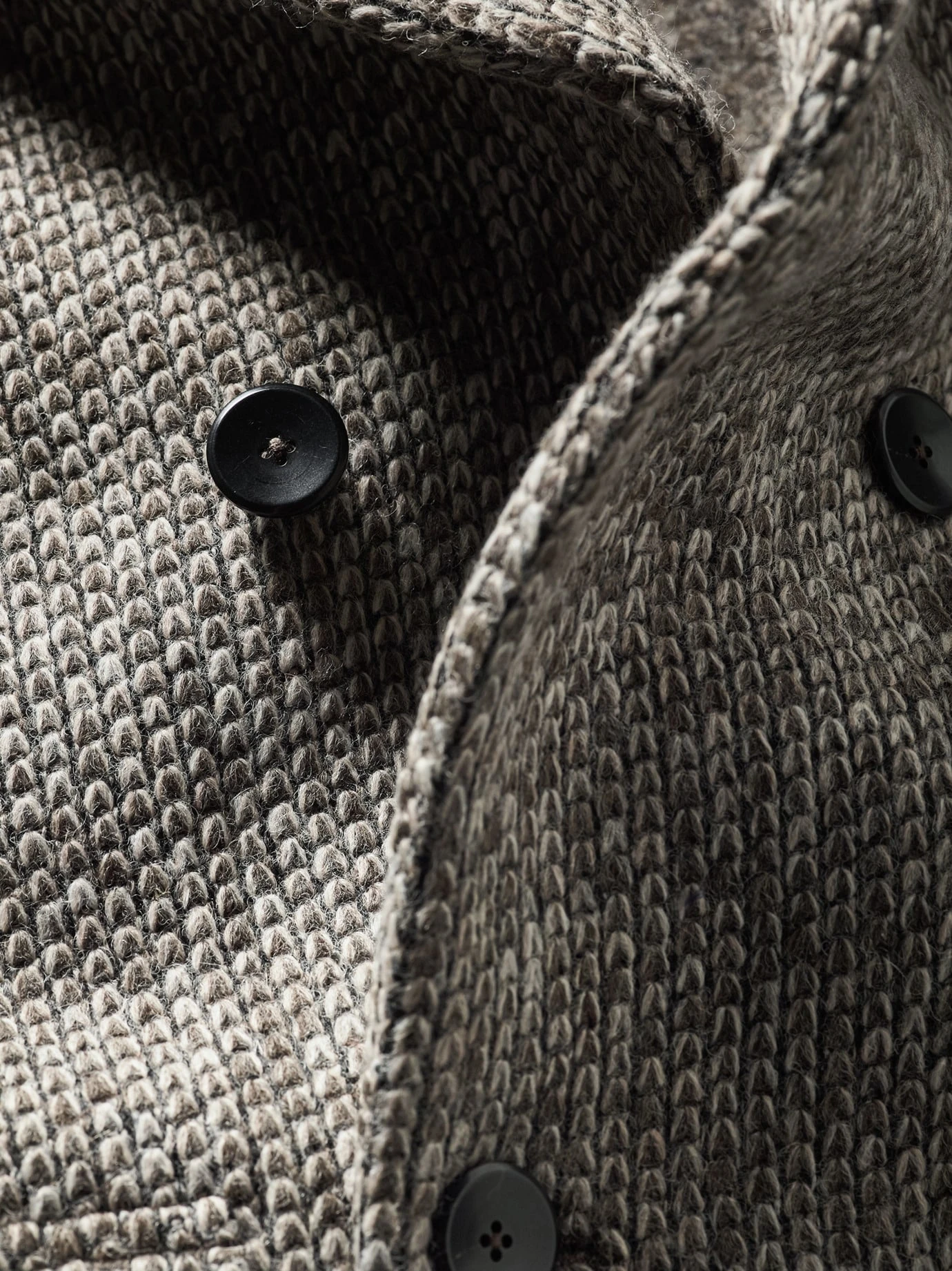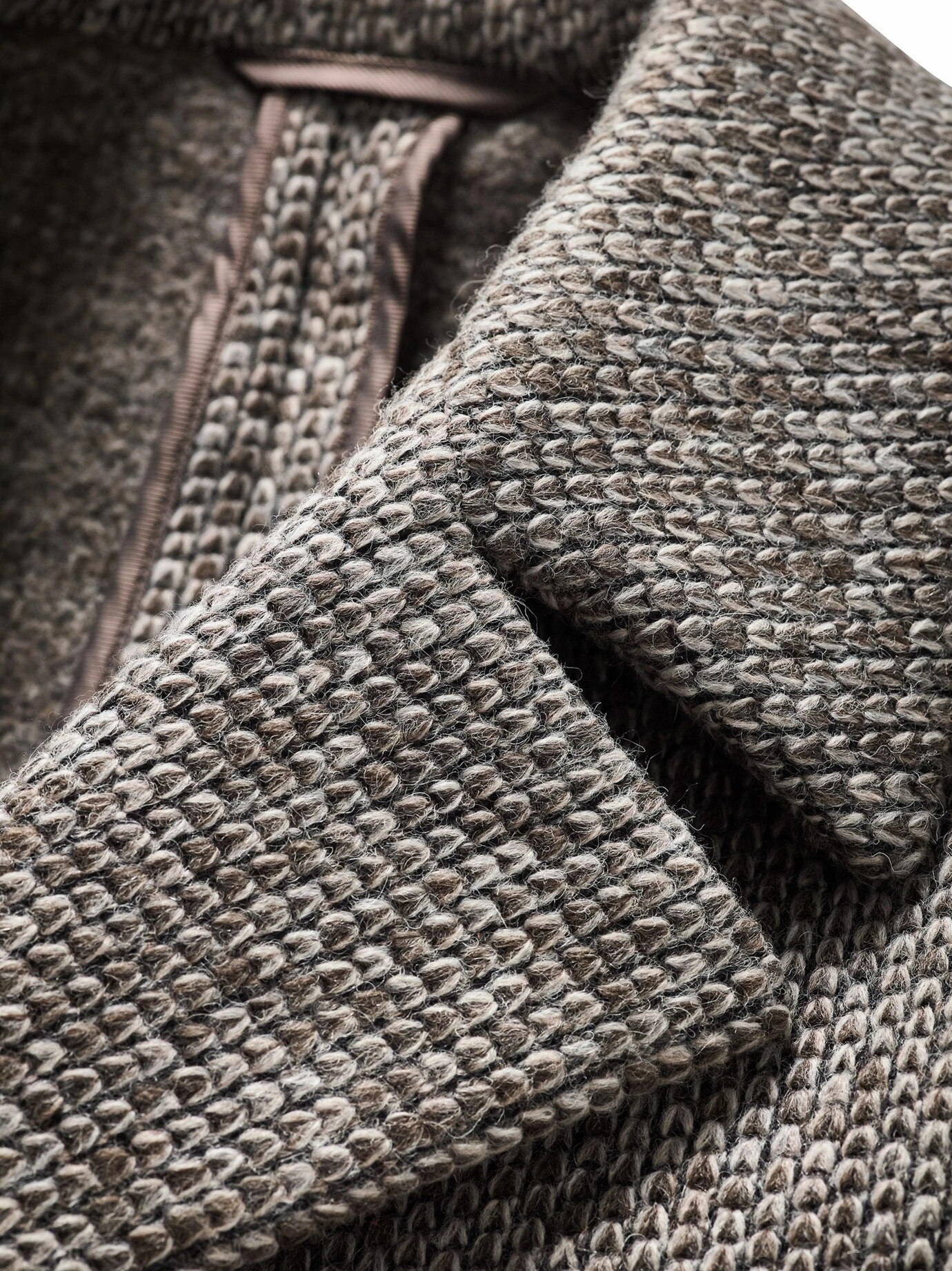 Betritt Neuland. Italienisches Design garantiert Stil. Dass speziell dieser Mantel, angelehnt an den klassischen Paletot (knielang, körpernah, tailliert), mehr kann als nur gut auszusehen, liegt einem findigen Kreator am Herzen – sollte er doch sein Gefährte auf einer Kanadareise werden. Sprich gut gerüstet für wetterbedingte Unwägbarkeiten und unbedingt wärmend. Letzteres ist das Steckenpferd der großzügig verarbeiteten, hochwertigen Schurwolle: Dank ihrer gestrickten Oberfläche speichert sie optimal Wärme und liegt hier ungefüttert direkt auf dem Körper auf, während das glatte Ärmelfutter das Hineinschlüpfen erleichtert. Echt italienisch (und funktional dazu): der Strukturstoff und der großzügige Reverskragen. Edel mit doppelter Knopfleiste.