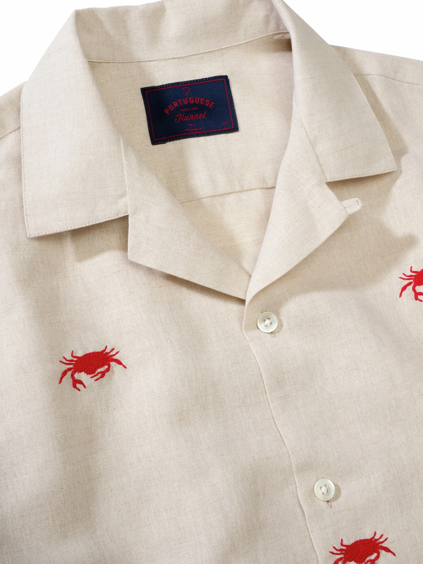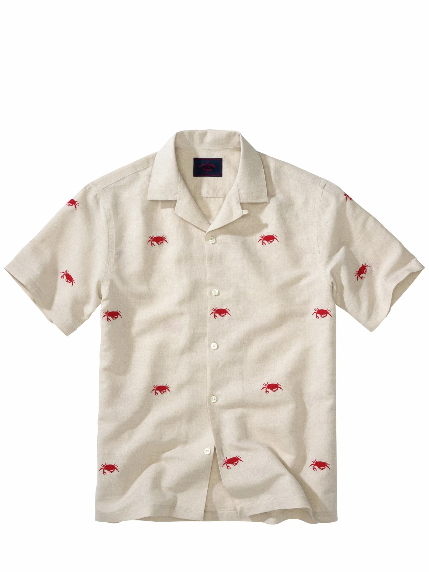 Portugiesischer Eigensinn. Keine Blumen, keine Palmen – Krabben zieren das naturfarbene Hemd. Klar, was auch sonst? Jeder einzelne Nadelstich wird in Krabbenrot hierfür säuberlich gesetzt, das bedarf Zeit und Ruhe. Ans Werk gehen dafür Meisterhandwerker, die die Hemden in Nordportugal mit exklusiven Stoffen traditionell fertigen. Steht ja in der Philosophie des Familienunternehmens Portuguese Flannel: „Die Marke folgt nicht den Trends oder der Mode des Augenblicks.“ Macht sie auch sonst nicht. Kombinieren Sie es mit bunten Shorts und genießen Sie den Sommer mit einem beeindruckenden Style von der Atlantikküste.