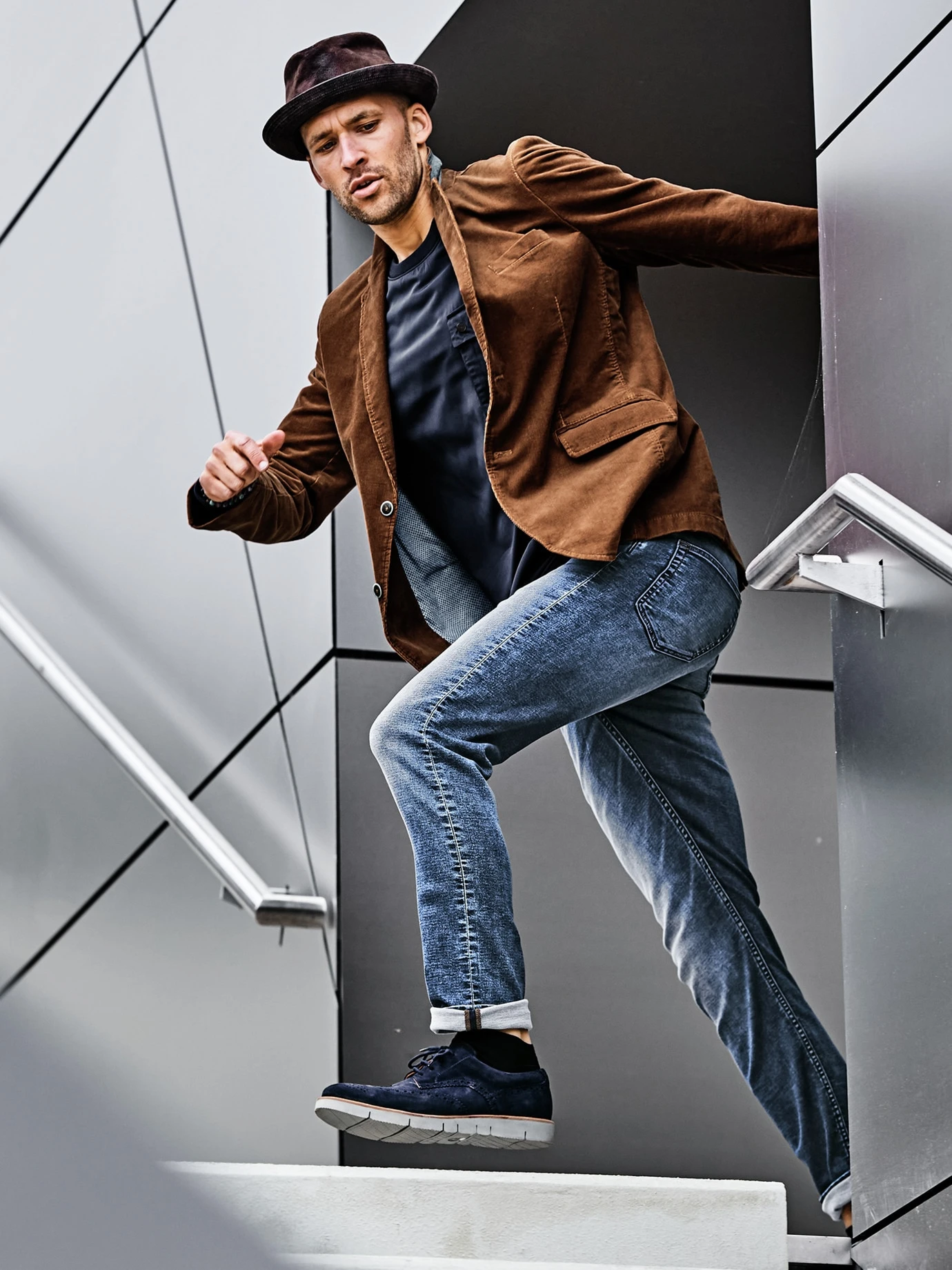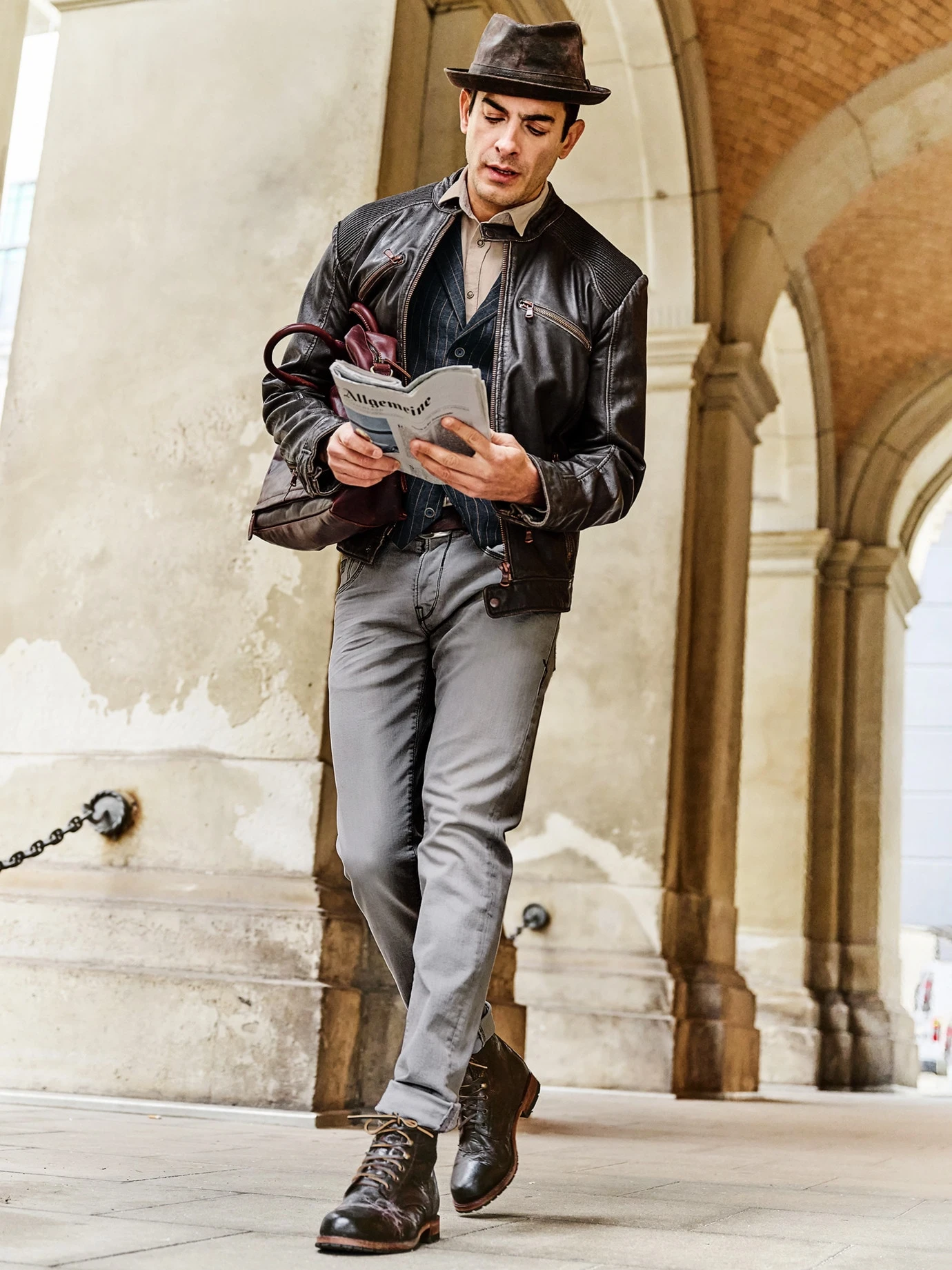 Schwer zu finden: ein Trilby aus Leder. Sein gefettetes Veloursleder gibt ihm optisch ein Leben mit, das er noch führen möchte, und macht ihn unempfindlich gegen Schmutz und Schmuddelwetter. Wird mit jedem Griff und jedem Tragen etwas speckiger – und damit einfach schöner. Er lässt sich knautschen, ohne seine Form zu verlieren, und das braune Leder passt zu allem, was cool ist oder macht es dazu. Mit kopfangenehmer Baumwolle gefüttert. Gemacht in alter Hutmachermanier.