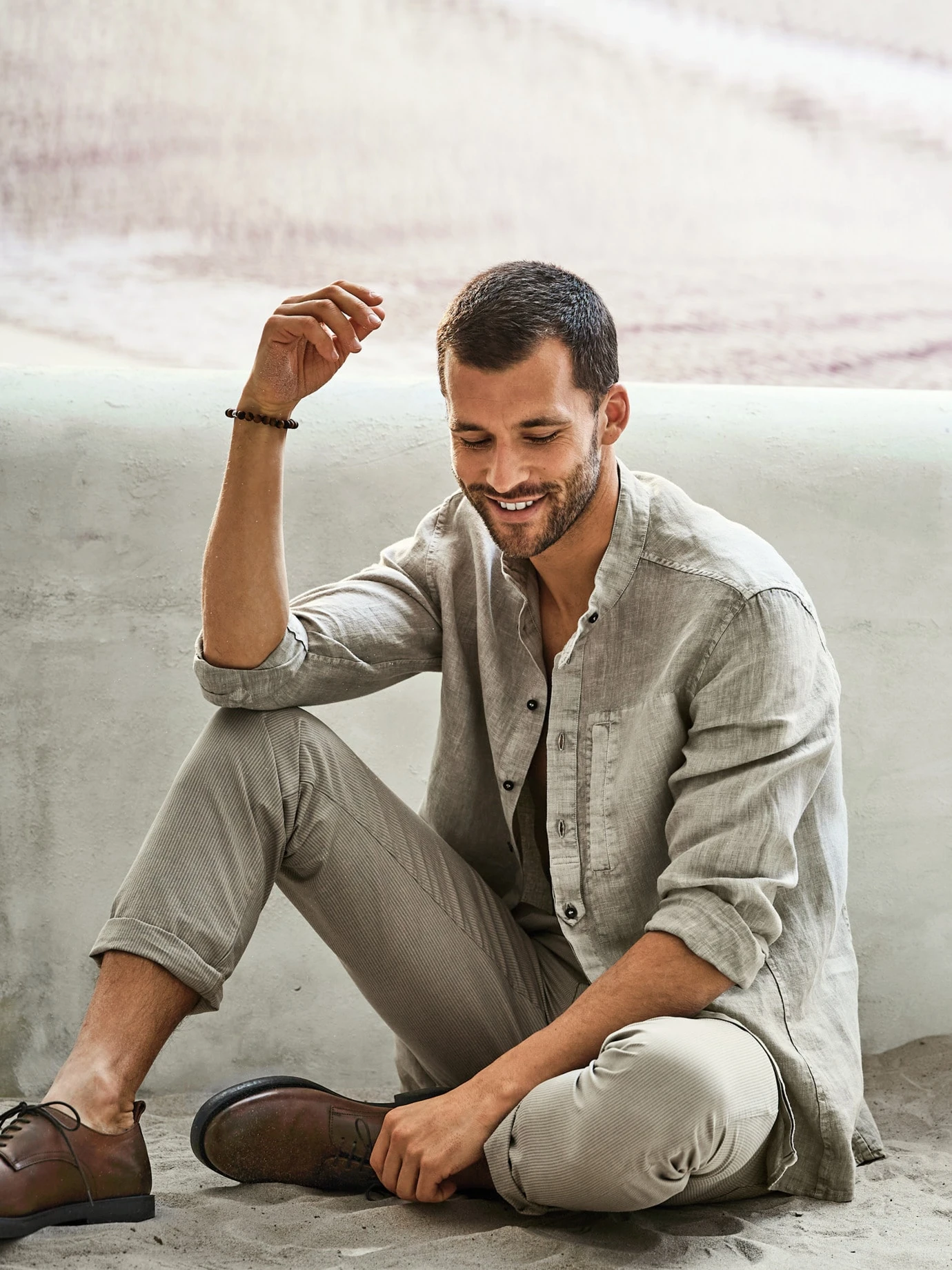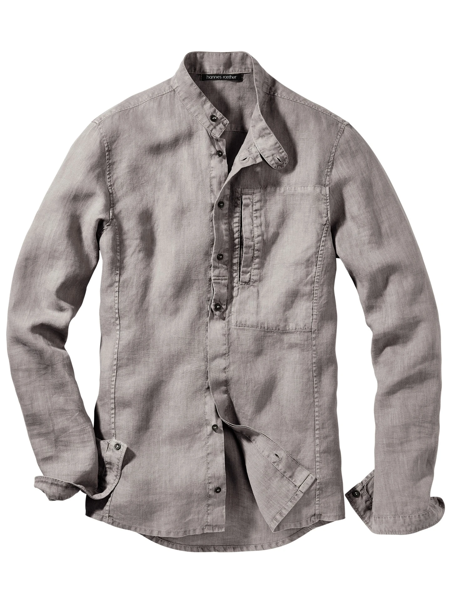 Leinenhemd mit Arbeiterästhetik. In diesem Shirt hat hannes roether gekonnt die Ursprünge des einstigen Arbeiterhemdes verarbeitet. Naturbelassene, dreckige Farbe, lässige, gewaschene Optik mit sanft kräuselnden Nähten und gelebten, typischen Leinenknittern. Das Material: luftig, unempfindlich, trockener Griff. Dazu ein mehr als unübliches und deshalb so gutes Design: Stehkragen mit Riegel, seitliche Brusttasche, halb verdeckte Knopfleiste (hat etwas von einem Henley-Shirt).