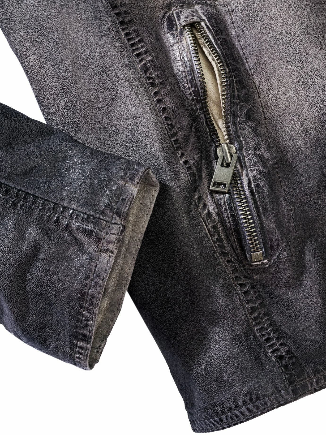 Weiches Lammnappa mit der Attitüde echten Lebens. Den Look erhält die fertig genähte Jacke durch eine Spezialfärbung – genau das Richtige für alle Fans des kernigen Biker-Stils, die sich sonst sattgesehen haben am typischen Uni-Ton klassischer Lederjacken. Passend dazu: die fetten Metallreißverschlüsse, der Druckknopf am Kragen, die solide Rückensteppung und die kernigen Nähte dort, wo sonst echte Protektoren sitzen. Stilecht in Grau-Grau-Kombinationen oder mit enger Jeans und derben Boots.