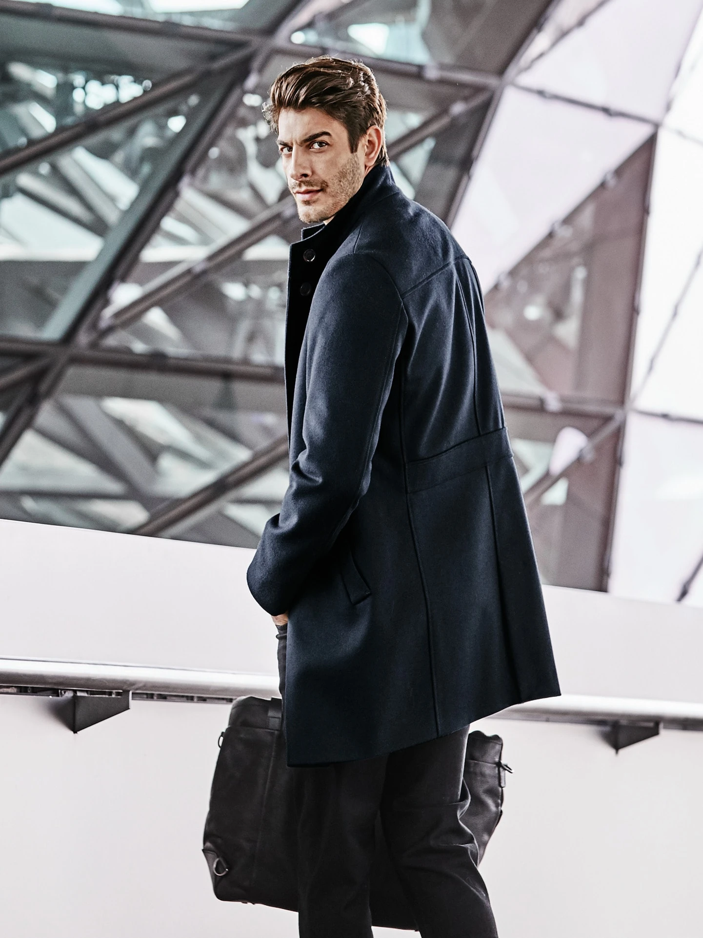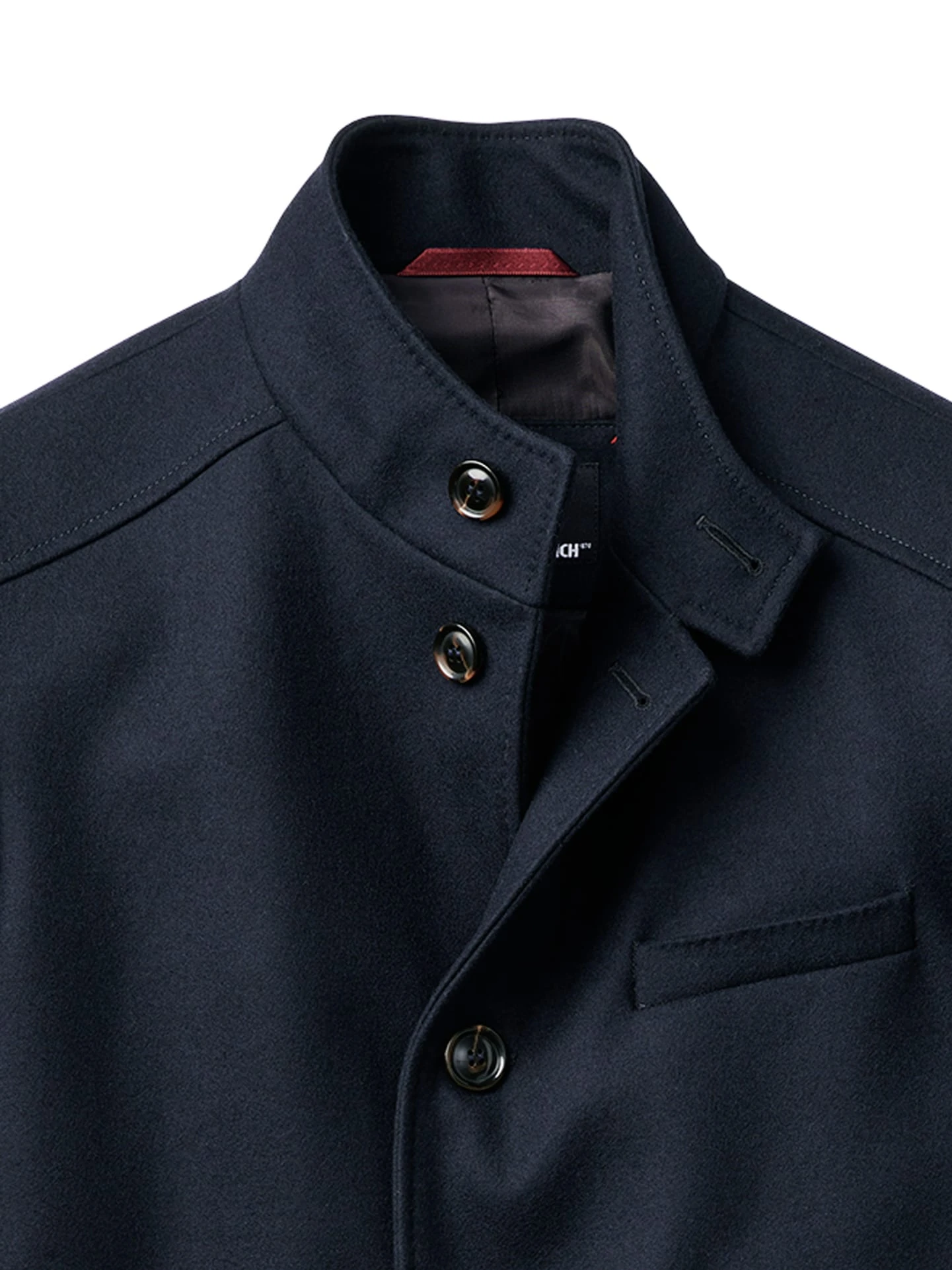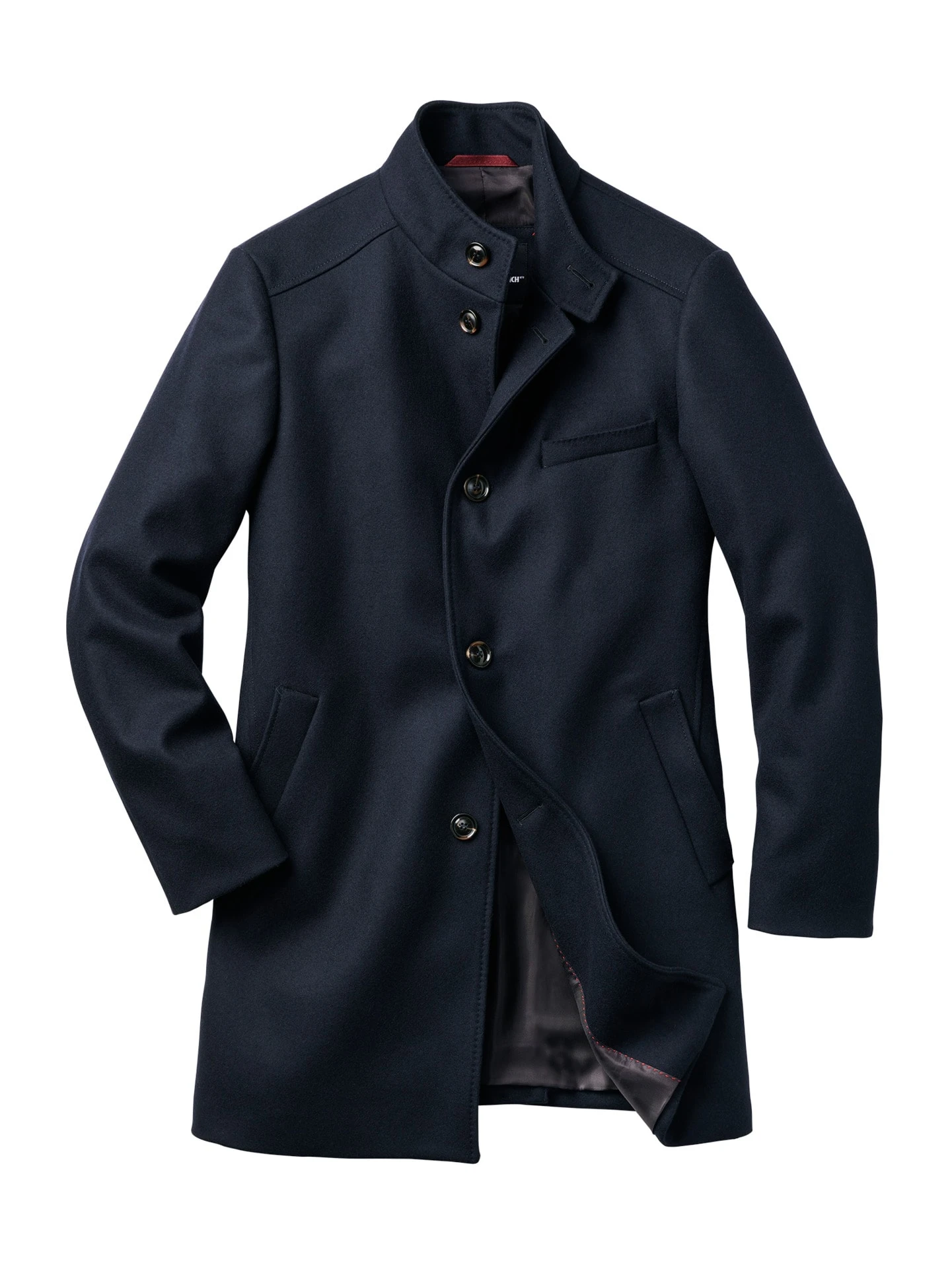 Wenn Sie nur einen Mantel wollen, dann empfehlen wir diesen. Weil er zu vielen Anlässen und vielen Farben (auch zu Schwarz) passt und auch in fünf Jahren noch stilistisch die richtige Wahl ist. Sein klassisches Manteltuch aus hochwertiger Schurwolle ist wärmend, durch die Polyamide robust und dank der 10 % Kaschmir fühlbar fein und sichtbar wertvoll. Er ist wasserabweisend, sein exakt 6 cm hoher Stehkragen schützt bei Wind, kann bei Windstille aber auch heruntergeklappt werden. Er hat die richtige, pobedeckende Länge, unter der Sie auch ein Sakko tragen können (89 cm in Gr. 50). Die Ansicht von hinten wird geprägt durch den 5 cm breiten Riegel, der ohne auffällig und kurzlebig zu sein, den Mantel besonders macht.