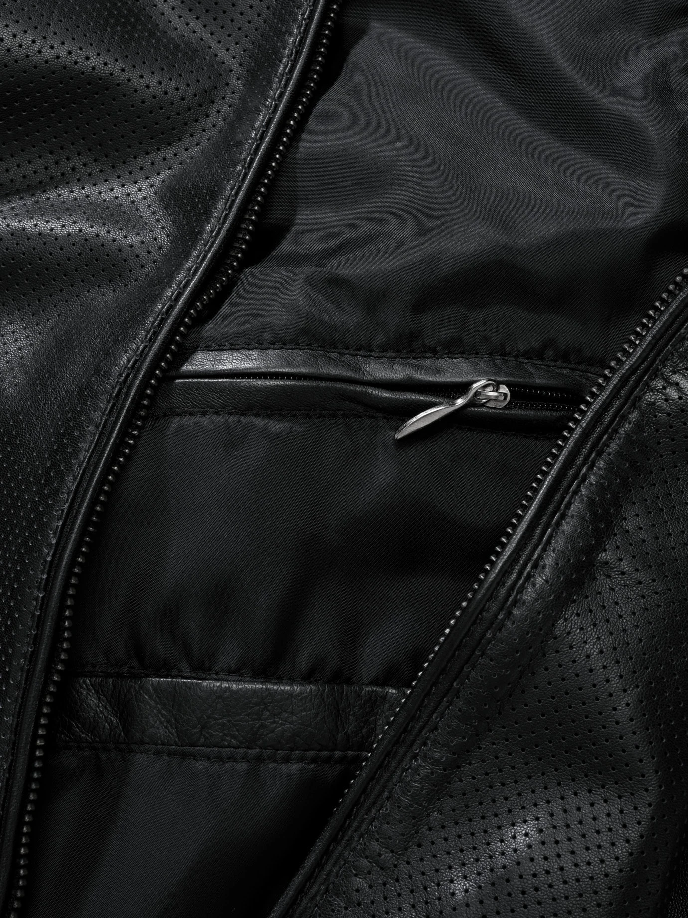 Baut auf Luft und Leder. Wie das Lochblech bei Industriebauten und Museen prägt die Perforation das Gesicht der Lederjacke. Die Kunst: Die Lochung so hinzubekommen, dass sich die Hitze an warmen Tagen in der dunklen Jacke nicht staut und sie dennoch genügend Stand hat. Zur luftigen Konstruktion passt das weiche, leichte Lammleder, das sich im Laufe vieler Sommer als erstaunlich robust erweist. Der lässige Blouson kann gut mit T-Shirt und Jeans, in die Mailänder Pinacoteca di Brera geht’s mit leichtem Hemd, Chino und geputzten Lederschuhen.