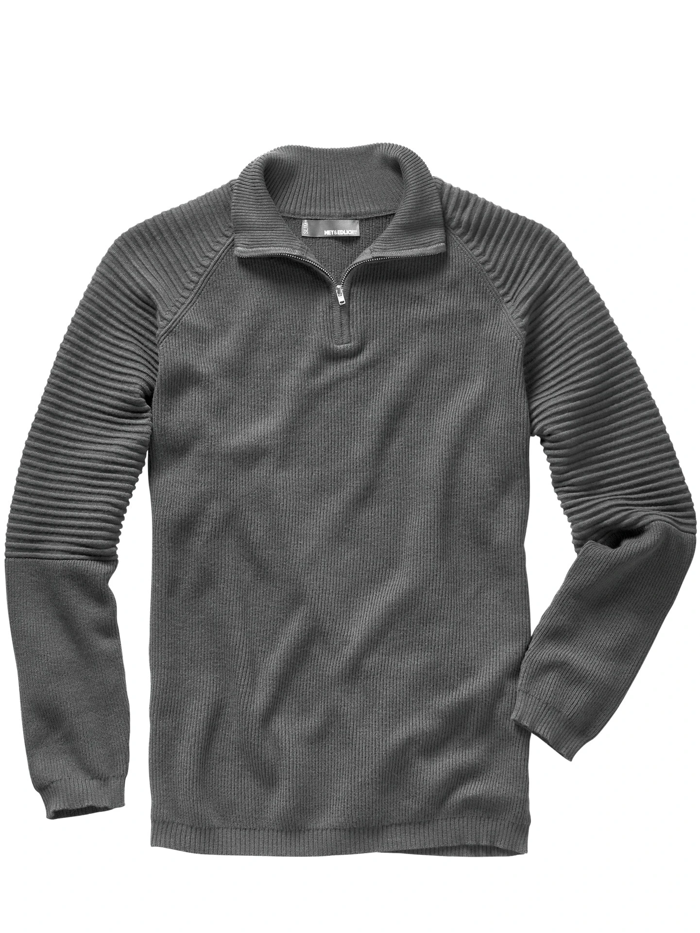 Den Sprung vom Fischerboot an Land hat der Troyer längst geschafft. Statt wie das Original aus kratziger Schurwolle ist er jetzt italienischer durch eine Mischung aus viel atmungsaktiver Baumwolle, für den richtigen Anteil Wärme sorgt ein Schuss Wolle. Der hohe Kragen samt Zipper ist eine Art Klimakontrolle: geöffnet für drinnen, geschlossen für draußen, besonders, wenn der Wind auffrischt. Die Raglanärmel im Protektorenstil sorgen für durchtrainierte Schultern. Am liebsten derb kombinieren: mit Jeans oder Chino, Hemd oder T-Shirt, Boot oder rahmengenähtem Schuh.
