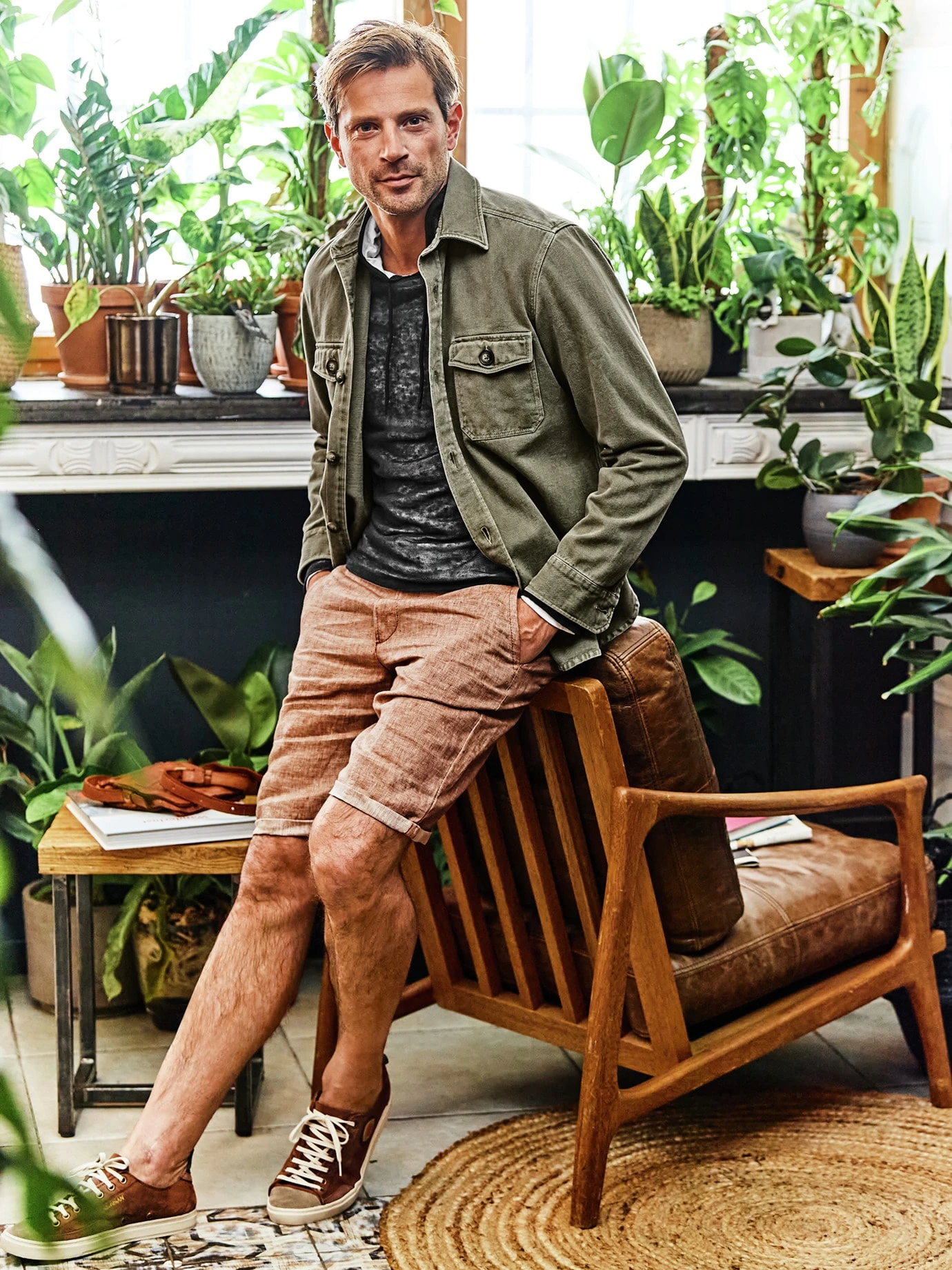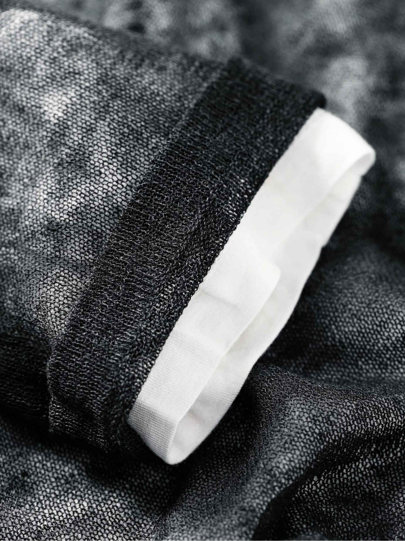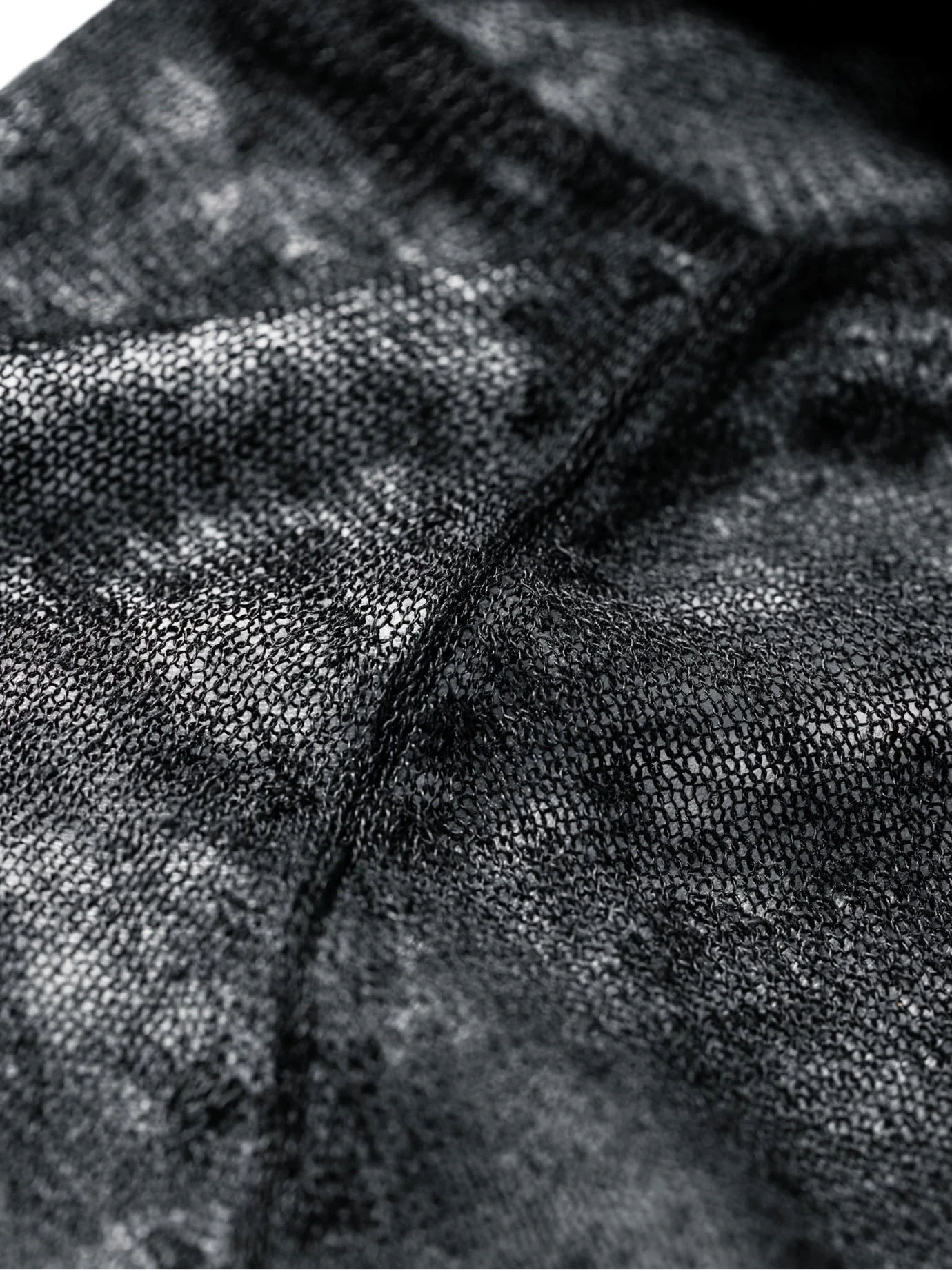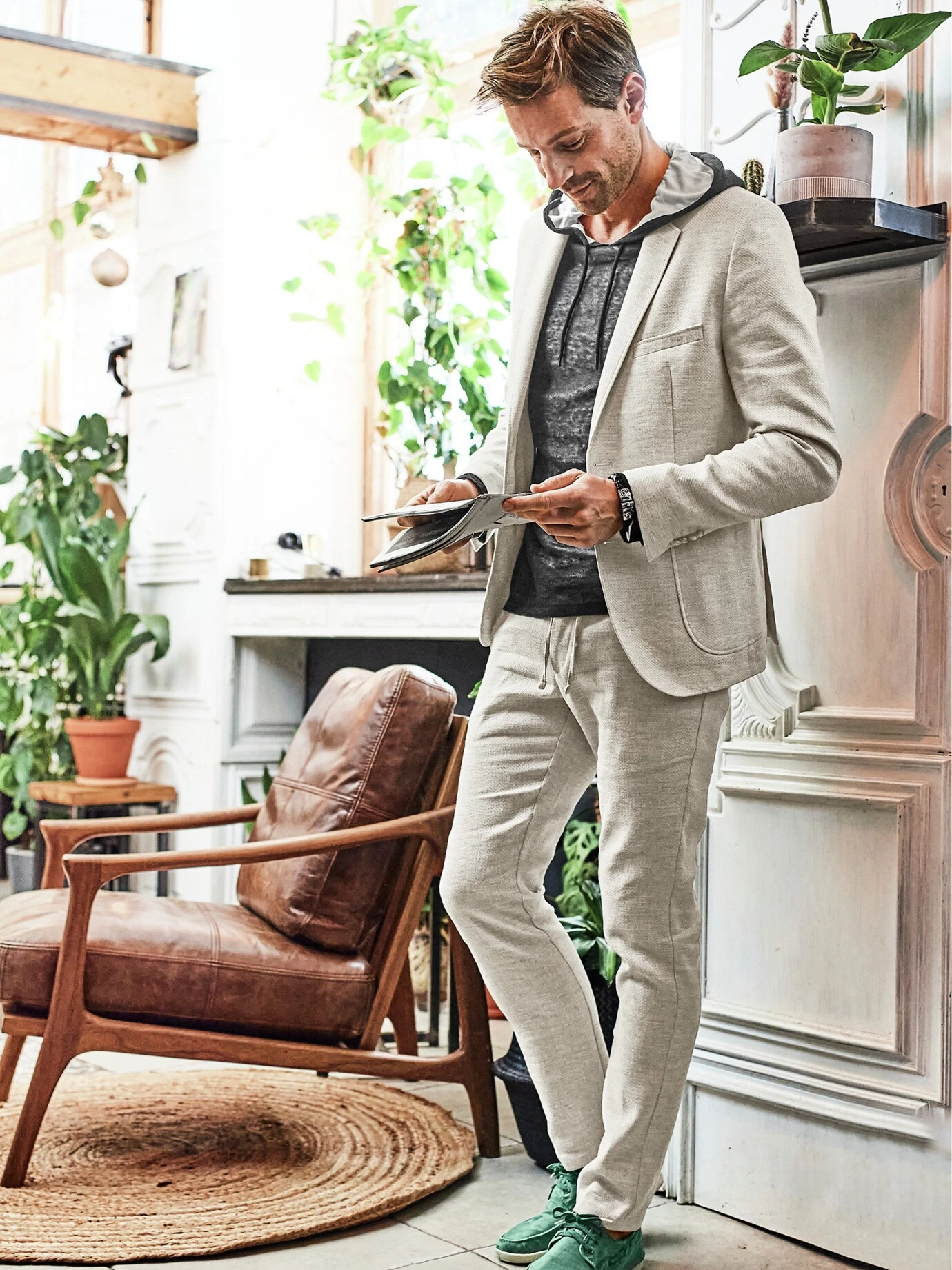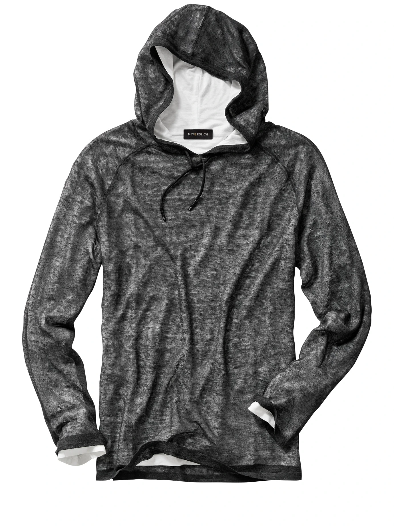 Eine gute Geschichte hat zwei Seiten. Wie dieser Hoodie: Außen kühlt bei Hitze locker gestricktes Leinen, der technische Anteil lässt ihn in seine Form zurückkehren. Innen dann reine Viskose – so wie Sie es sonst nur von teuren Anzügen kennen, hier macht es den Hoodie dehnbar. Beides punktuell miteinander verbunden ergibt ein Shirt, das auf bekannte Normen pfeift. Dazu passen die längeren Ärmel und nach Ihren Regeln eine Used-Jeans oder Shorts.