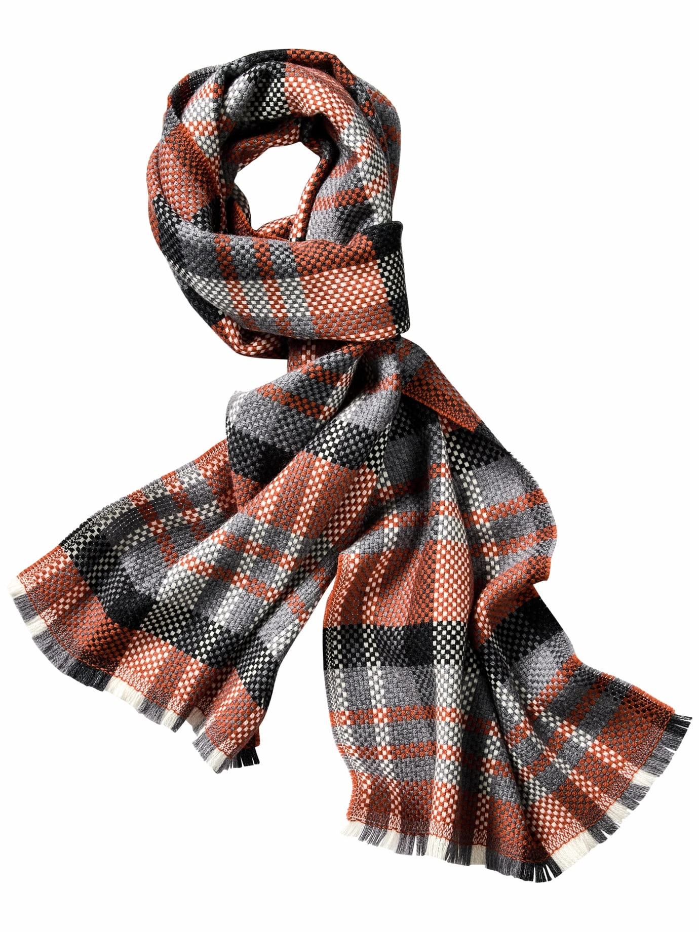 Karo Ass. Zu Denim matcht er sowieso, zu anderen Blautönen ebenfalls. Mit seinem Design peppt der Schal gedeckte Outfits auf und hält, dank der wärmenden Wolle, eisigen Wind ab. Seine Farben: leuchtend, aber nicht knallig. Sein Karo: schön plastisch dank erkennbarer Webstruktur. Diese läuft zu den Enden hin fransig aus – damit’s nicht zu perfekt wird.