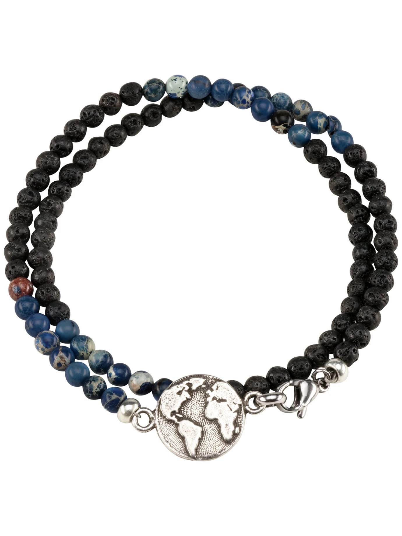 Für Reisende zu Wasser und zu Land: Das handgefertigte Wickelarmband der barcelonischen Schmuckkönner XXL Hardwear setzt mit Perlen aus wasserblauem Achat, schwarzem Vulkanstein und einem Edelstahl-Anhänger mit Erdball-Relief die Kraft der Elemente beeindruckend neu in Szene. Gemacht für Weltenbummler und solche, die es werden wollen.