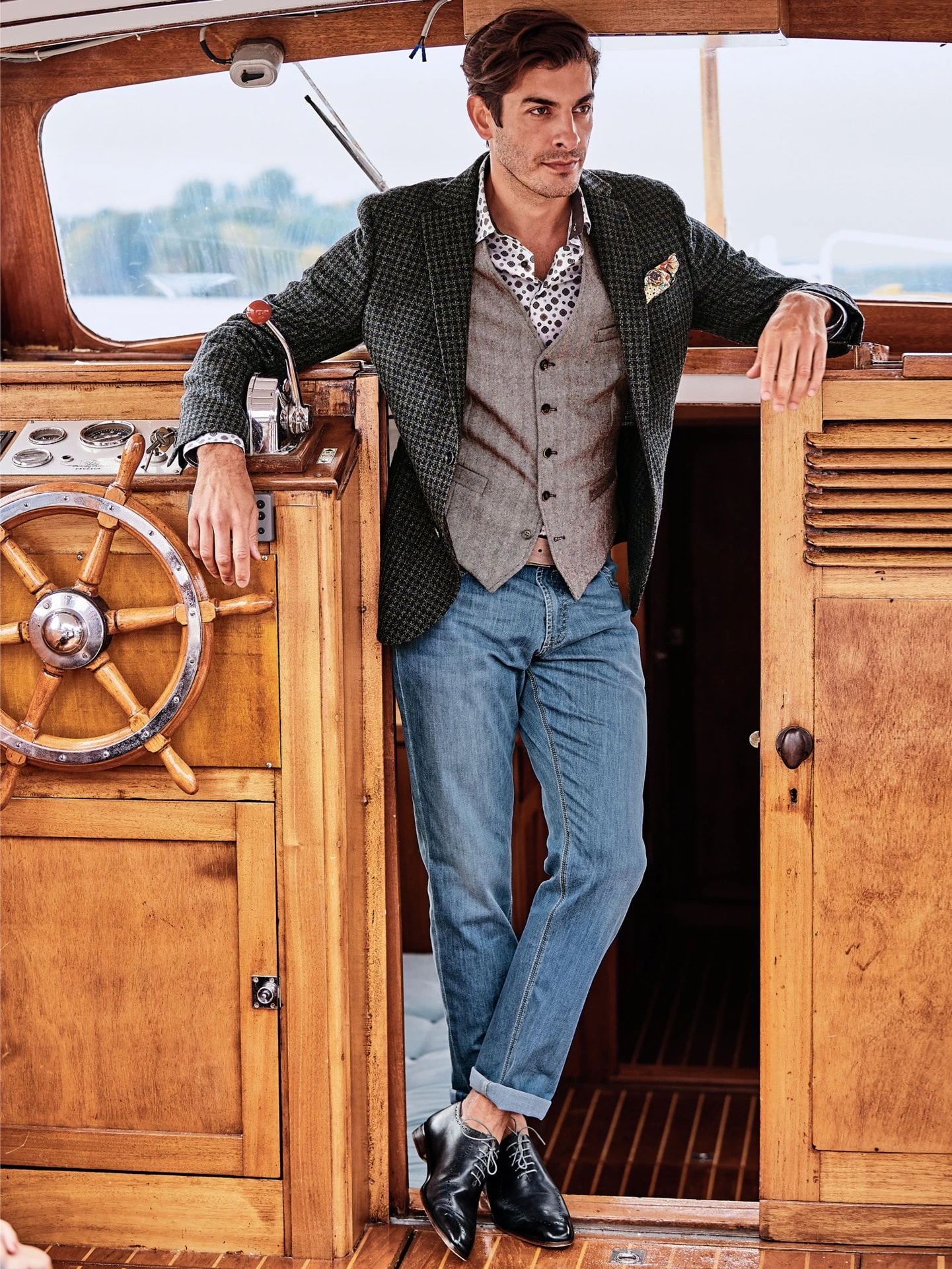 Ursprünglich gehörte die Weste verbindlich zum Anzug. Heute geht es auch ohne richtig gut, weil Weste plus weißes Hemd oder Shirt modisch total angesagt ist. Diese ist aus Wolle und feiner Seide, gewebt in Florenz, stilecht als kerniger Tweed mit den kleinen Noppen.