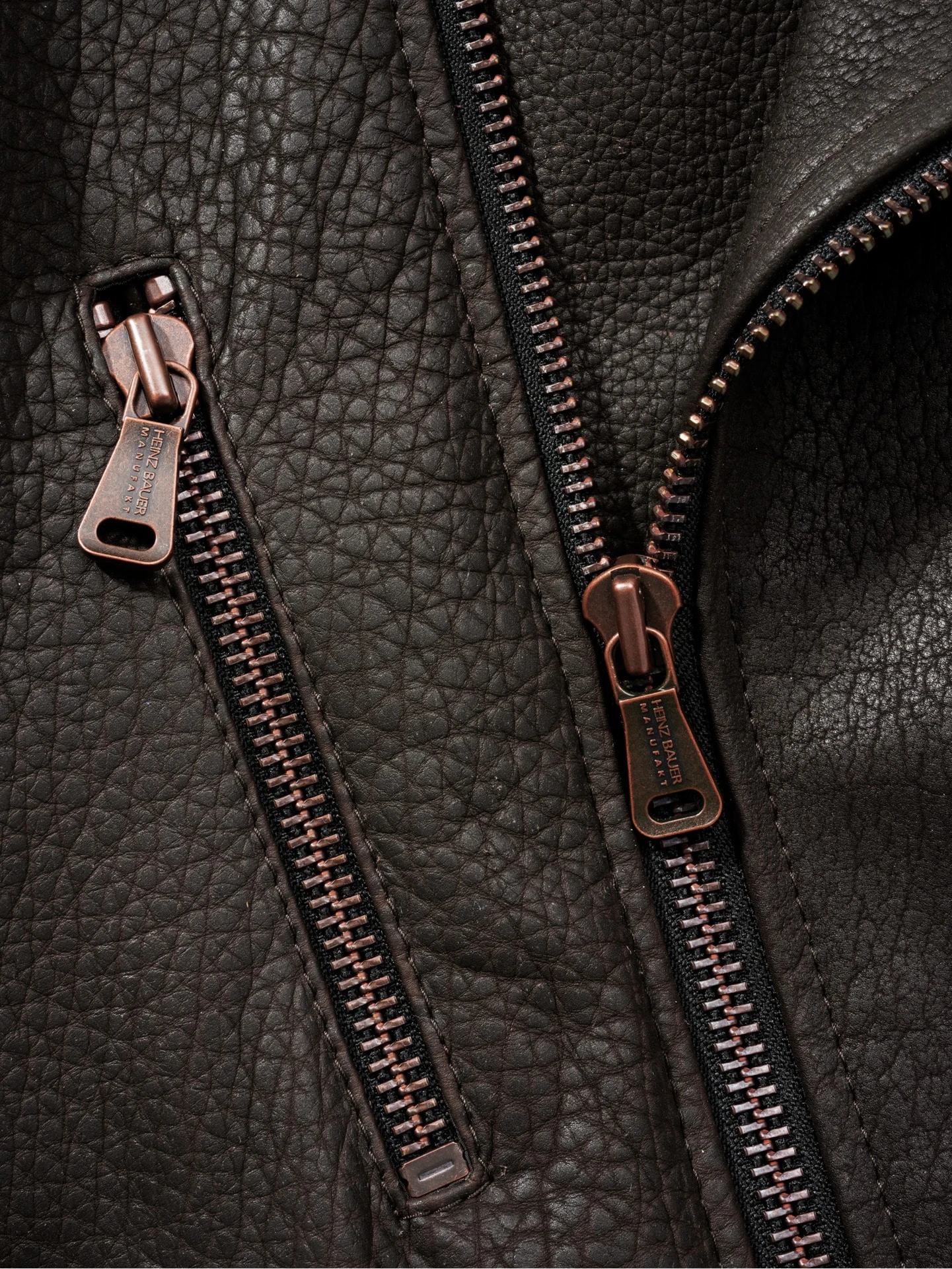 Verarbeitung: Knackig kurzer Bikerschnitt, diagonal verlaufende, kupferfarbene Reißverschlussleiste mit Sturmblende. Polsternde Nähte an Schultern und Ellenbogen, Stehkragen mit Druckknopf und Riegel. Veredelt mit Silberionen, die die Geruchsbildung eindämmen. Ein wahres Erbstück für nachfolgende Generationen. Vier Reißverschlusstaschen, zwei Innentaschen. Gewicht: 1,8 Kilo. Slim Fit.